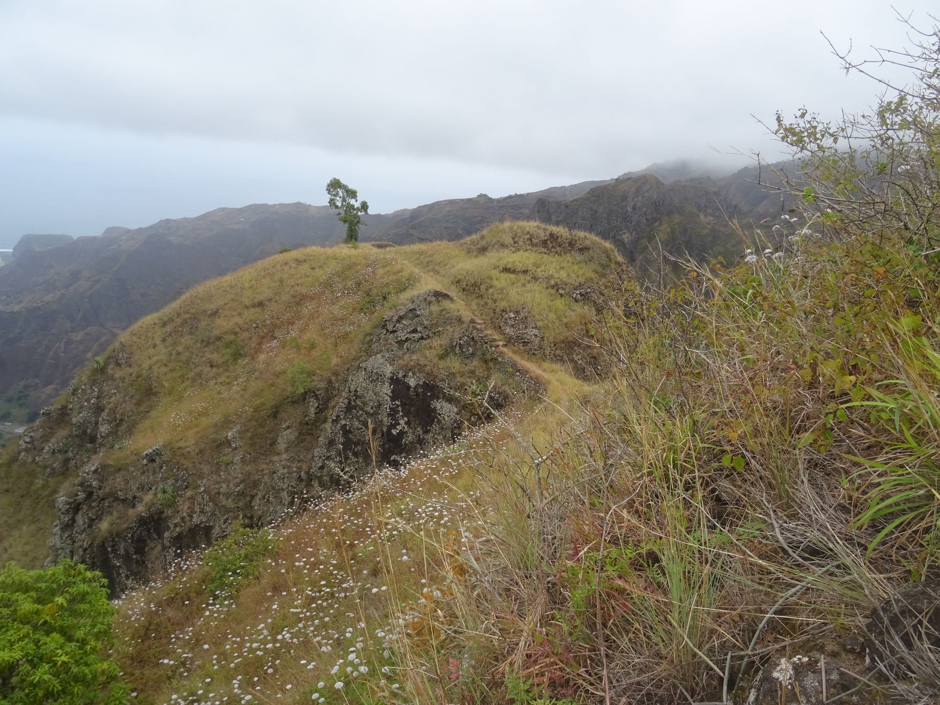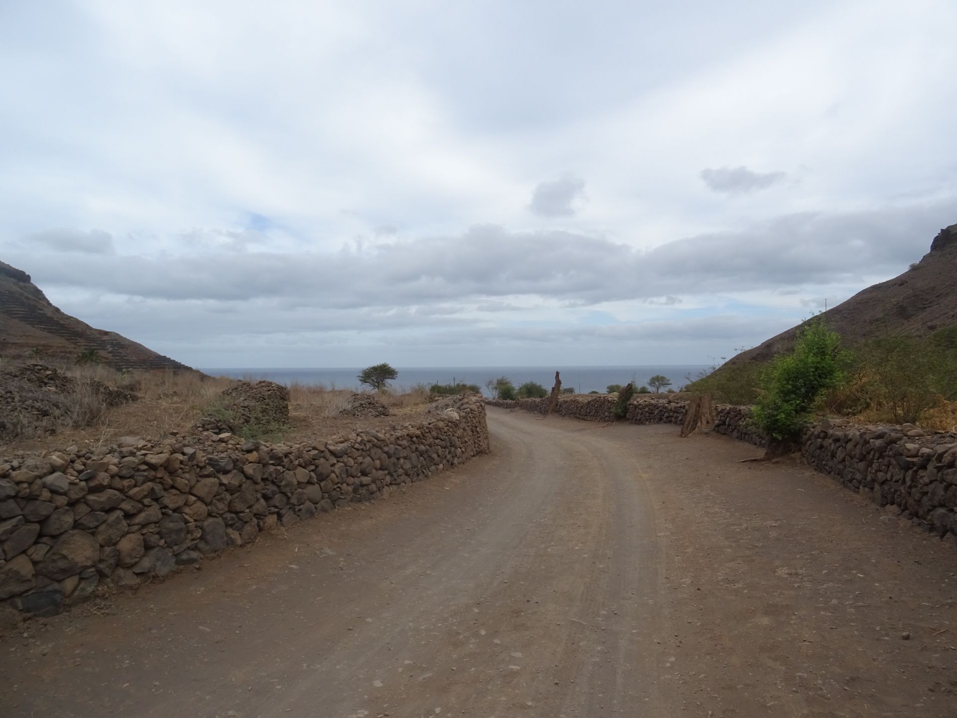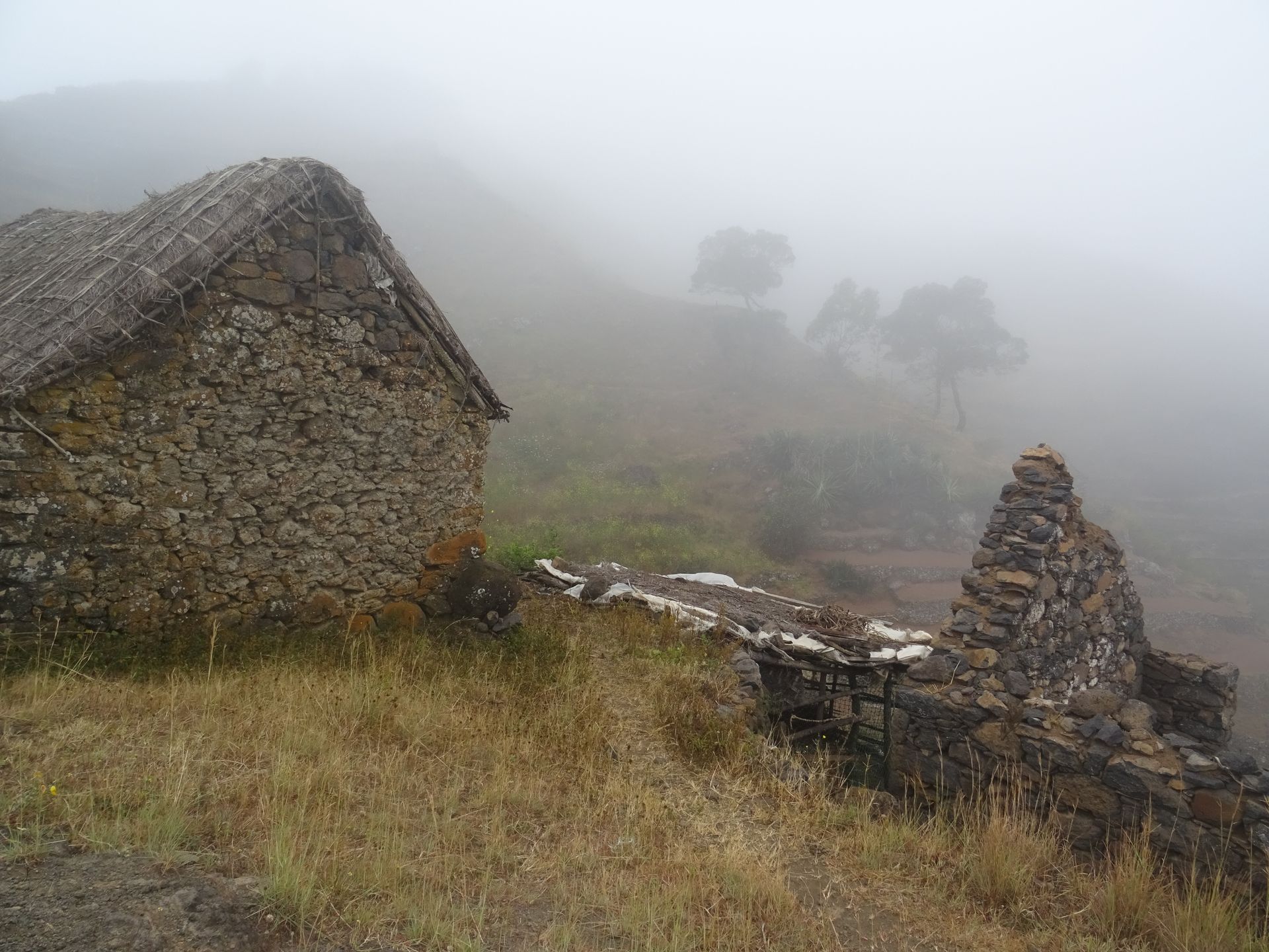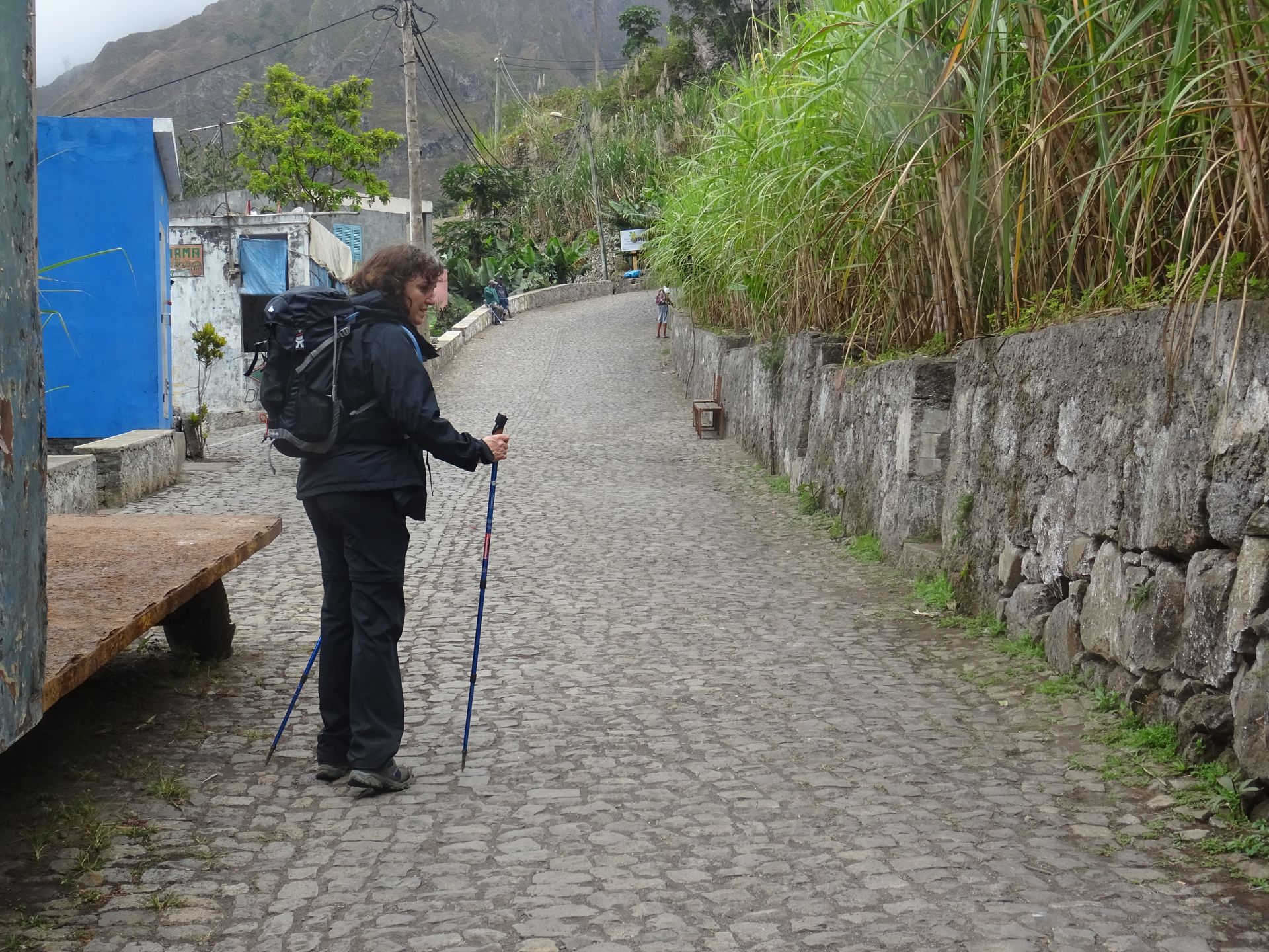Als wir um 10:20 Uhr endgültig aussteigen nieselt es leicht und wir holen gleich die Regenjacken aus den Rucksäcken. Mir kommt kurz in den Sinn, dass ich mich doch eigentlich für Cap Verde entschieden habe, weil ich mal wieder in Sonne und Wärme unterwegs sein wollte. Aber vermutlich ist es nur der Nebel, der uns gerade nass werden lässt, oder die Passatwolken. Der junge Mann vom „Haus am Weg“ erklärt uns sehr genau den Weg, den wir gehen müssen. Und da ich kein Portugiesisch spreche, tut er dies auf Französisch. Das kann ich auch nicht! Aber ich habe ja die GPX-Daten auf dem Handy, da werden wir schon dort ankommen, wo man uns erwartet.