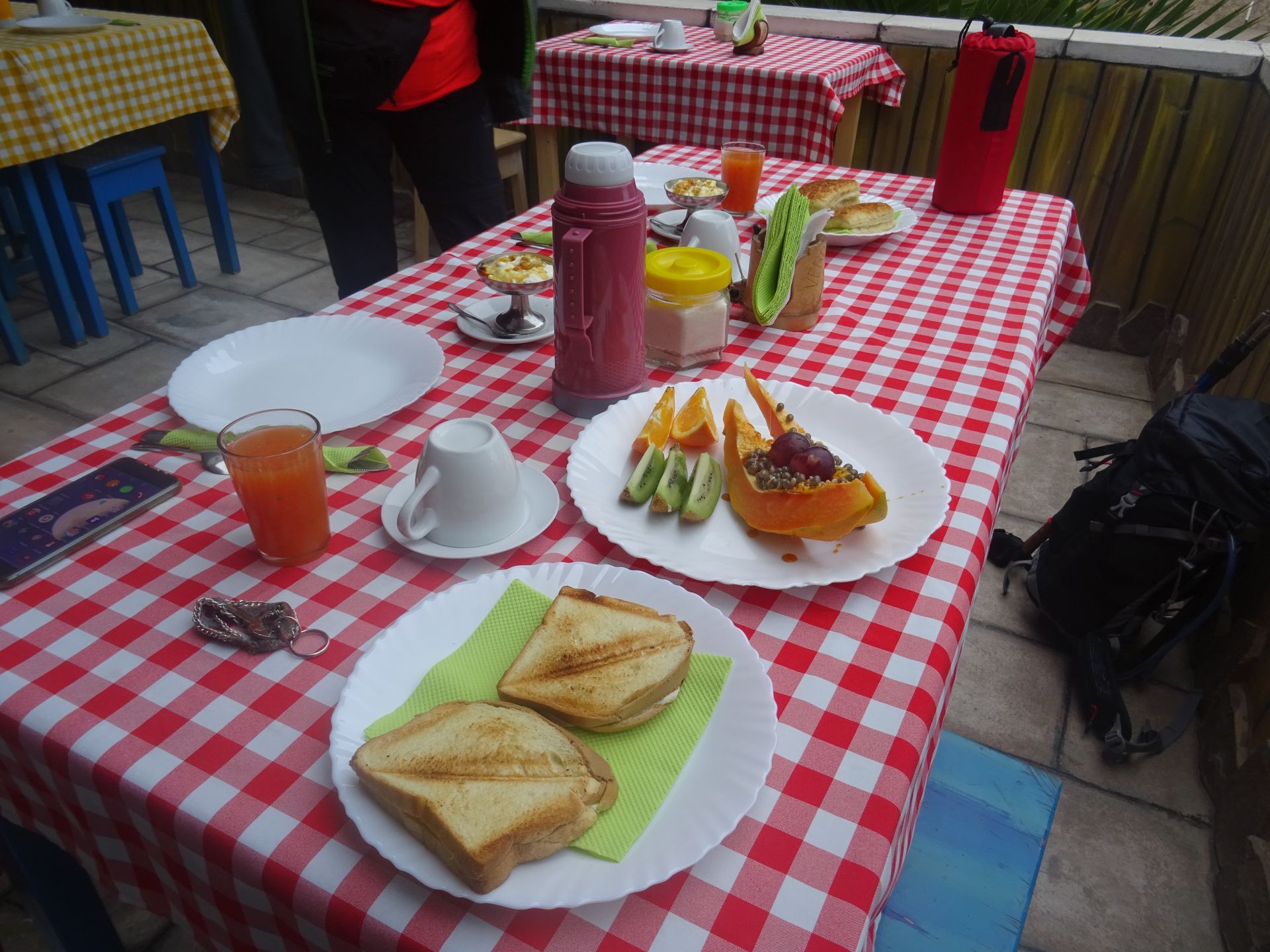 Ich erwache um 04:45 Uhr und mein erster Gedanke gilt Papa, der heute 80 geworden wäre. Übermorgen ist sein 21. Todestag. Durch ihn bin ich eigentlich aufs Wandern gekommen. Diese Tour hätte ihm sicher auch gefallen. Mit den Gedanken an ihn taste ich mich im ersten Grau der Morgendämmerung an der Wand entlang zur Toilette. Weiter hinten im Dorf brennt eine „Straßenlaterne“ und aus dem Tal sieht man Lichtpunkte den Berg heraufkommen. Der erste Esel schreit, noch bevor der erste Hahn kräht. Ich krieche noch einmal ins Bett und kuschle mich in die Wolldecke, die ich in der Nacht im Schrank gefunden habe. Es war empfindlich kalt und zudem haben wir die Muskeln gestern stark überbeansprucht. Um 06:30 Uhr klingelt der Wecker und bald darauf gibt’s Frühstück mit Omelette, Toast, Marmelade, Margarine, Kaffee und Milch. Keine Ahnung, ob die von den Esel:innen stammt oder von Ziegen. Wie Kuhmilch schmeckt sie jedenfalls nicht.