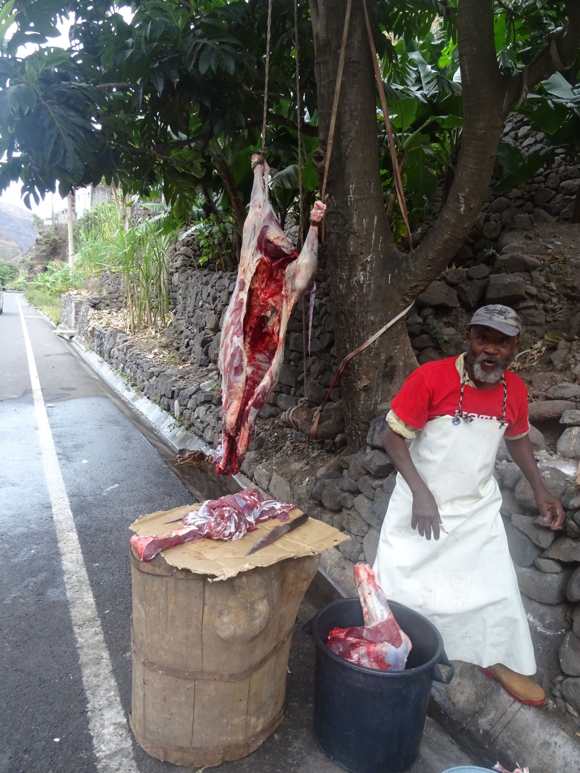 Wir fahren zunächst per Taxi in ein Tal weiter im Norden und steigen bei der Ortschaft Xôxô aus. Dort wird auf der Straße gerade ein Stier zerlegt, der offenbar kurz zuvor an Ort und Stelle geschlachtet wurde. Menschen kommen mit Schüsseln und Eimern die Straße herunter und holen Fleisch ab. Wir schauen ein Weilchen zu und laufen dann ein Stück an der Hauptstraße entlang, bis wir in einer Kehre auf einen Pfad abbiegen, der sofort steil nach oben führt. Als wir nach wenigen Minuten die Stelle unten im Tal sehen können, wo der Stier hing, ist von der Arbeit des Metzgers schon nichts mehr zu sehen.