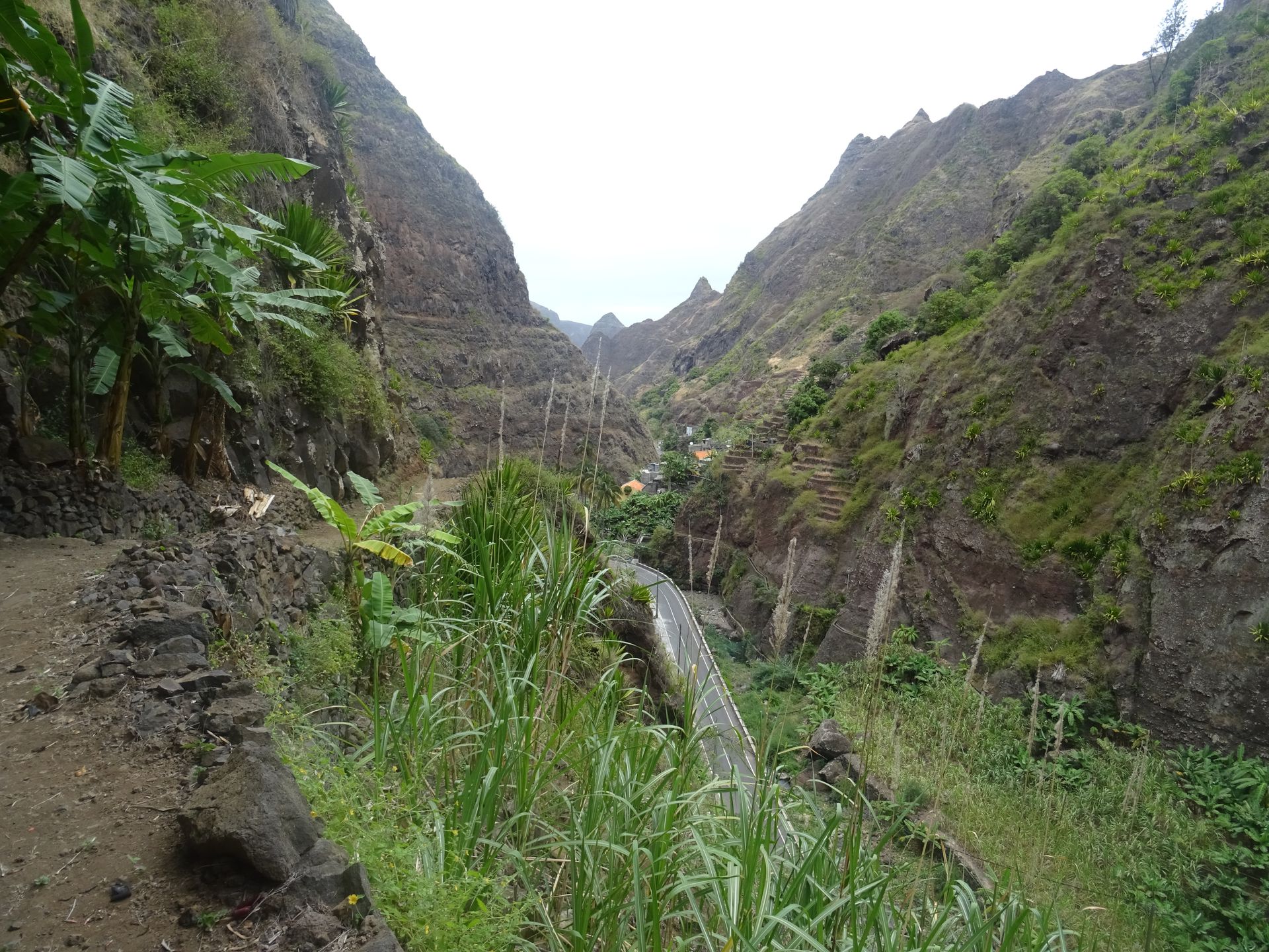 Die gepflasterte Straße windet sich hoch über der Küste in ständigem auf und ab die Berghänge entlang. Nach etwa einer halben Stunde hat man noch einmal einen schönen Rückblick auf Ponta do Sol und nur wenige Augenblicke später sieht man das Bergdorf Fontainhas wie ein Adlernest am gegenüberliegenden Berg kleben. Wer hier wohnt, muss schwindelfrei sein! Die Pflasterstraße verläuft nochmals abwärts in ein von Yamspflanzen überwuchertes Bachbett und steigt dann wieder an bis zur Schule von Fontainhas, wo der Weg in einen Pfad übergeht. Auf einem der verschlungenen Pfade finde ich meinen Weg zwischen den Häusern hindurch und verlasse das Dorf auf der anderen Seite wieder.