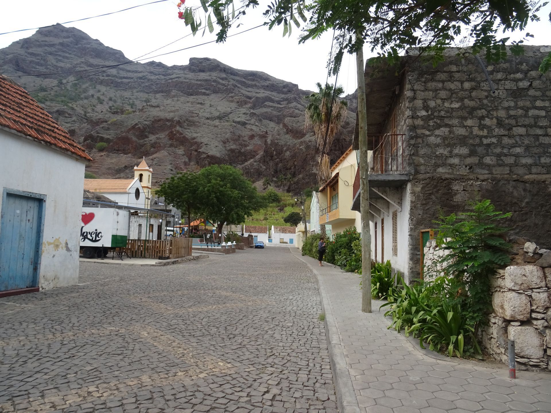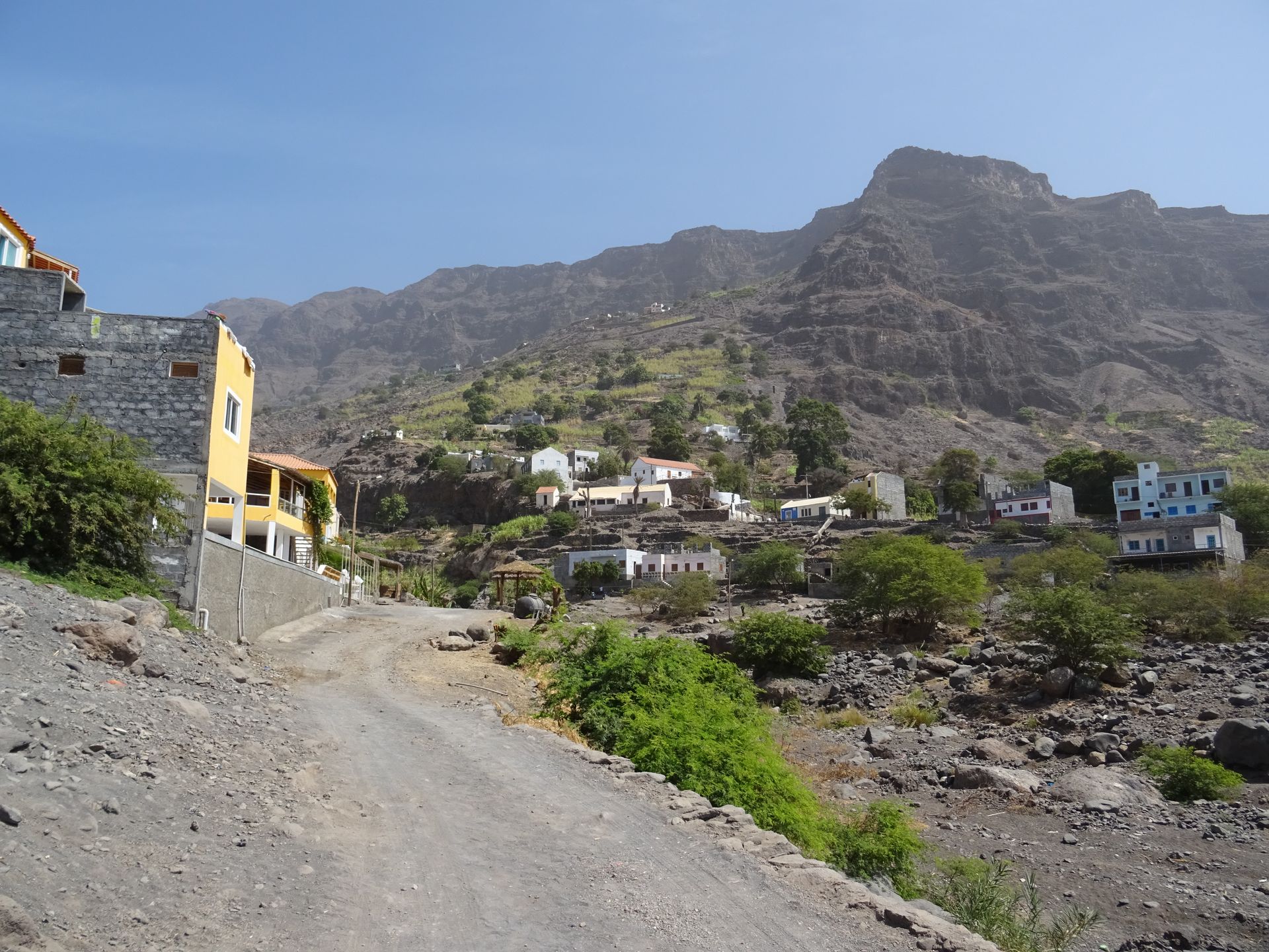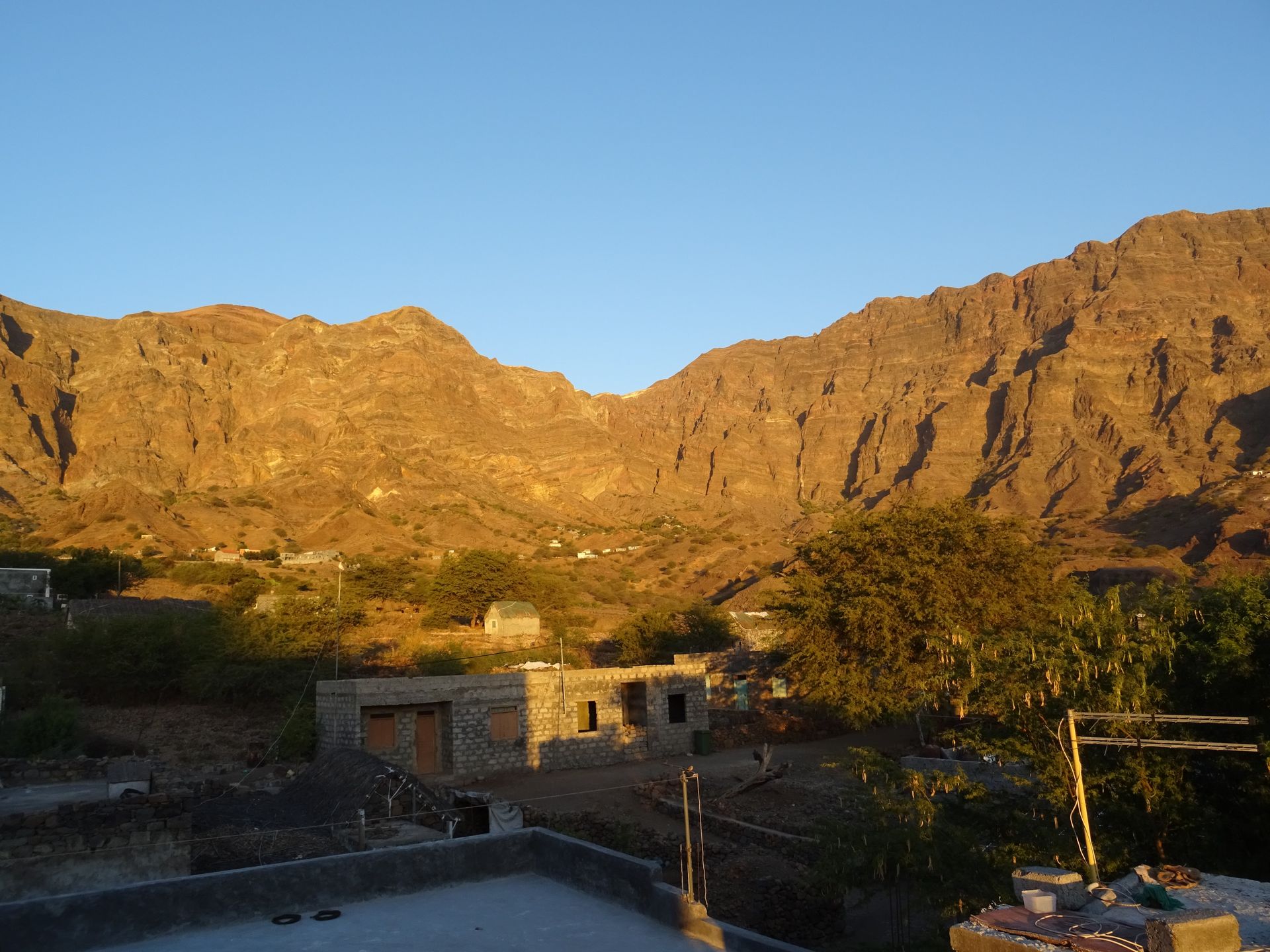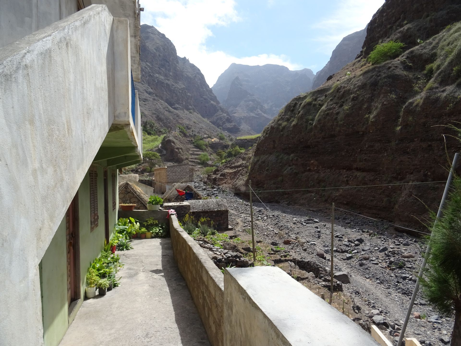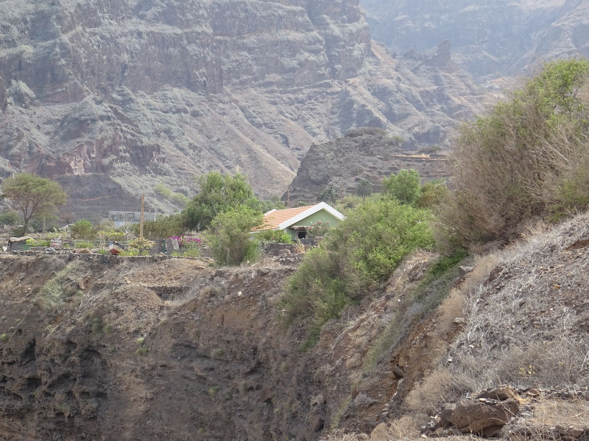 Der letzte Aufstieg ist noch einmal heftig, aber schließlich stehen wir oben auf der Hochebene und sehen Ribeira da Cruz in nicht mehr allzu weiter Entfernung. Noch eine Stunde, dann sind wir am Ziel unserer Wanderung angekommen. Dabei konnten wir den Ort gestern vom Chupador aus schon sehen. So spektakulär wie die gestrige, war die heutige Strecke nicht mehr. Und obwohl es heute nicht ganz so anstrengend war, sind wir doch froh, als wir gegen 13 Uhr in Ribeira da Cruz bei dem bereits auf uns wartenden Taxi eintreffen. Die Fahrt geht auch sofort los und führt durch eine herrliche Bergwelt nach Chã de Morte, das „Dorf des Todes“, wo wir für drei Nächte im Hotel von Senhor Nelson und seiner Frau Suzette wohnen werden. Wir bekommen ein schönes Zimmer, duschen uns erst einmal Staub und Schweiß vom Körper und sitzen dann den Rest des Tages auf der Terrasse vor dem Hotel in der Sonne und sehen dem Treiben auf der Straße zu.