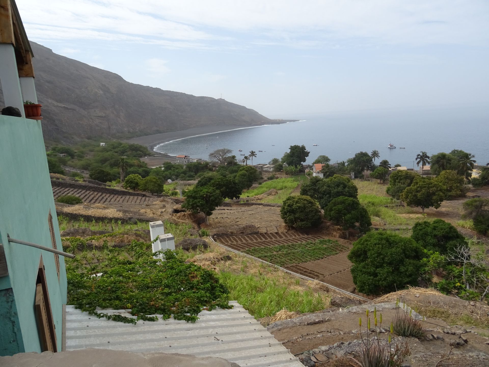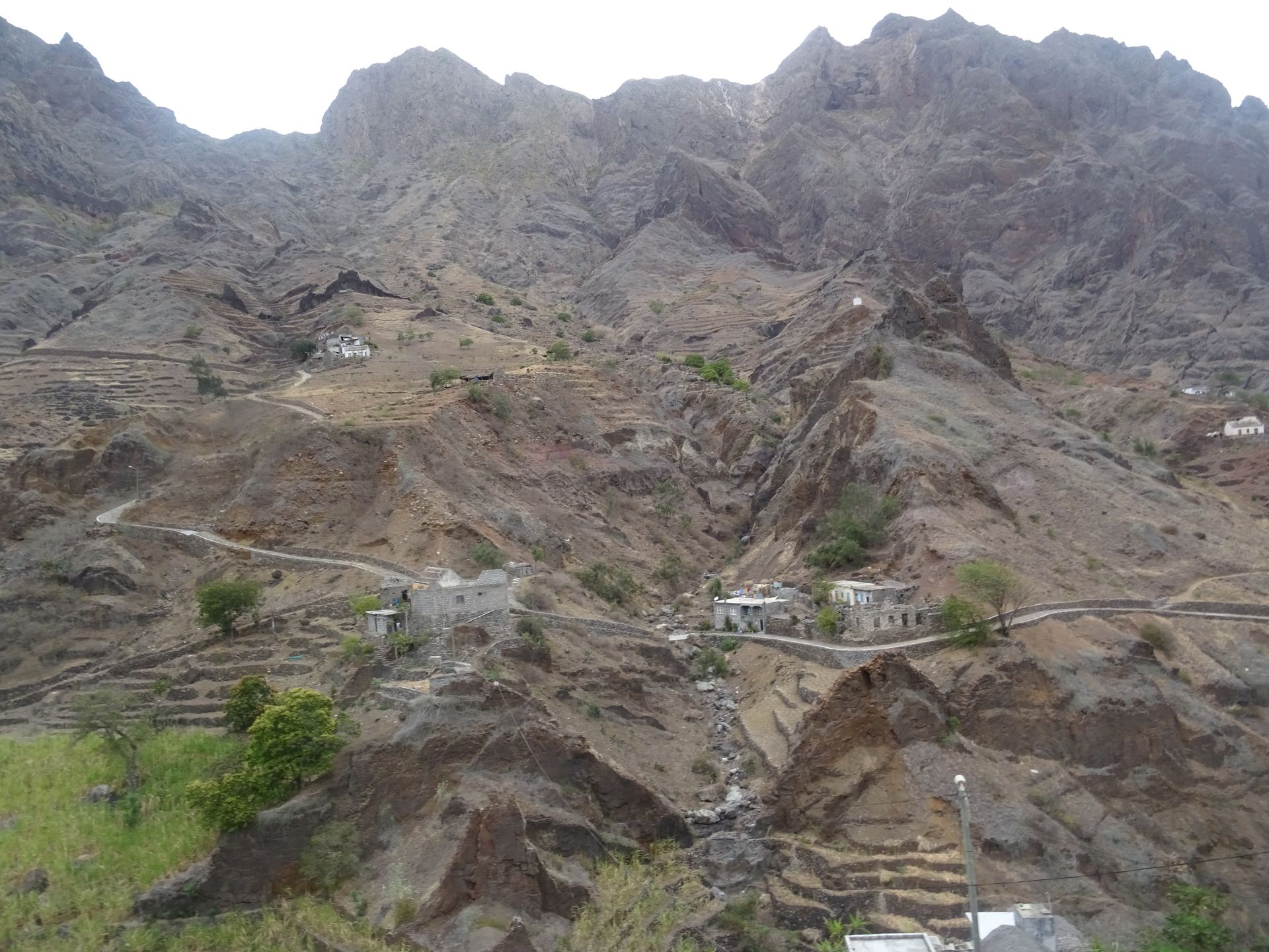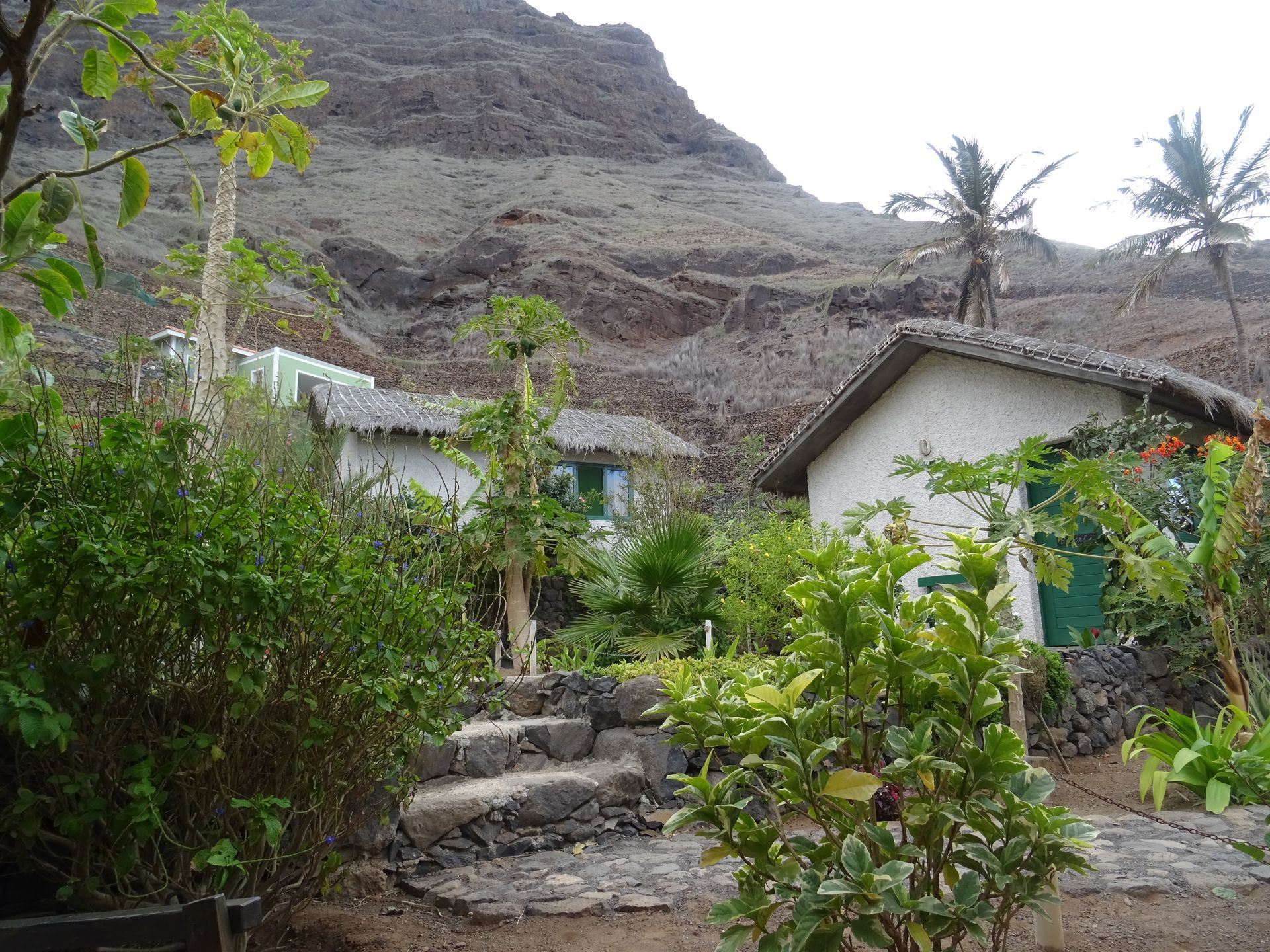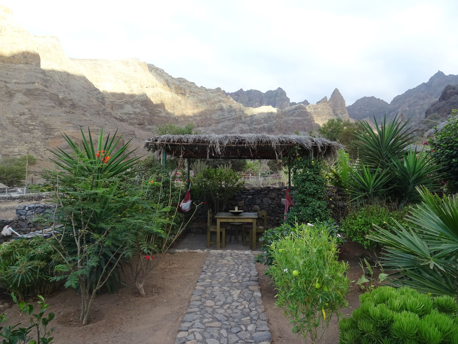 Der letzte Aufstieg ist noch einmal heftig, aber schließlich stehen wir oben auf der Hochebene und sehen Ribeira da Cruz in nicht mehr allzu weiter Entfernung. Noch eine Stunde, dann sind wir am Ziel unserer Wanderung angekommen. Dabei konnten wir den Ort gestern vom Chupador aus schon sehen. So spektakulär wie die gestrige, war die heutige Strecke nicht mehr. Und obwohl es heute nicht ganz so anstrengend war, sind wir doch froh, als wir gegen 13 Uhr in Ribeira da Cruz bei dem bereits auf uns wartenden Taxi eintreffen. Die Fahrt geht auch sofort los und führt durch eine herrliche Bergwelt nach Chã de Morte, das „Dorf des Todes“, wo wir für drei Nächte im Hotel von Senhor Nelson und seiner Frau Suzette wohnen werden. Wir bekommen ein schönes Zimmer, duschen uns erst einmal Staub und Schweiß vom Körper und sitzen dann den Rest des Tages auf der Terrasse vor dem Hotel in der Sonne und sehen dem Treiben auf der Straße zu.