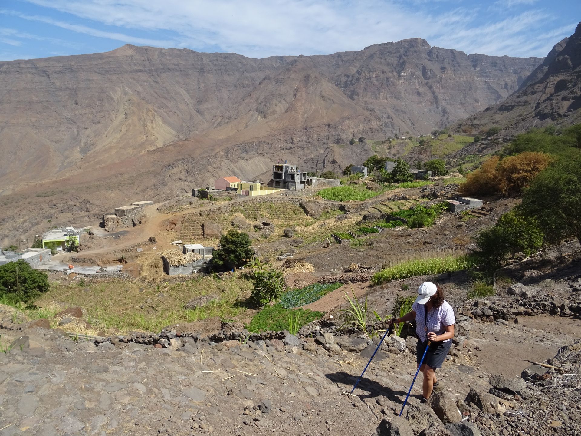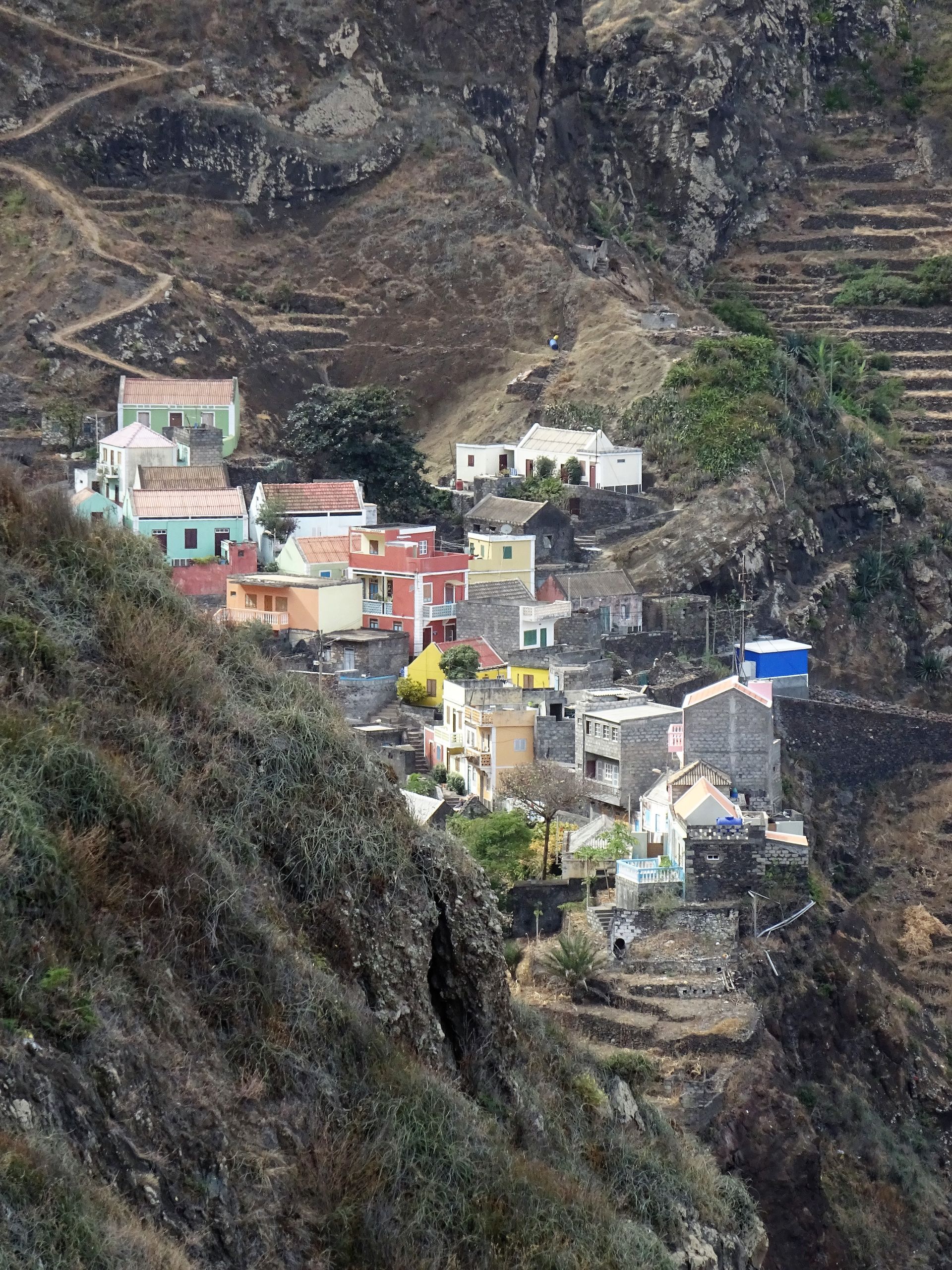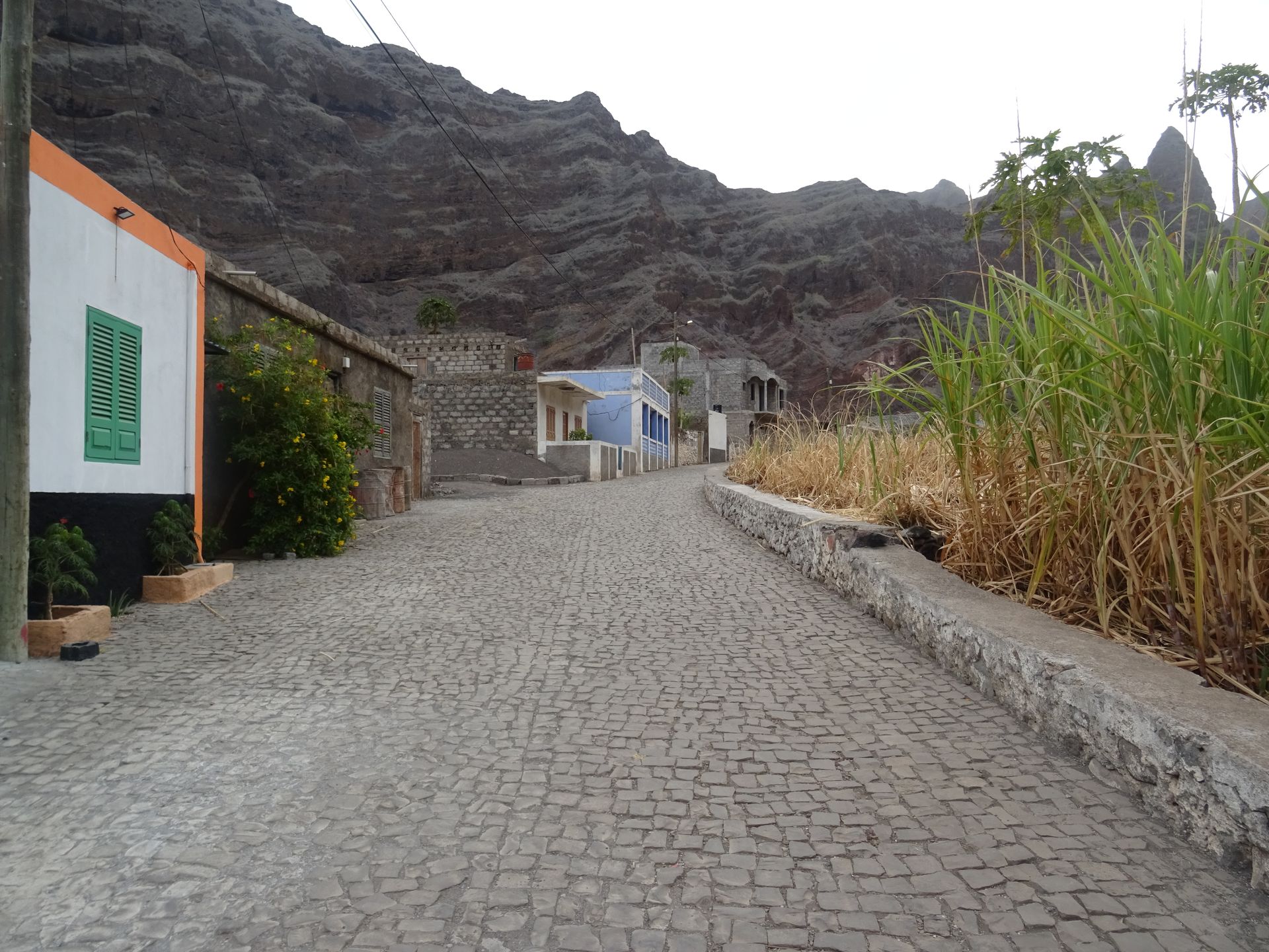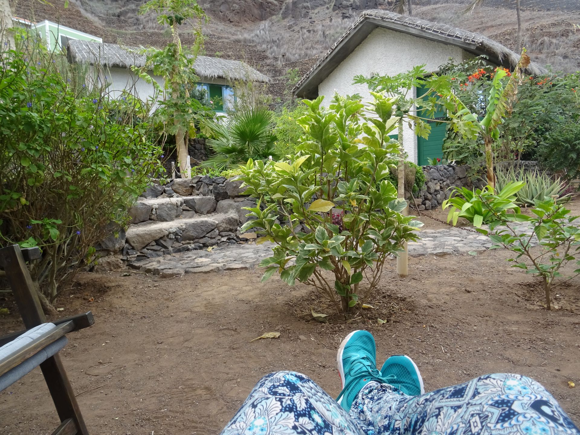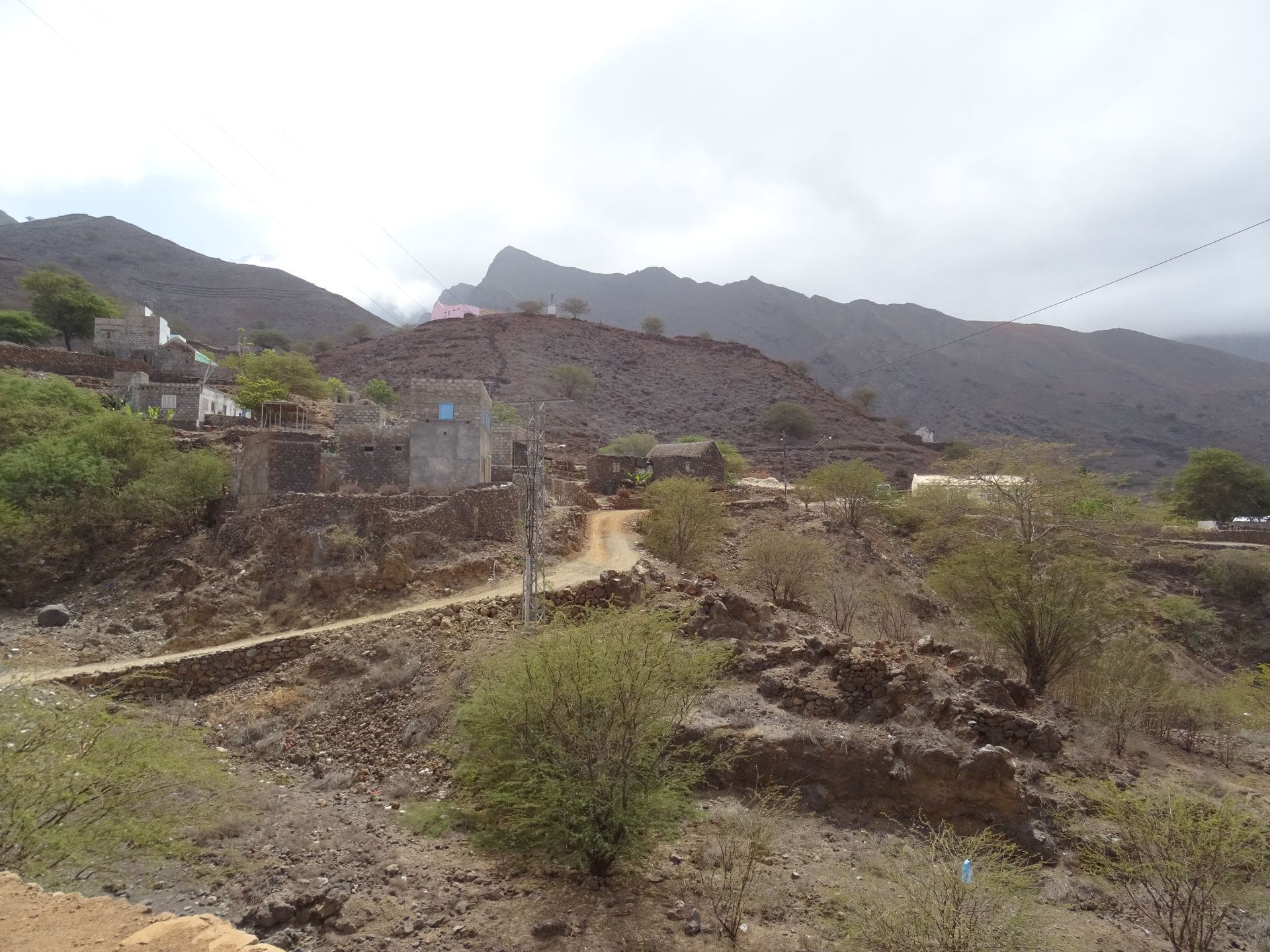 Der letzte Aufstieg ist noch einmal heftig, aber schließlich stehen wir oben auf der Hochebene und sehen Ribeira da Cruz in nicht mehr allzu weiter Entfernung. Noch eine Stunde, dann sind wir am Ziel unserer Wanderung angekommen. Dabei konnten wir den Ort gestern vom Chupador aus schon sehen. So spektakulär wie die gestrige, war die heutige Strecke nicht mehr. Und obwohl es heute nicht ganz so anstrengend war, sind wir doch froh, als wir gegen 13 Uhr in Ribeira da Cruz bei dem bereits auf uns wartenden Taxi eintreffen. Die Fahrt geht auch sofort los und führt durch eine herrliche Bergwelt nach Chã de Morte, das „Dorf des Todes“, wo wir für drei Nächte im Hotel von Senhor Nelson und seiner Frau Suzette wohnen werden. Wir bekommen ein schönes Zimmer, duschen uns erst einmal Staub und Schweiß vom Körper und sitzen dann den Rest des Tages auf der Terrasse vor dem Hotel in der Sonne und sehen dem Treiben auf der Straße zu.