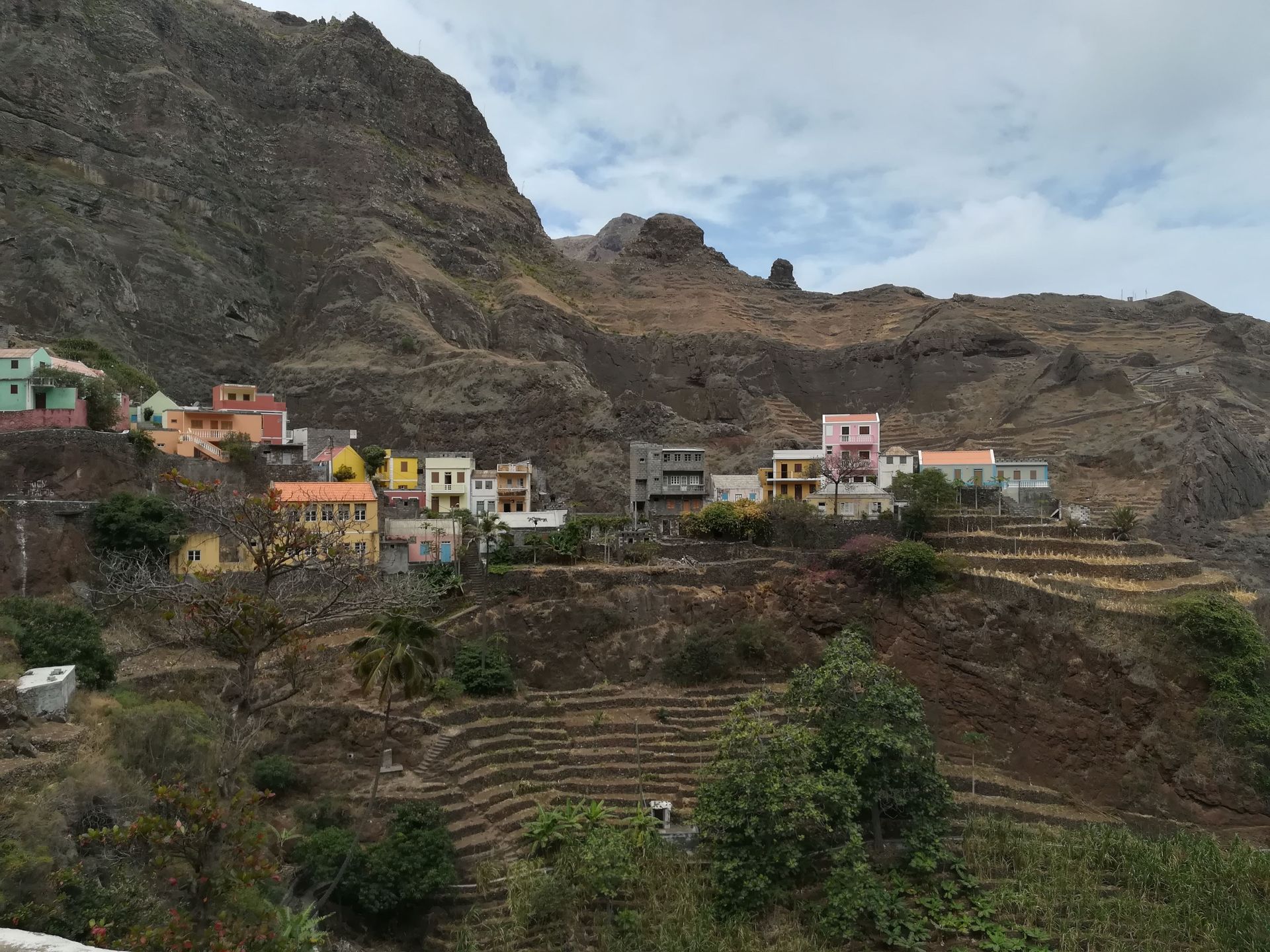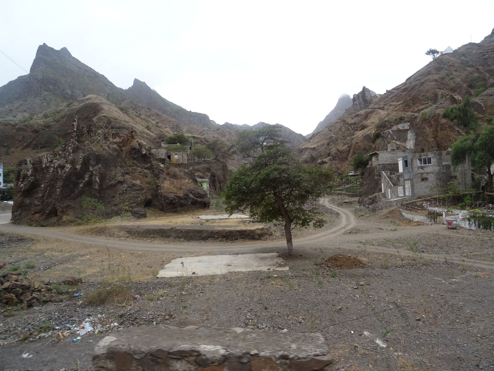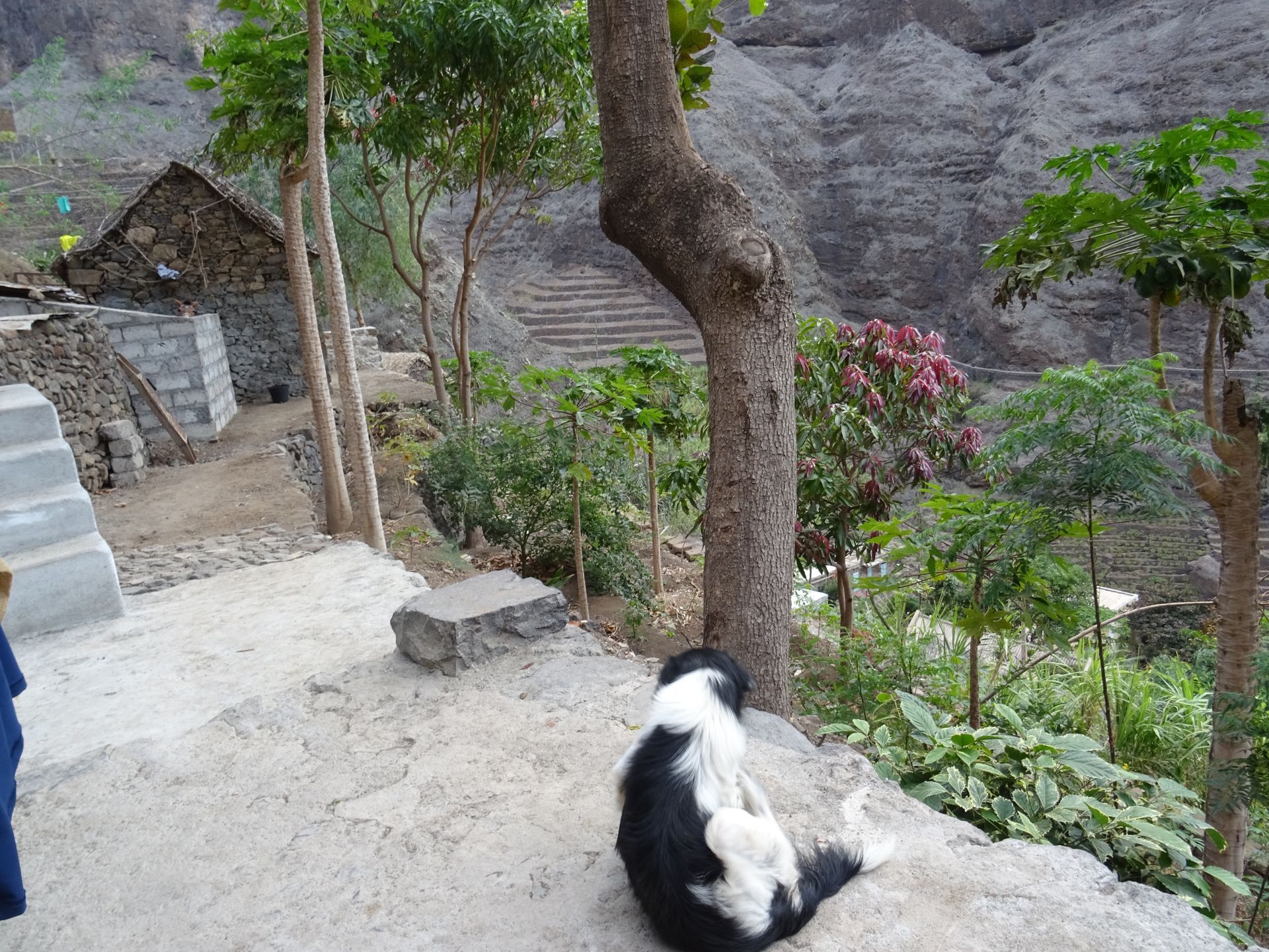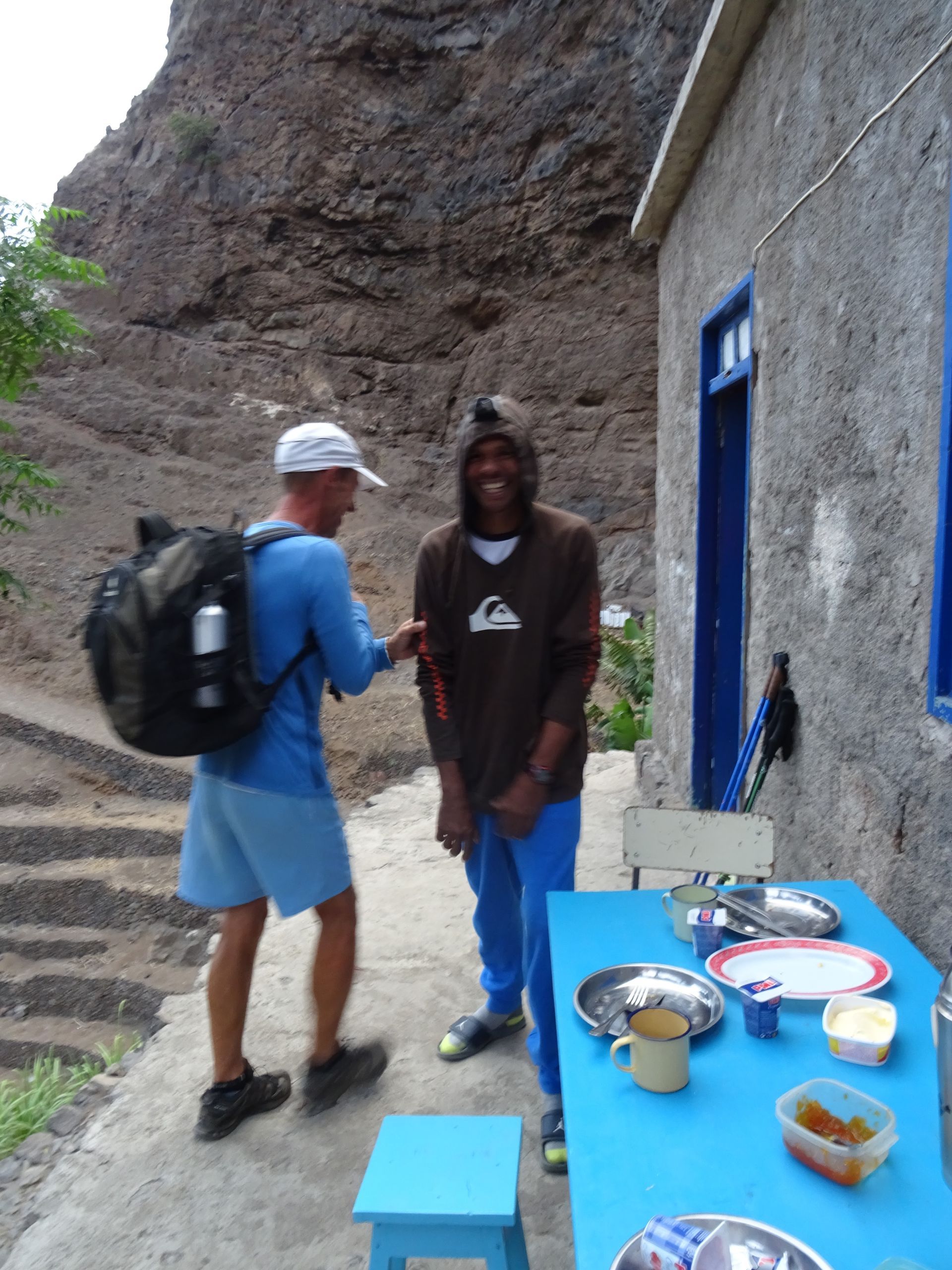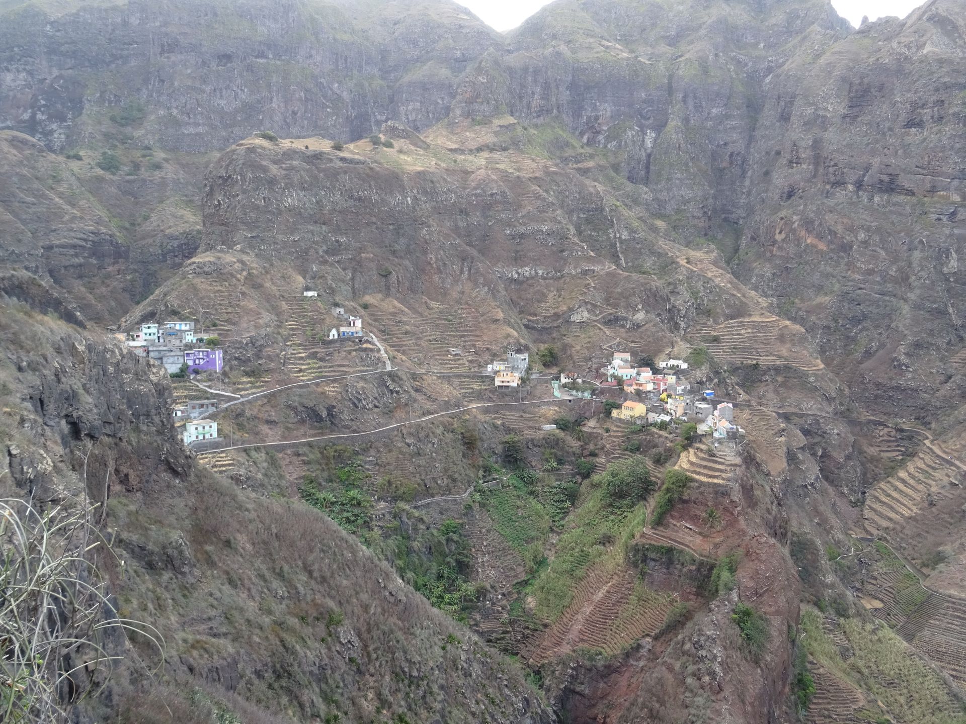Der letzte Aufstieg ist noch einmal heftig, aber schließlich stehen wir oben auf der Hochebene und sehen Ribeira da Cruz in nicht mehr allzu weiter Entfernung. Noch eine Stunde, dann sind wir am Ziel unserer Wanderung angekommen. Dabei konnten wir den Ort gestern vom Chupador aus schon sehen. So spektakulär wie die gestrige, war die heutige Strecke nicht mehr. Und obwohl es heute nicht ganz so anstrengend war, sind wir doch froh, als wir gegen 13 Uhr in Ribeira da Cruz bei dem bereits auf uns wartenden Taxi eintreffen. Die Fahrt geht auch sofort los und führt durch eine herrliche Bergwelt nach Chã de Morte, das „Dorf des Todes“, wo wir für drei Nächte im Hotel von Senhor Nelson und seiner Frau Suzette wohnen werden. Wir bekommen ein schönes Zimmer, duschen uns erst einmal Staub und Schweiß vom Körper und sitzen dann den Rest des Tages auf der Terrasse vor dem Hotel in der Sonne und sehen dem Treiben auf der Straße zu.