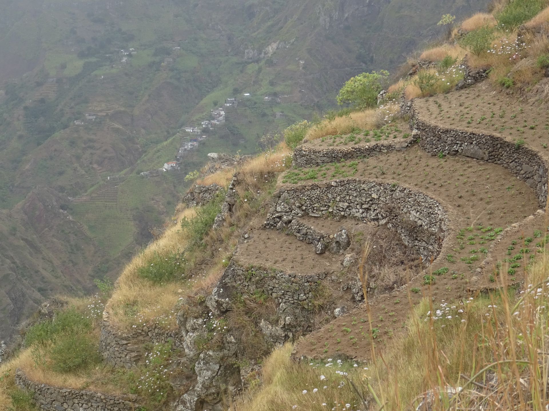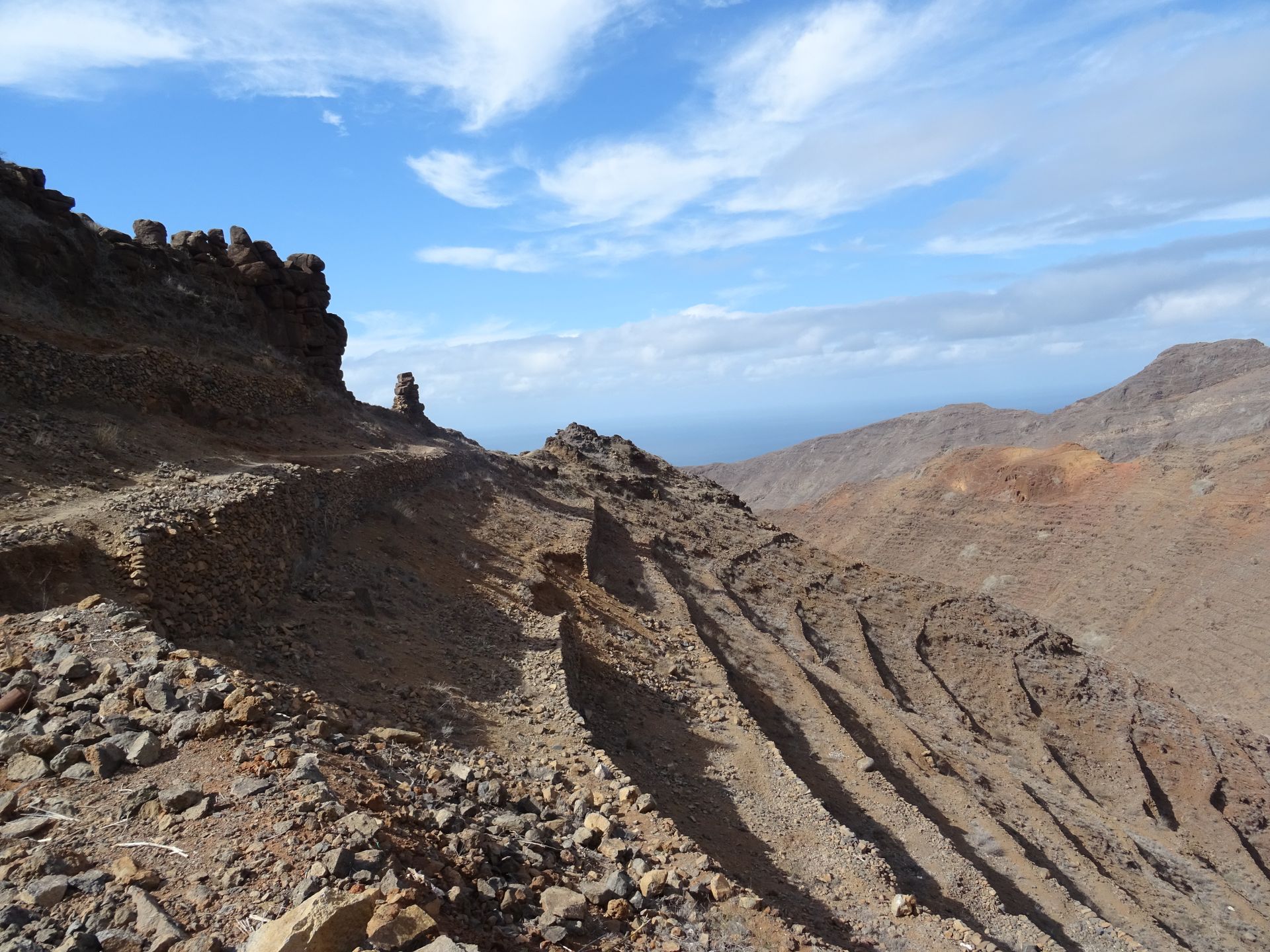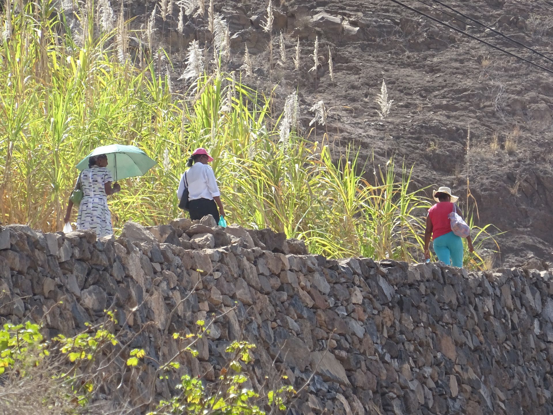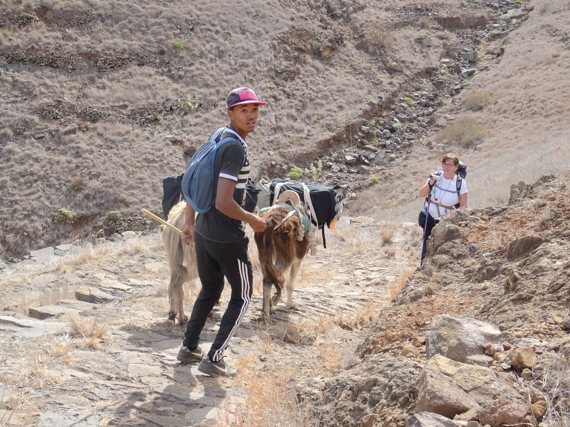 In viereinhalb Stunden steigen wir über 1000 Hm. hinauf und nicht nur Claudia hat atemraubende Blicke ins Torre Tal und hoch zur alten Passstraße. Oben treffen wir immer wieder auf einzelne Bauernhäuser. Da gibt es Ziegen und Kühe, stets angebunden. Bauern arbeiten in ihren Terrassenfeldern. Dorthin führt keine Straße, nur Eselspfade. Uns kommen zwei Frauen entgegen, eine junge und eine schon sehr alte Frau. Beide tragen große Bündel Brennholz auf den Köpfen. Die jüngere Frau geht in Flip-Flops, wie Diane. Die alte Frau ist barfuß. So langsam schäme ich mich fast meiner teuren Wanderstiefel. Wir grüßen mit einem freundlichen Bon Día und werden augenblicklich in ein gestenreiches Gespräch verstrickt. Morabéza nennt man das hier! Ein Wort, das nicht nur Freundlichkeit, Gastfreundschaft und Lebenslust beschreibt. Eigentlich kein Wort, sondern ein Gefühl, ein Lebensstil!