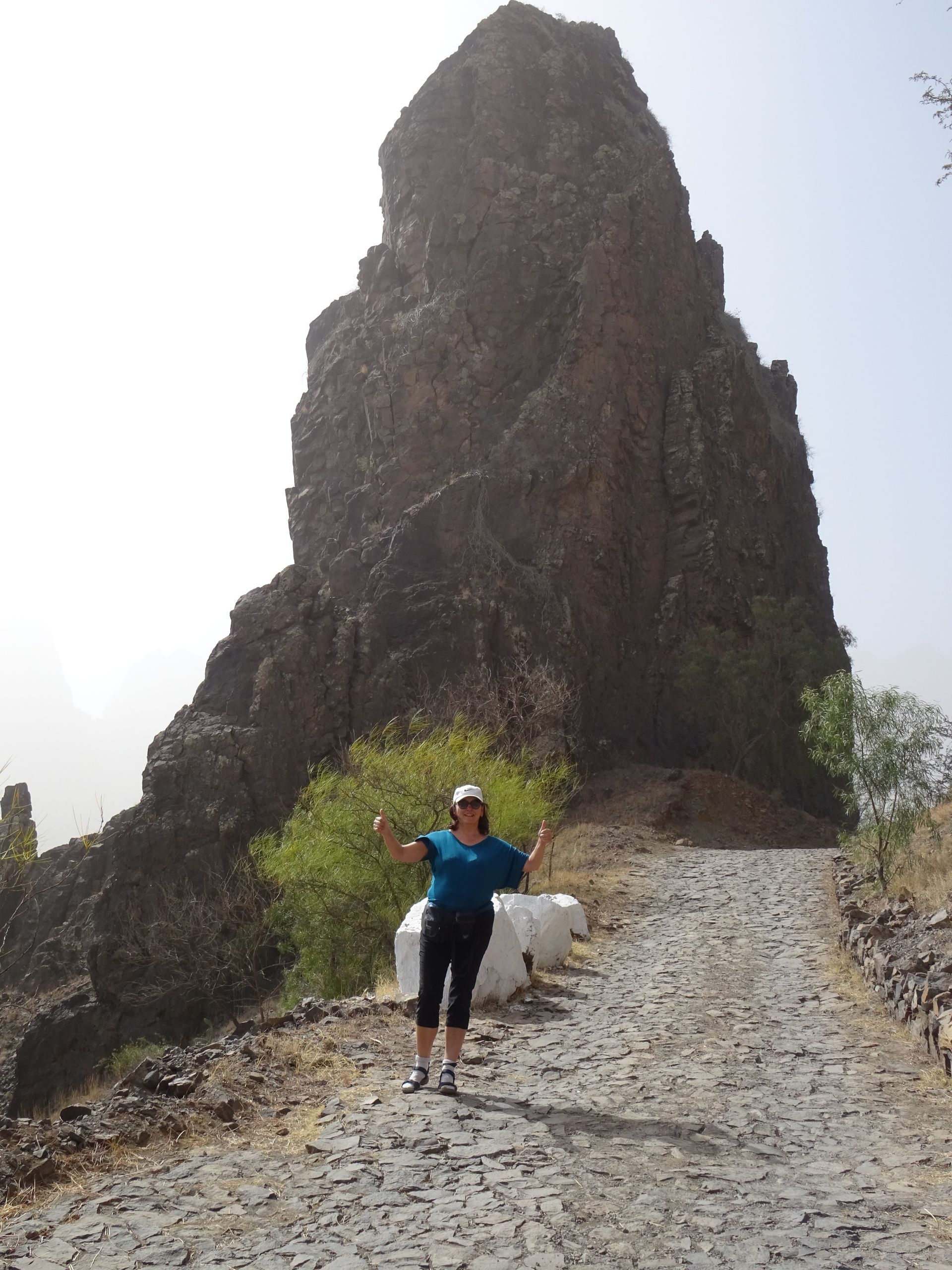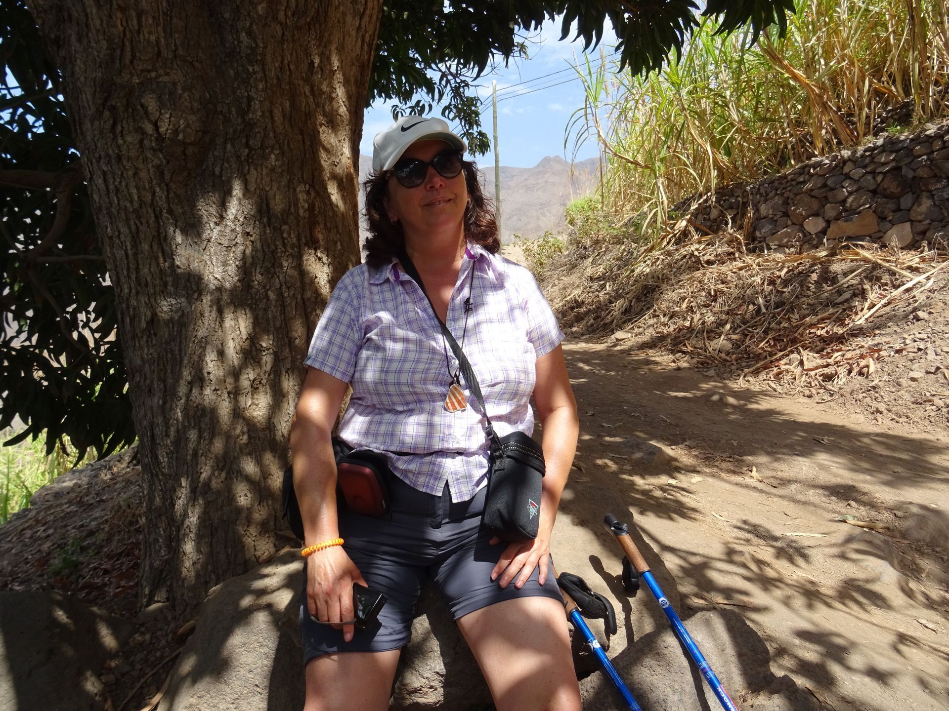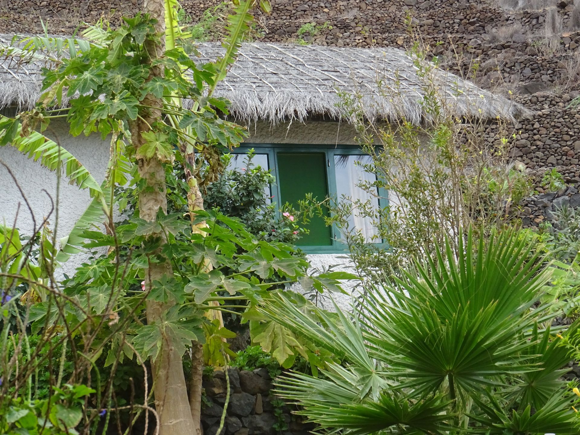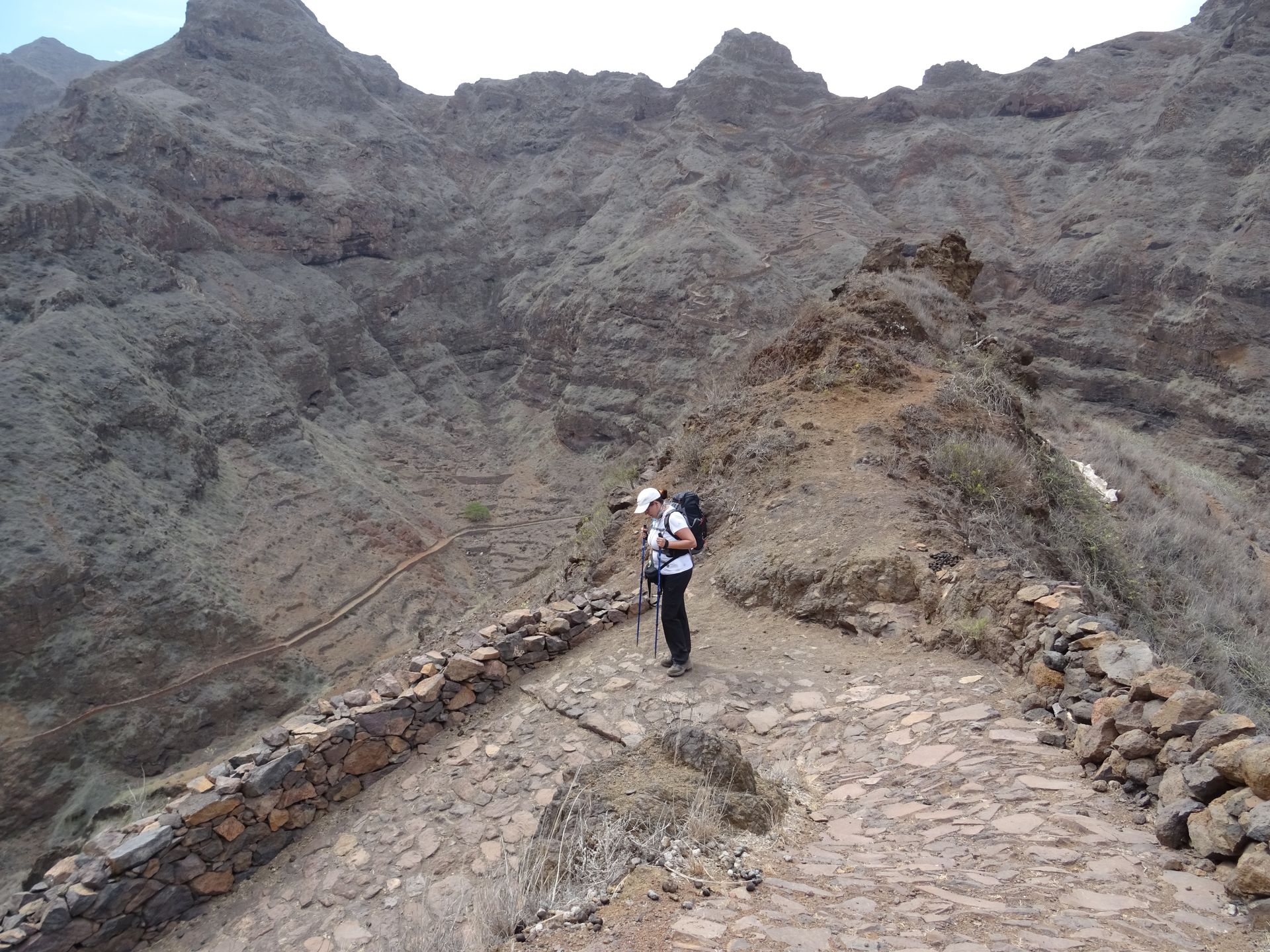 In viereinhalb Stunden steigen wir über 1000 Hm. hinauf und nicht nur Claudia hat atemraubende Blicke ins Torre Tal und hoch zur alten Passstraße. Oben treffen wir immer wieder auf einzelne Bauernhäuser. Da gibt es Ziegen und Kühe, stets angebunden. Bauern arbeiten in ihren Terrassenfeldern. Dorthin führt keine Straße, nur Eselspfade. Uns kommen zwei Frauen entgegen, eine junge und eine schon sehr alte Frau. Beide tragen große Bündel Brennholz auf den Köpfen. Die jüngere Frau geht in Flip-Flops, wie Diane. Die alte Frau ist barfuß. So langsam schäme ich mich fast meiner teuren Wanderstiefel. Wir grüßen mit einem freundlichen Bon Día und werden augenblicklich in ein gestenreiches Gespräch verstrickt. Morabéza nennt man das hier! Ein Wort, das nicht nur Freundlichkeit, Gastfreundschaft und Lebenslust beschreibt. Eigentlich kein Wort, sondern ein Gefühl, ein Lebensstil!