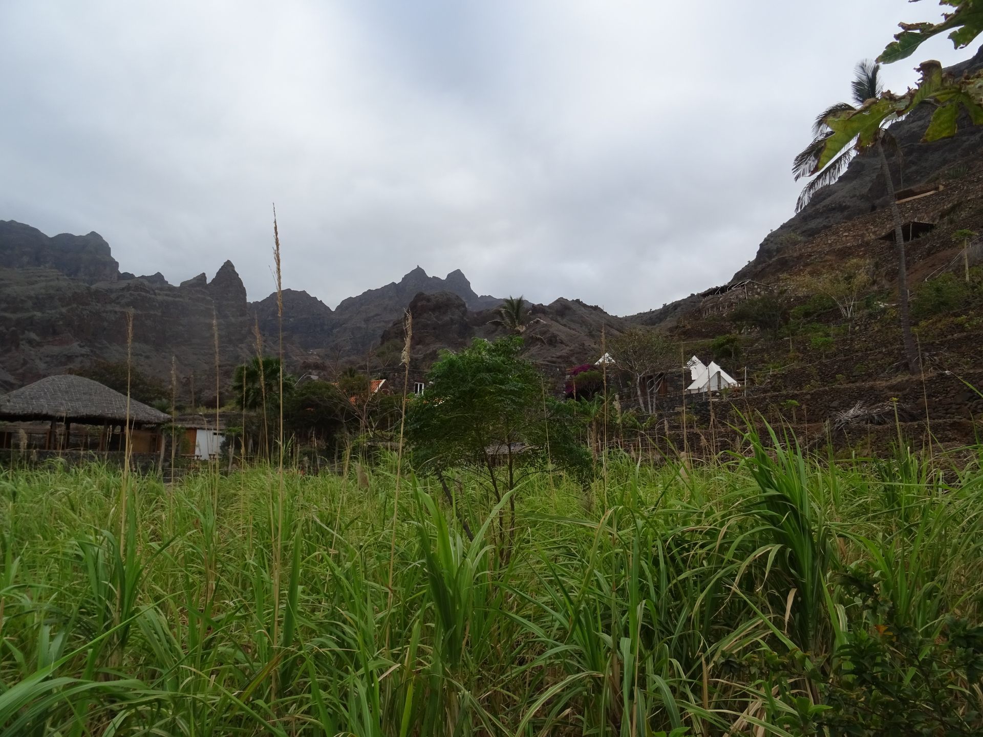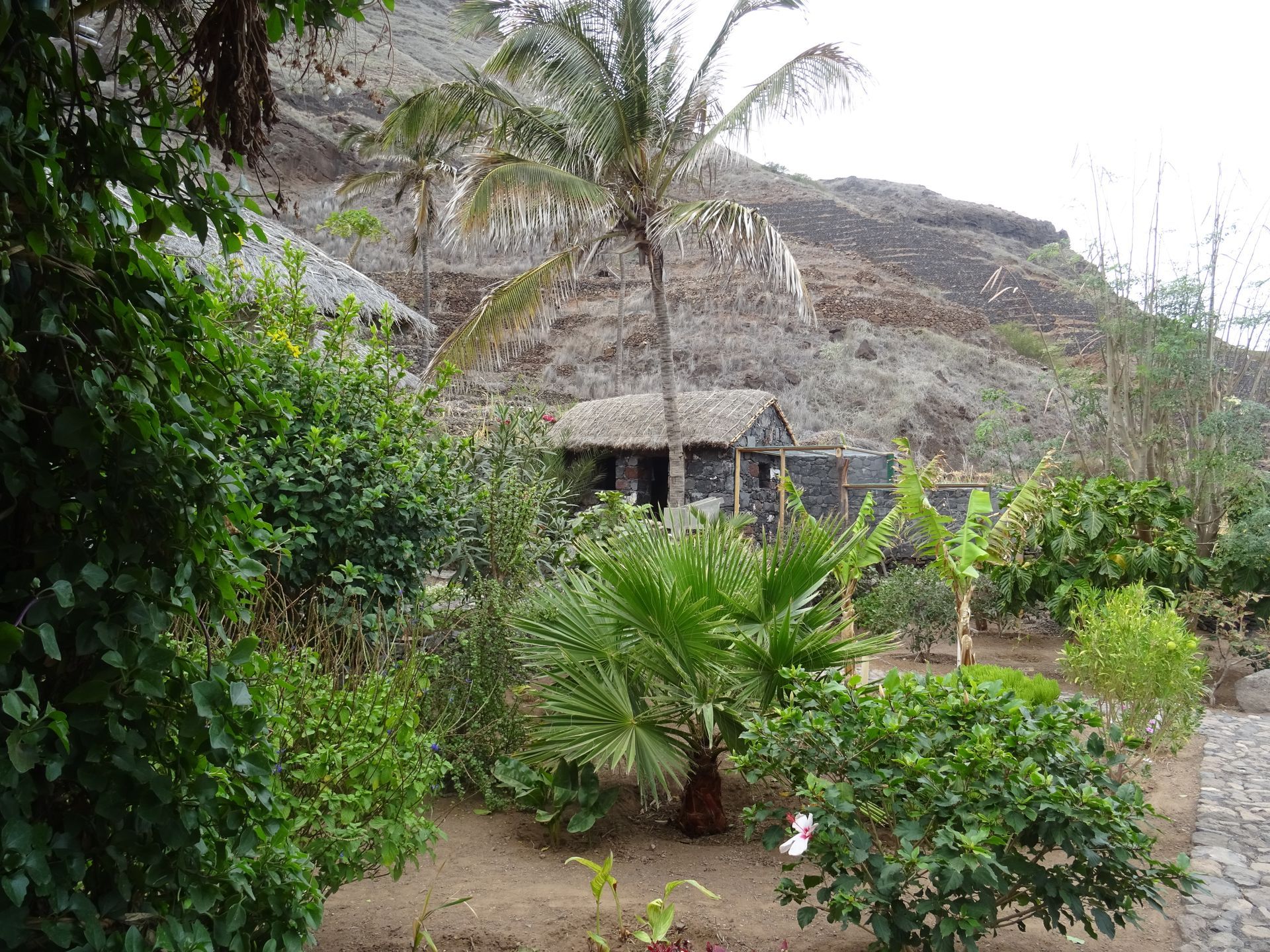 Wir beziehen unseren Bungalow und da es hier unten, fast schon auf Meereshöhe, angenehm warm ist, duschen wir kalt und suchen danach die Hängematten und Liegen im Garten auf, aus denen wir uns erst zum Abendessen um 18 Uhr wieder erheben. Es gibt das Nationalgericht der Kapverdischen Inseln: Cachupa, einen Eintopf aus Mais und Gemüse, der in einem großen Kessel über offenem Feuer in der eigens dafür erbauten Cachupa-Hütte zubereitet wird. Dazu reicht Diane Fisch, den ein einheimischer Fischer in einer großen Schüssel brachte, als er auf dem Heimweg hier vorbeikam. Wir gönnen uns dazu eine Flasche Wein und ein Gläschen Ponche mit Tamarinde. Ponche ist ein Likör, der aus Grogue (Zuckerrohrschnaps) und Zuckerrohrsirup hergestellt wird. Dem Zuckerrohr und seinen flüssigen Produkten kommt hier auf Cabo Verde große Bedeutung zu.