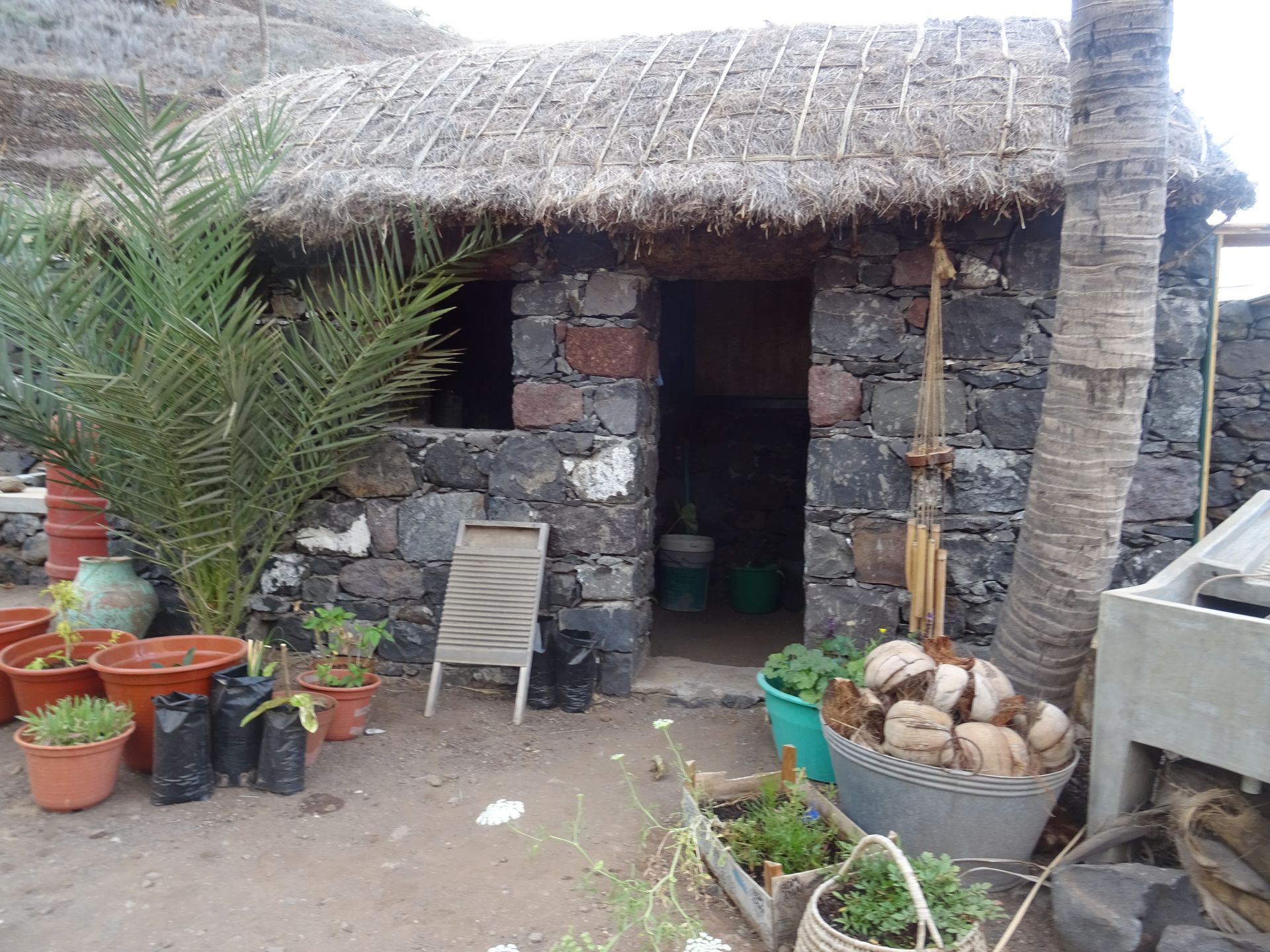 Und dann stehen wir da und bestaunen die Anlage, die da vor uns liegt. Mar Tranquilidade! So heißt unsere Unterkunft für die nächsten drei Nächte. Ganz anders als das „Haus am Meer“ aber ebenfalls wunderschön. Auf den ersten Blick lässt sich gar nicht erkennen, wie groß das Anwesen ist. Nicht so groß wie das Grundstück um das „Haus am Weg“, das scheint sicher. Das Haupthaus liegt an der Straße, dahinter erkennt man mehrere strohgedeckte, irgendwie ineinander verschachtelte Steinhäuser. Der ganze Komplex steht im Schatten großer Bäume. Südsee-Feeling kommt auf. Es ist wie im Paradies! Auf der anderen Seite der Straße beginnt der feine Lava-Strand. Stufen führen zu einem auf Betonsäulen getragenen Dach mit Liegestühlen und Sitzgelegenheiten darunter.