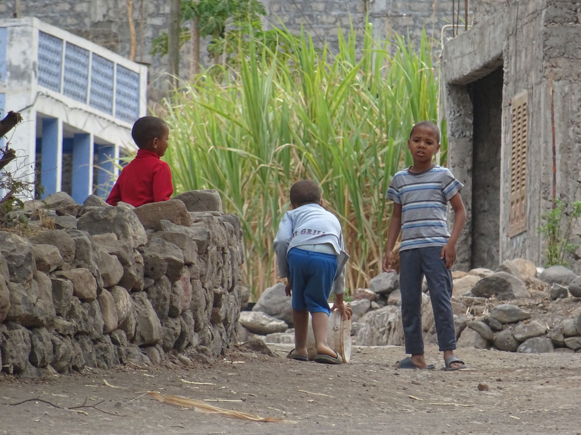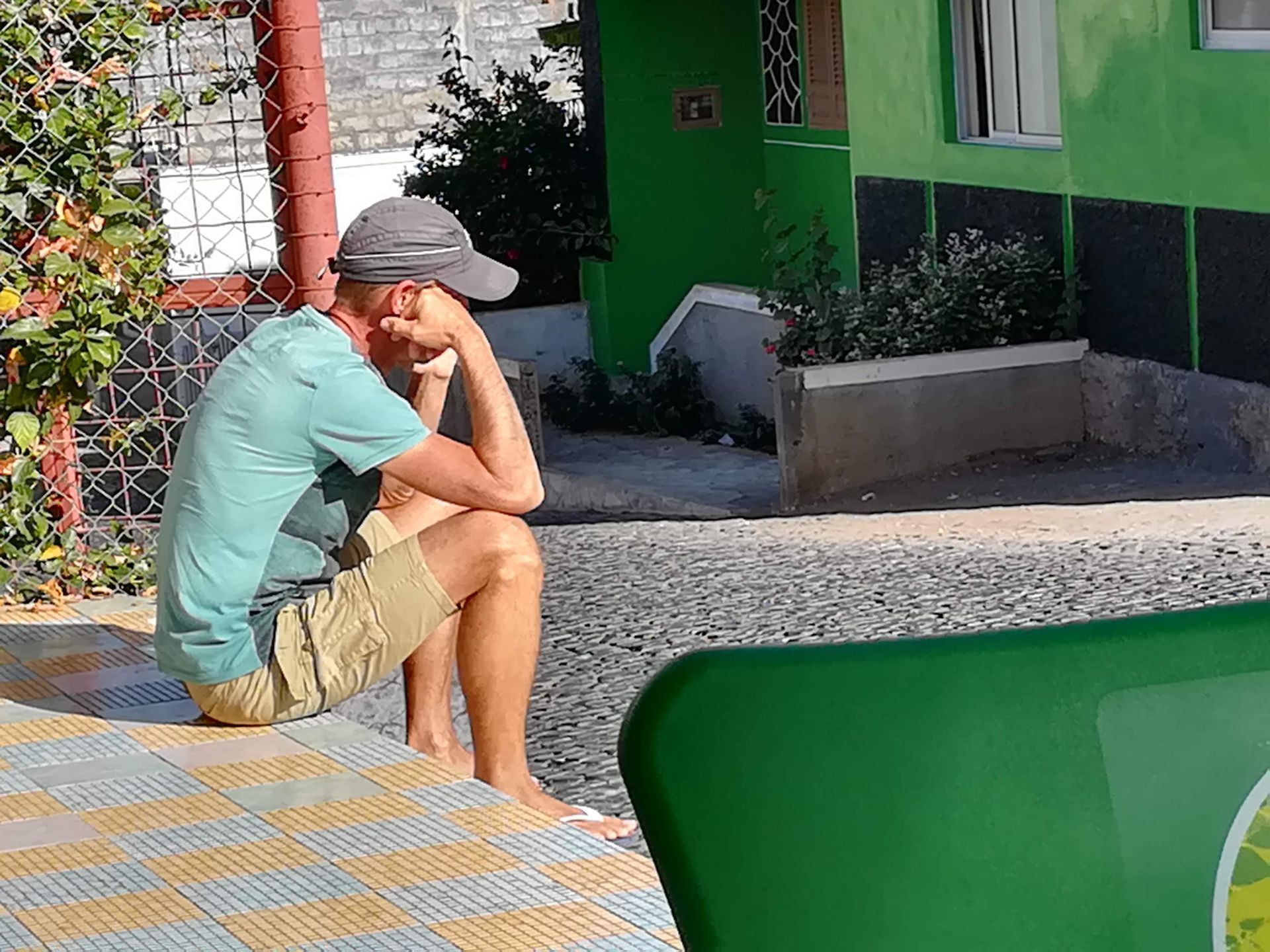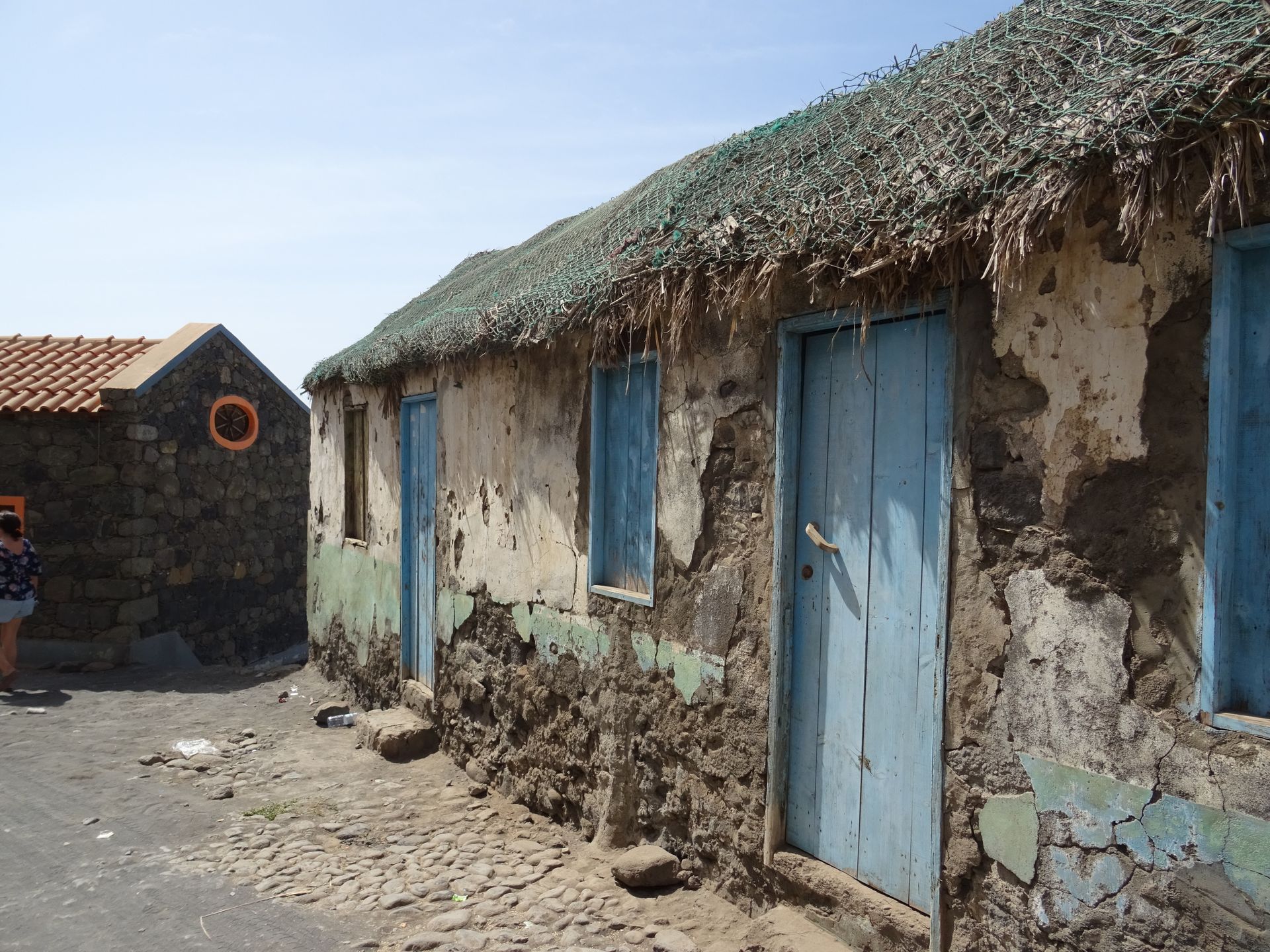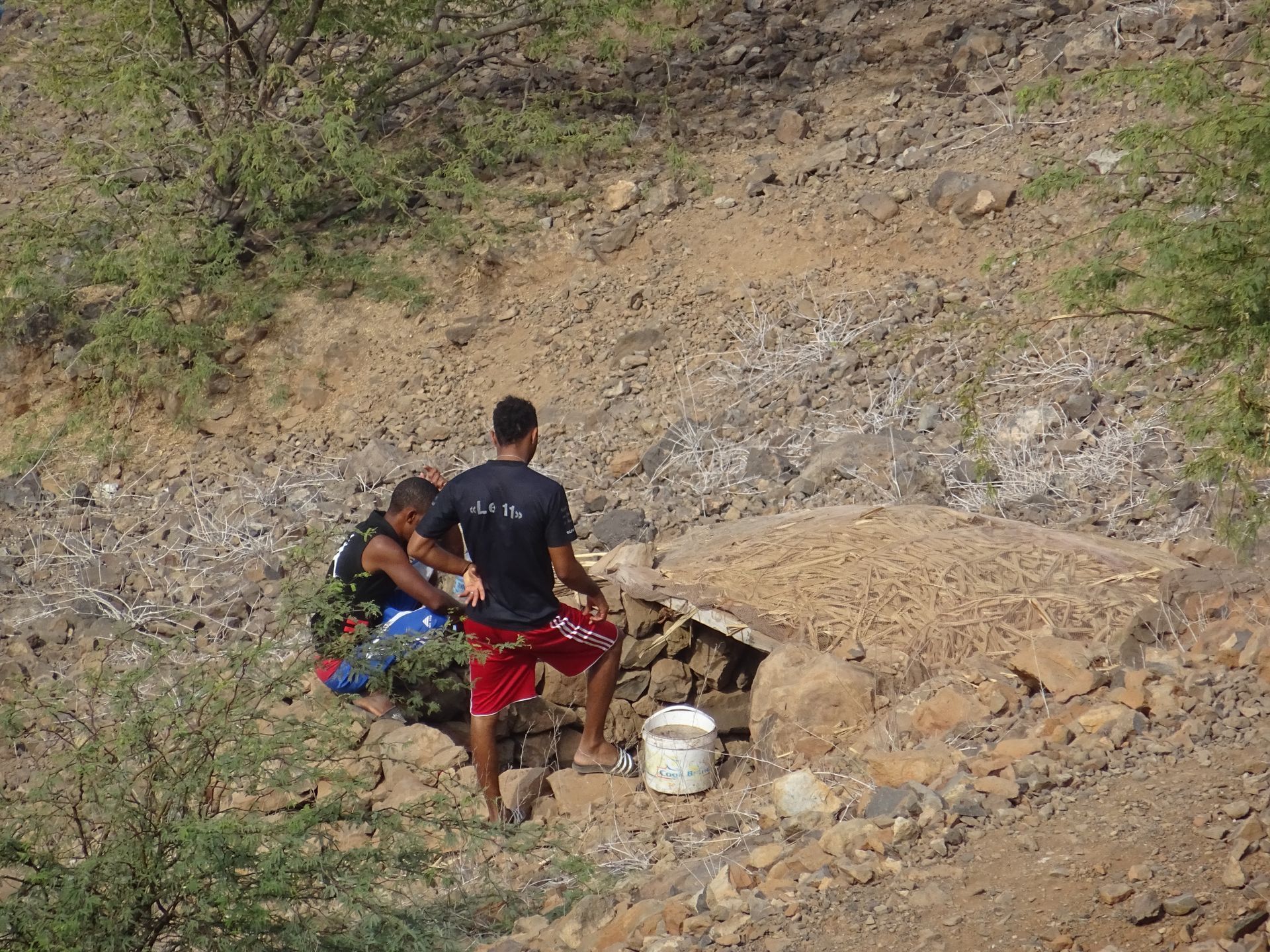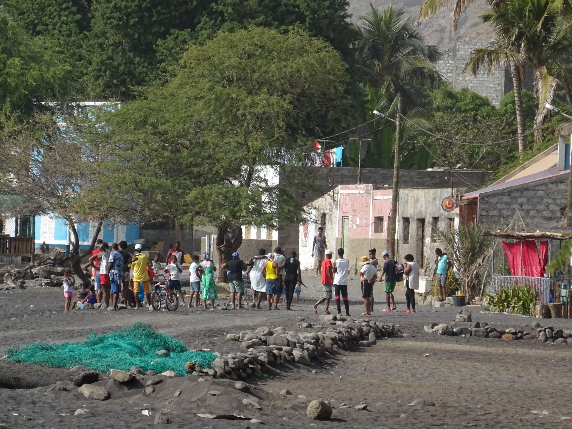 Nach etwa 25 Minuten treffen immer mehr Einheimische am Laden ein und fünf Minuten später kommt auch der Besitzer und öffnet. Es kommt anscheinend nicht oft vor, dass sich Touristen hierher verirren. Dementsprechend sind wir eine Attraktion für die Bewohner des oberen Ortsteils. Da ist niemand dabei, der einen größeren Einkauf tätigt. Sie kaufen lediglich eine Cola und setzten sich damit nach draußen auf die Bänke. In null-komma-nichts sind wir von Einheimischen umringt, die zuschauen, wie wir unsererseits eine Cola trinken. Sind die Menschen eben noch ihrer Arbeit nachgegangen, scheinen sie jetzt alle Zeit der Welt zu haben, um mit uns hier zu sitzen. Zeit hat auf Cabo Verde eine andere Bedeutung als bei uns. „No Stress“ ist hier das allgegenwärtige Motto! Man versucht, mit uns ins Gespräch zu kommen und ein paar Brocken verstehe ich wieder. Der Weber unterhalb der Terrasse macht Jalousien. Den Ladenbesitzer haben wir von der Feldarbeit weggeholt. Mit Händen und Füßen verständigen wir uns und wo wir nicht mehr weiterkommen, hilft ein einfaches Lächeln. Morabeza! Lebensfreude! Gastfreundschaft! Offenheit! Es macht weitaus mehr Spaß, hier unter diesen freundlichen Menschen zu sitzen, als unten in der Anlage die Prahlerei der europäischen Gäste zu hören. Als wir uns verabschieden löst sich die Gesellschaft wieder auf und ein jeder kehrt an seine Arbeit zurück.