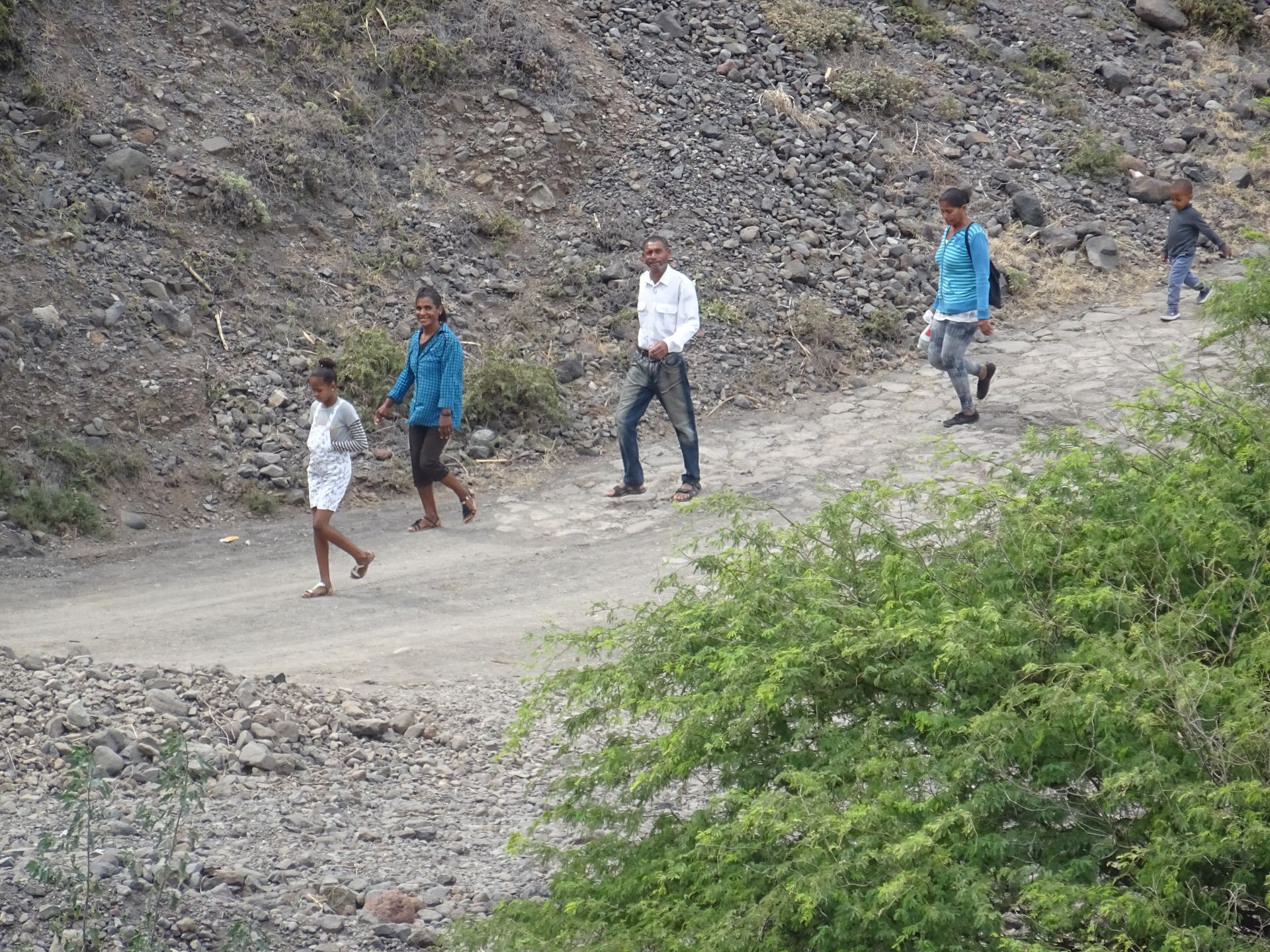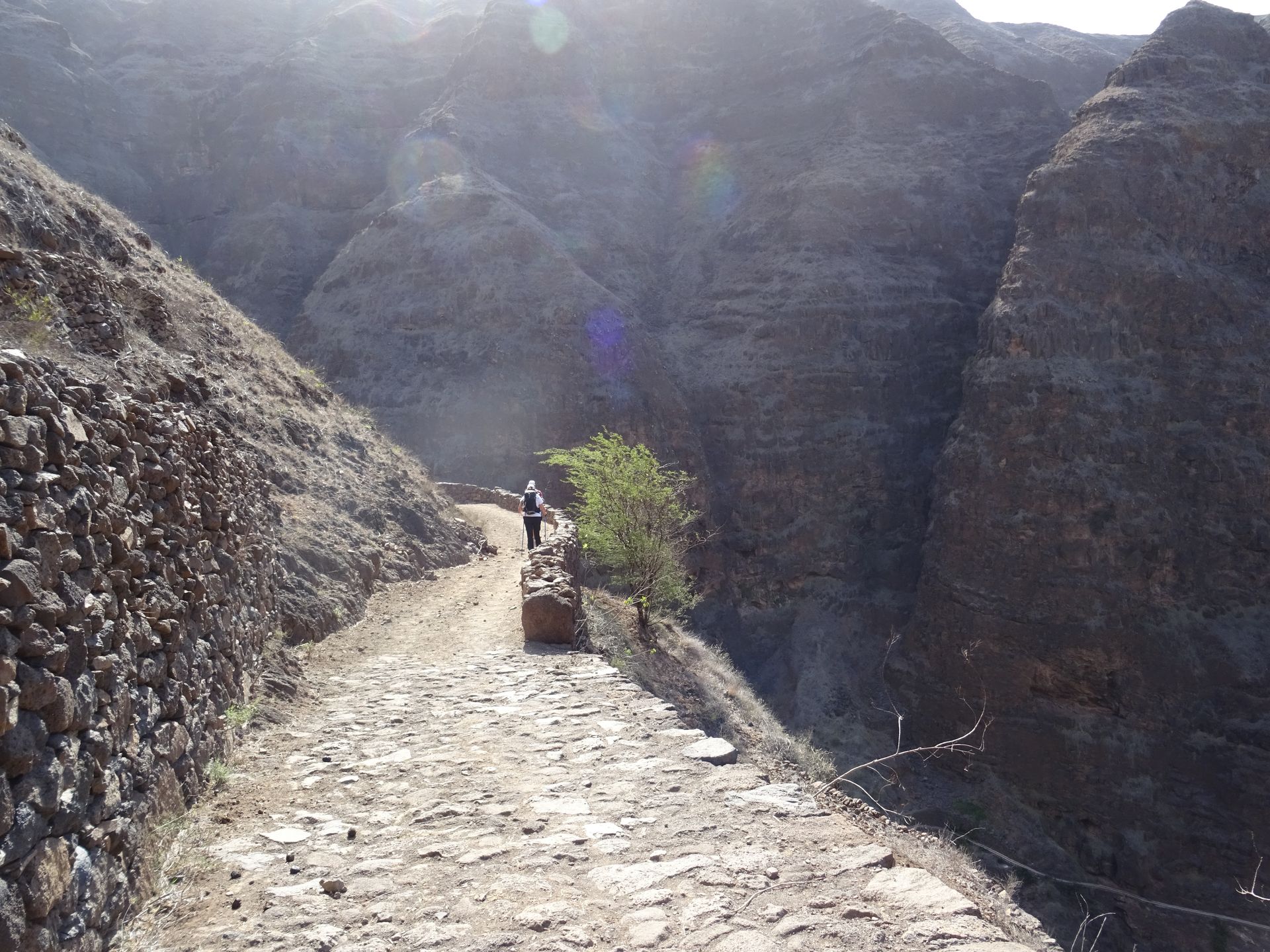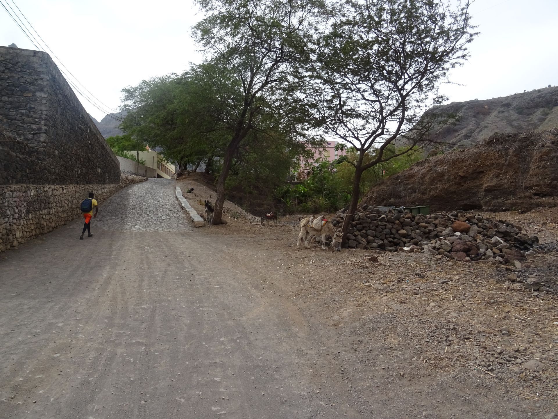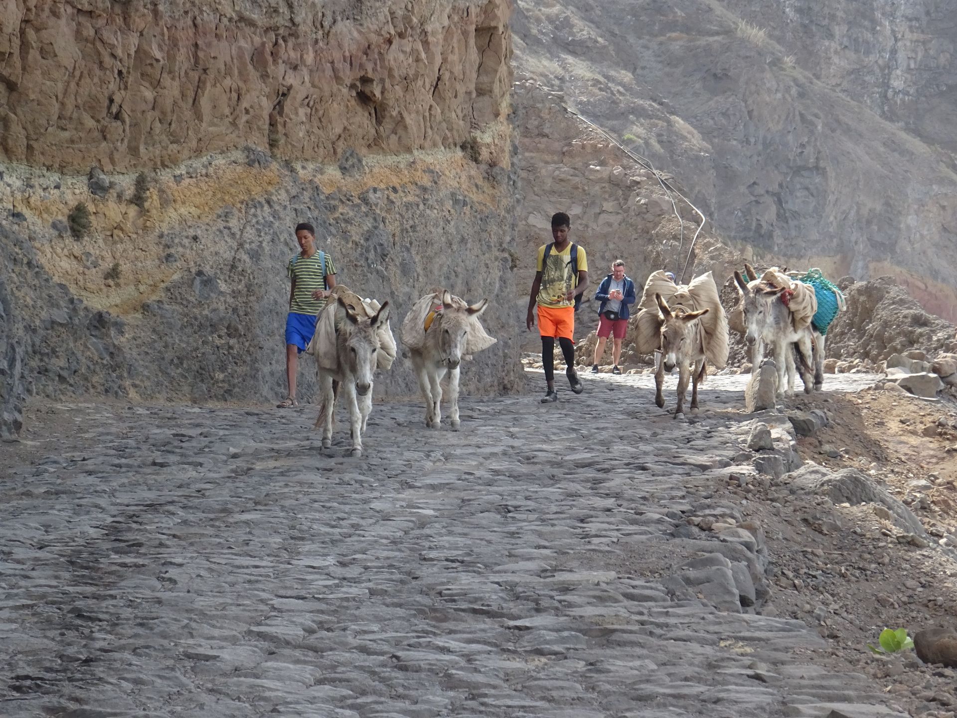 Gegen zehn kommt uns die Eselskarawane und ihr jugendlicher Treiber entgegen, die mir ja schon bekannt sind. Der Junge hat Kopfhörer im Ohr, eine Rute in der Hand und rennt hinter seinen Eseln den Berg herunter. Er bleibt kurz bei uns stehen, unterhält sich mit Marcus und rennt dann wieder hinter seinen Eseln, die bereits um die nächste Kehre verschwunden sind, den Berg hinauf, den wir gerade vorsichtig heruntergekommen sind. Marcus erklärt uns, dass die Esel Senhor Adalbert gehören, bei dem wir heute übernachten werden. Die Wegstrecke von Chã d´Igreja nach Figueiras ist für geübte Wanderer in sechs Stunden machbar, wobei die einzige Schwierigkeit in dem dauernden auf und ab besteht. Der Junge mit seinen Eseln läuft in vier Stunden hin und zurück und das gleiche am Nachmittag nochmal! Ich habe inzwischen die allergrößte Hochachtung vor der Leistung dieser zähen Insel- und Bergbewohner. Ich war immer schon fasziniert davon, wie man in allen Gebirgen, durch die ich bisher wanderte, die Wege und Pfade instand hält. Aber hier auf Santo Antão sind alle Verbindungswege zudem noch gepflastert und haben oft auch eine gemauerte Absturzsicherung.