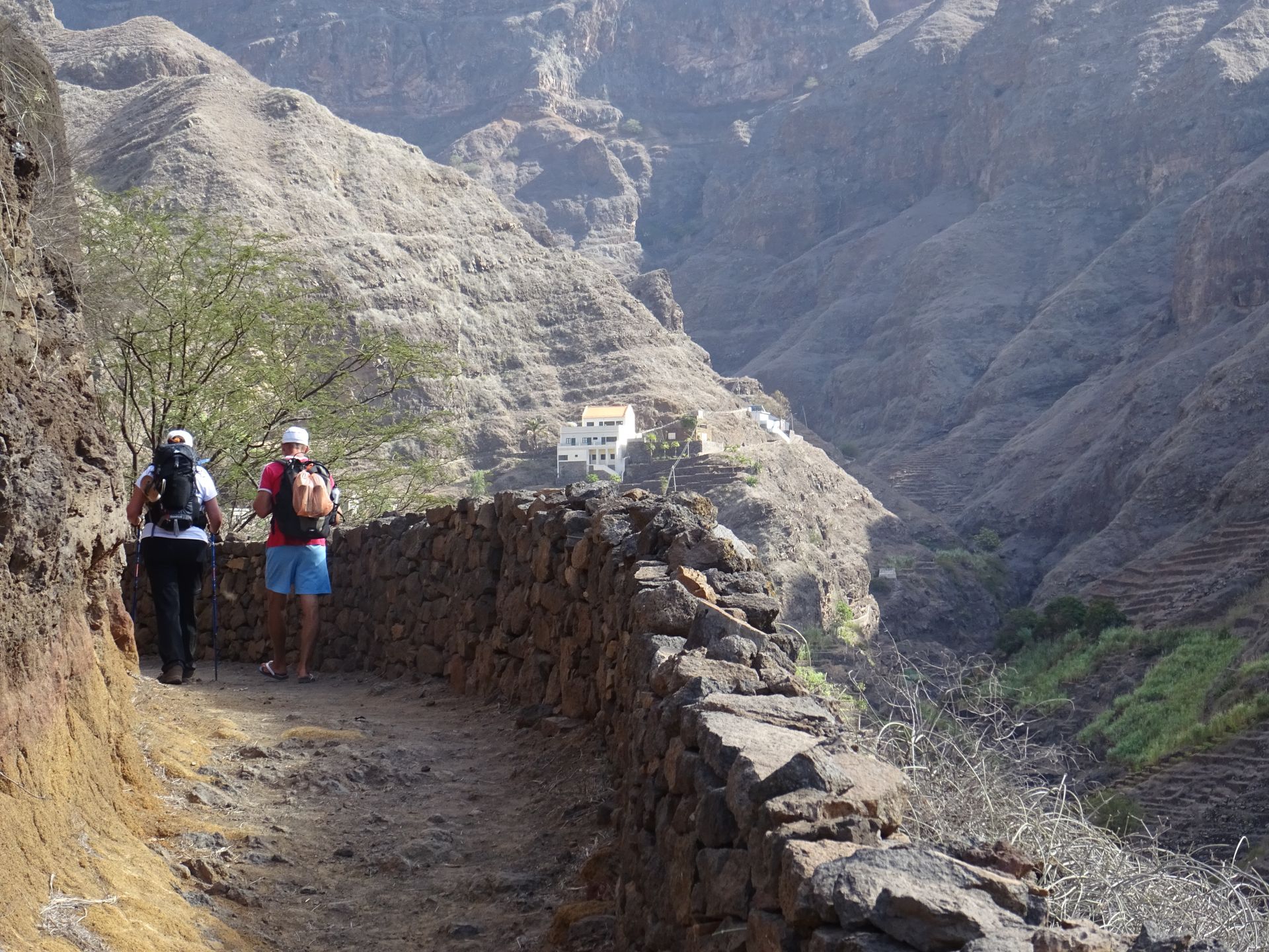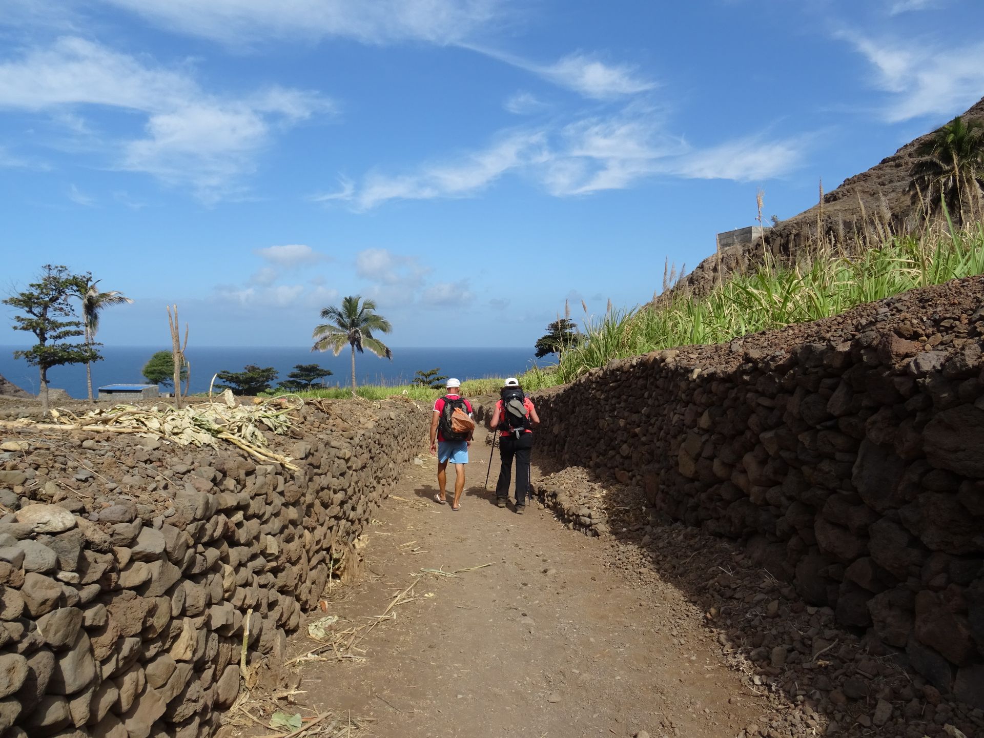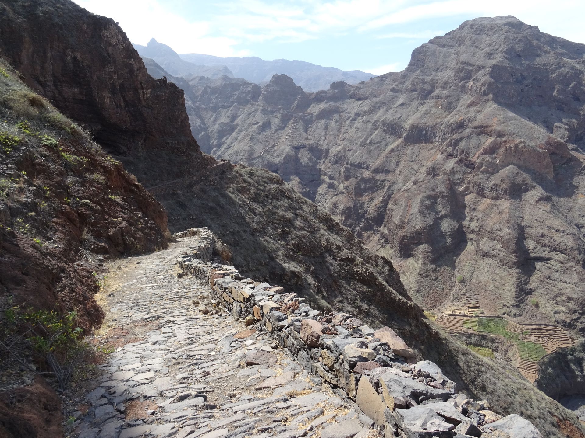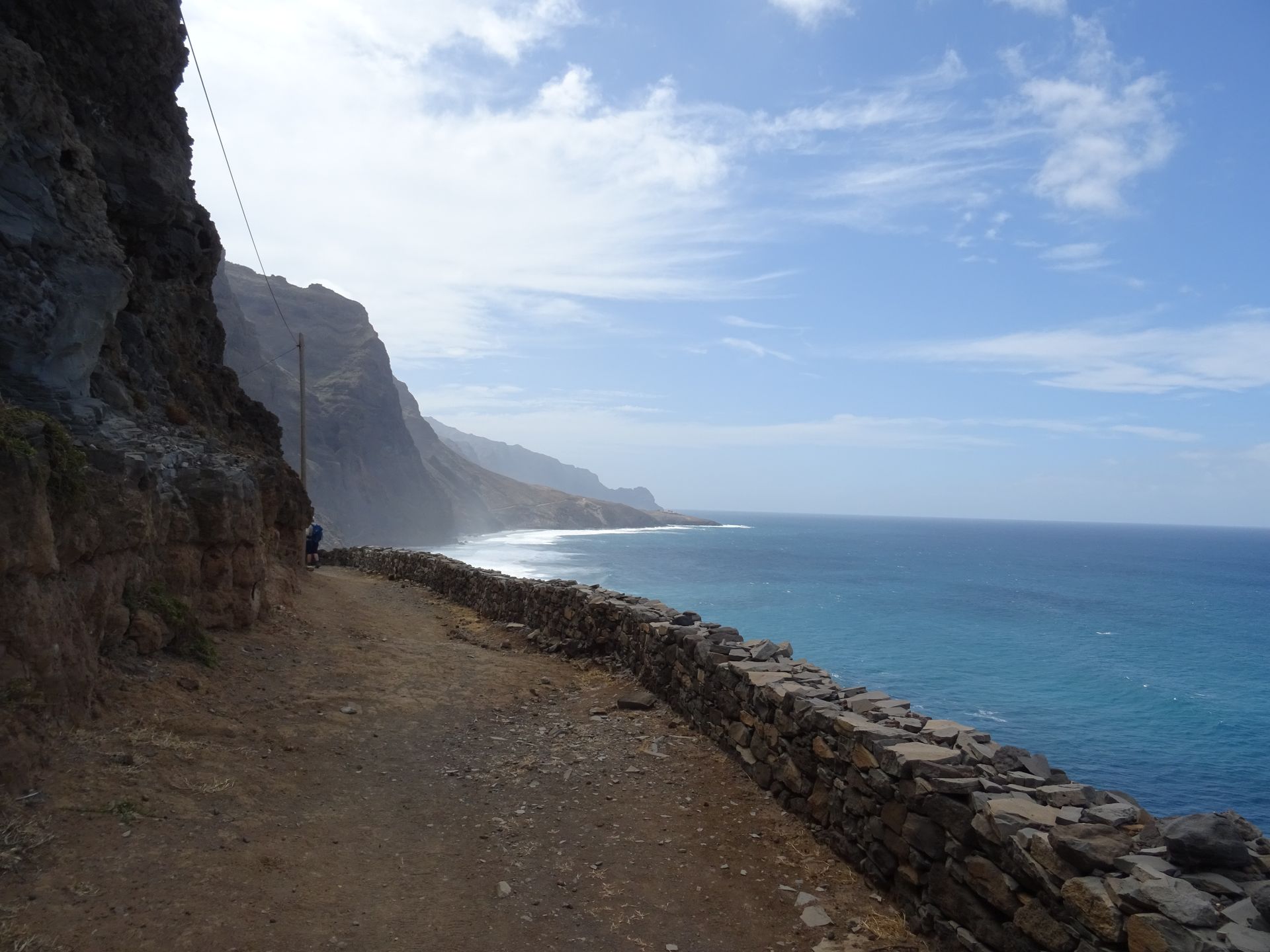 Gegen zehn kommt uns die Eselskarawane und ihr jugendlicher Treiber entgegen, die mir ja schon bekannt sind. Der Junge hat Kopfhörer im Ohr, eine Rute in der Hand und rennt hinter seinen Eseln den Berg herunter. Er bleibt kurz bei uns stehen, unterhält sich mit Marcus und rennt dann wieder hinter seinen Eseln, die bereits um die nächste Kehre verschwunden sind, den Berg hinauf, den wir gerade vorsichtig heruntergekommen sind. Marcus erklärt uns, dass die Esel Senhor Adalbert gehören, bei dem wir heute übernachten werden. Die Wegstrecke von Chã d´Igreja nach Figueiras ist für geübte Wanderer in sechs Stunden machbar, wobei die einzige Schwierigkeit in dem dauernden auf und ab besteht. Der Junge mit seinen Eseln läuft in vier Stunden hin und zurück und das gleiche am Nachmittag nochmal! Ich habe inzwischen die allergrößte Hochachtung vor der Leistung dieser zähen Insel- und Bergbewohner. Ich war immer schon fasziniert davon, wie man in allen Gebirgen, durch die ich bisher wanderte, die Wege und Pfade instand hält. Aber hier auf Santo Antão sind alle Verbindungswege zudem noch gepflastert und haben oft auch eine gemauerte Absturzsicherung.
