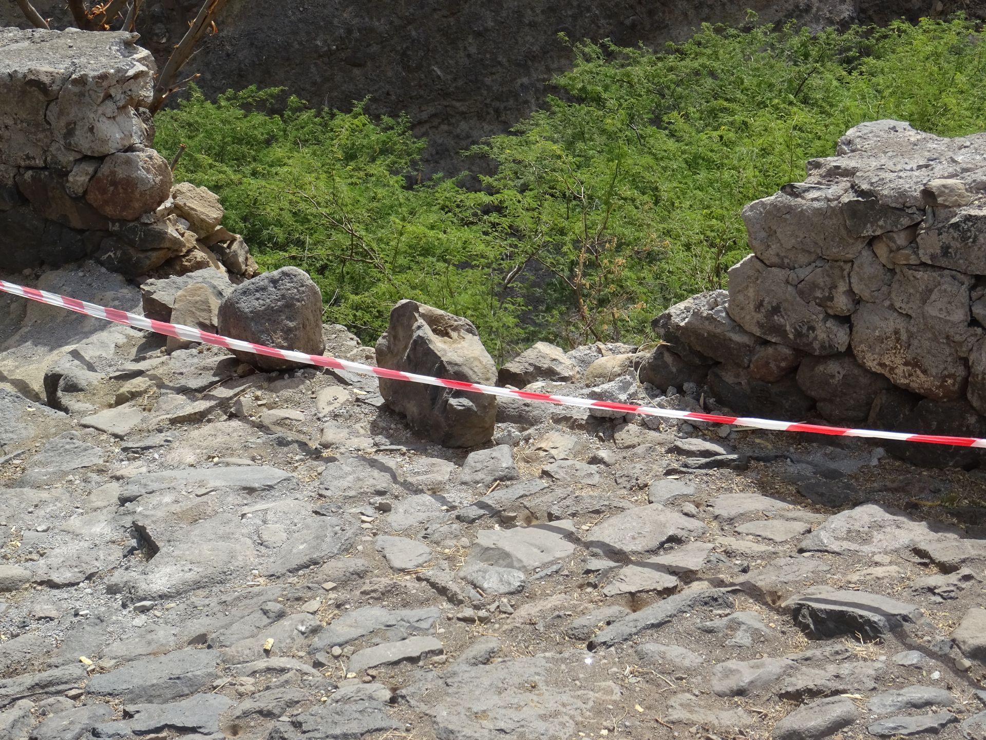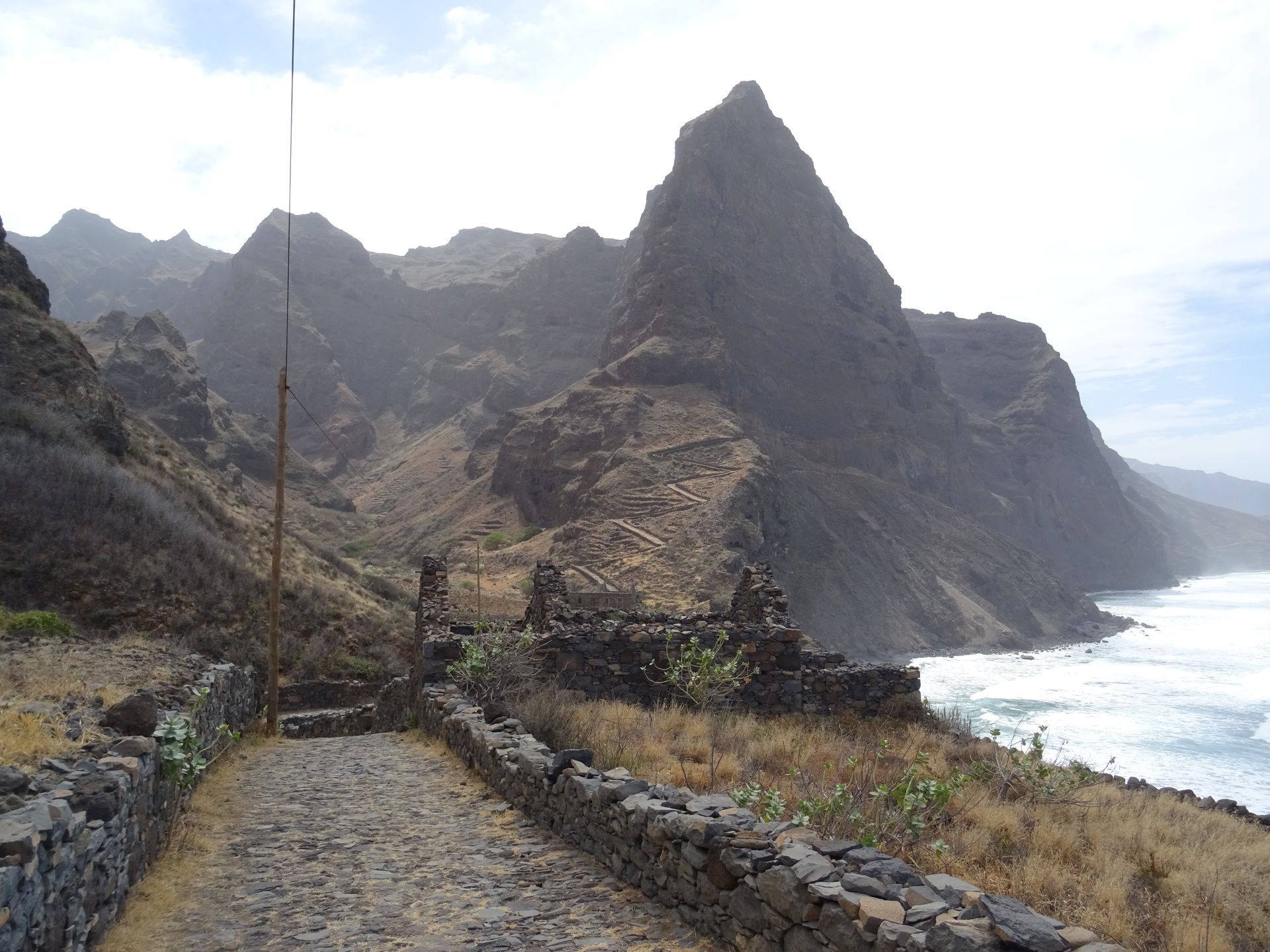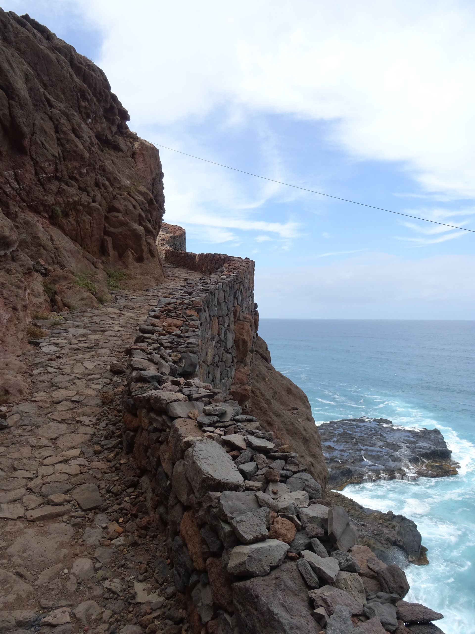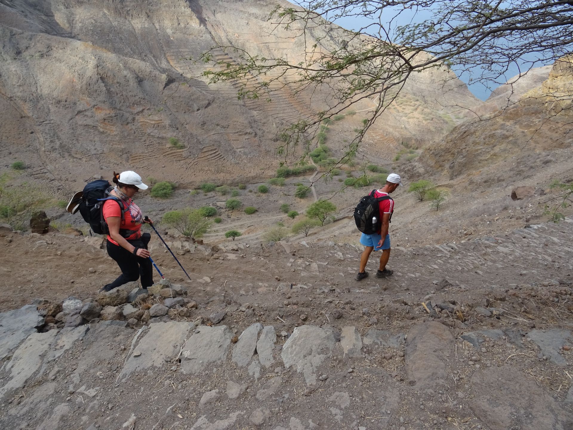 Gegen zehn kommt uns die Eselskarawane und ihr jugendlicher Treiber entgegen, die mir ja schon bekannt sind. Der Junge hat Kopfhörer im Ohr, eine Rute in der Hand und rennt hinter seinen Eseln den Berg herunter. Er bleibt kurz bei uns stehen, unterhält sich mit Marcus und rennt dann wieder hinter seinen Eseln, die bereits um die nächste Kehre verschwunden sind, den Berg hinauf, den wir gerade vorsichtig heruntergekommen sind. Marcus erklärt uns, dass die Esel Senhor Adalbert gehören, bei dem wir heute übernachten werden. Die Wegstrecke von Chã d´Igreja nach Figueiras ist für geübte Wanderer in sechs Stunden machbar, wobei die einzige Schwierigkeit in dem dauernden auf und ab besteht. Der Junge mit seinen Eseln läuft in vier Stunden hin und zurück und das gleiche am Nachmittag nochmal! Ich habe inzwischen die allergrößte Hochachtung vor der Leistung dieser zähen Insel- und Bergbewohner. Ich war immer schon fasziniert davon, wie man in allen Gebirgen, durch die ich bisher wanderte, die Wege und Pfade instand hält. Aber hier auf Santo Antão sind alle Verbindungswege zudem noch gepflastert und haben oft auch eine gemauerte Absturzsicherung.