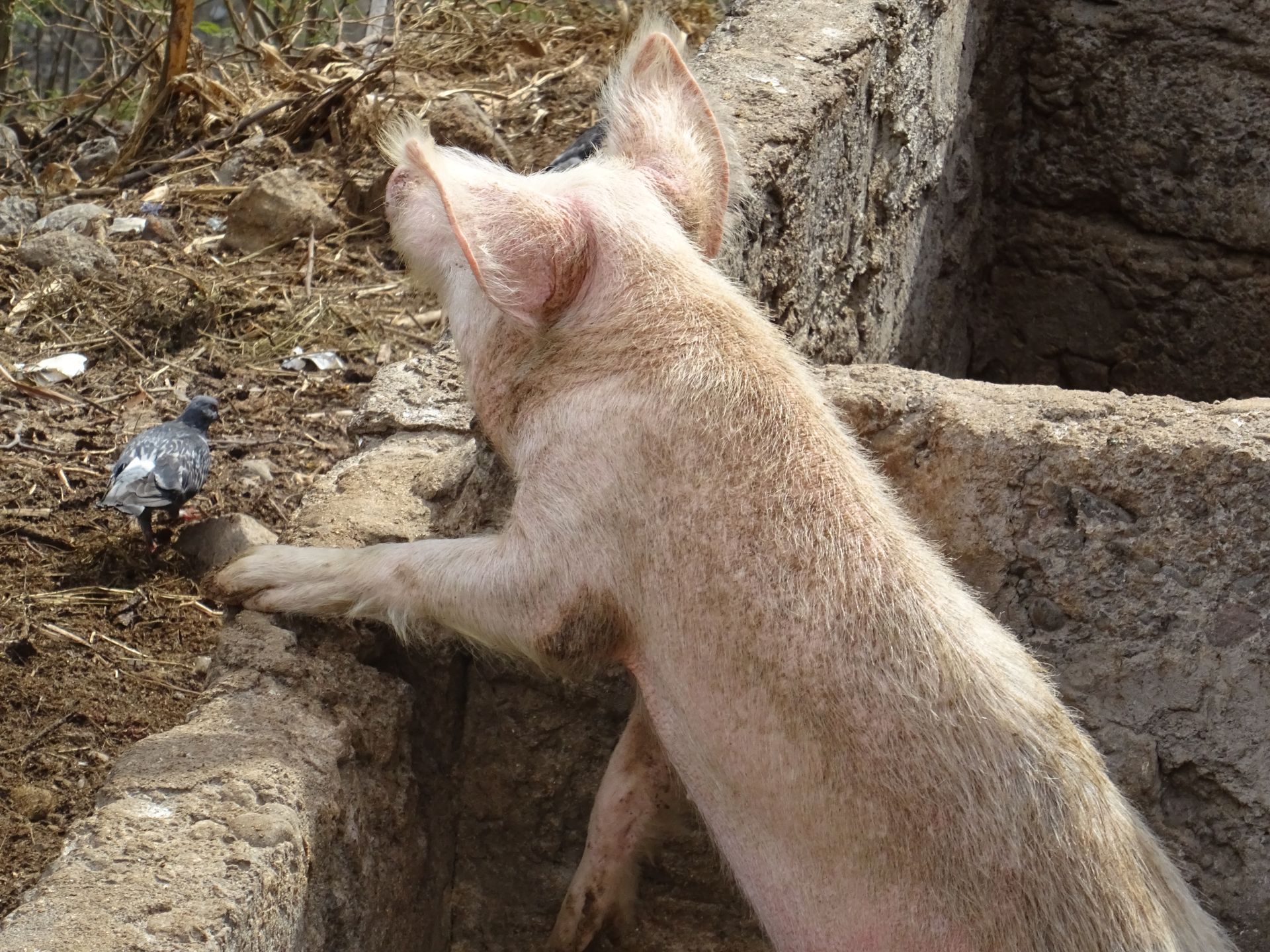 Die Route führt zunächst auf einer Straße nach Nordwesten aus dem Städtchen hinaus. Die letzten Gebäude der Siedlung sind die Schweineställe. Hier hält fast jede Familie ein Hausschwein, welches in einer gemieteten Box im kommunalen Schweinestall untergebracht ist. Wobei der Begriff Stall nicht ganz zutreffend ist. Es handelt sich einfach nur um eine Vielzahl aneinandergereihter Boxen von je zwei Quadratmetern ummauerter Fläche, mit Futtertrog, aber ohne Dach.