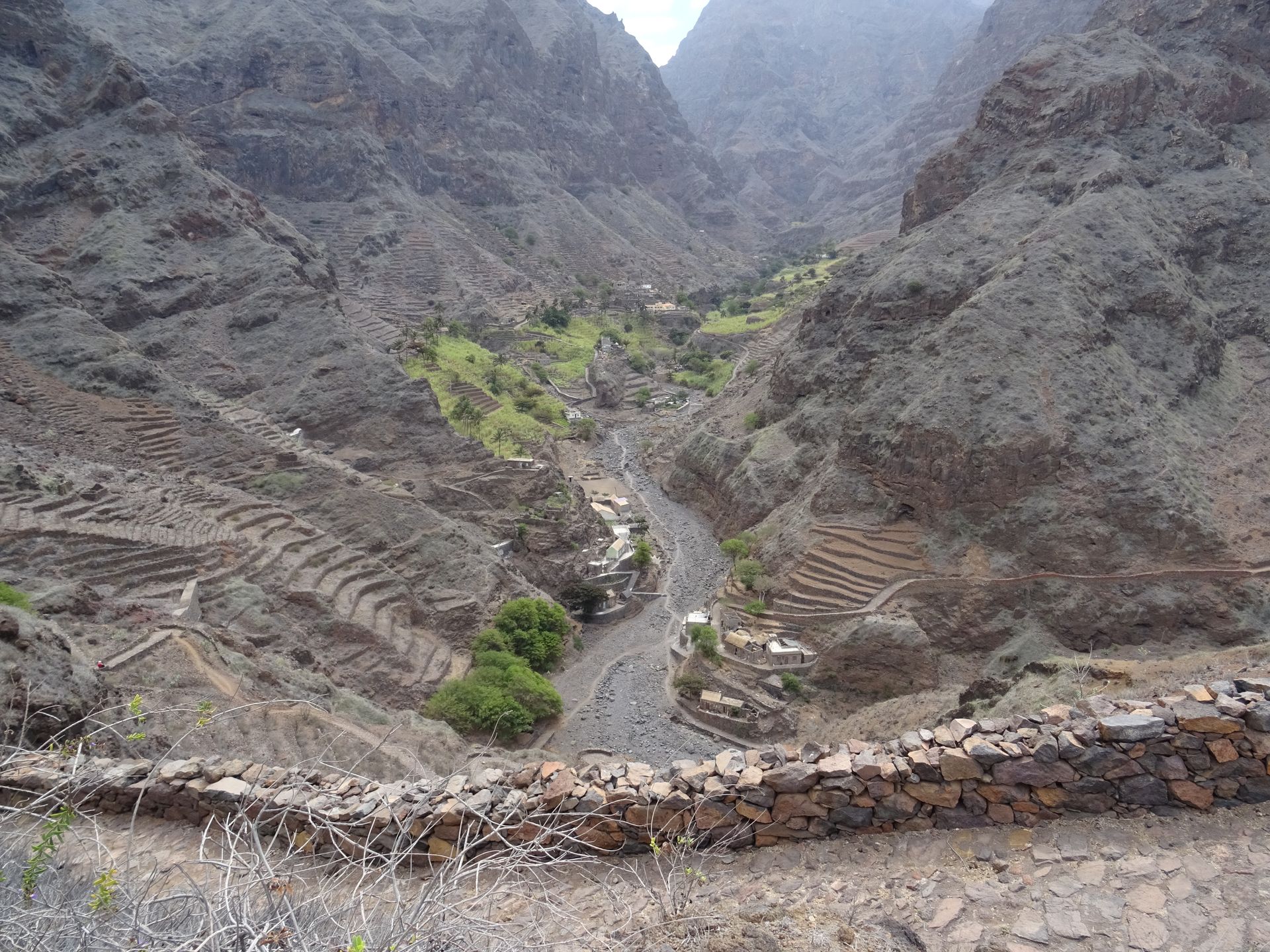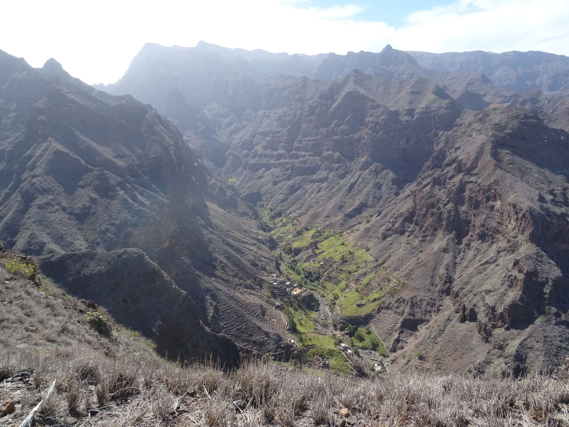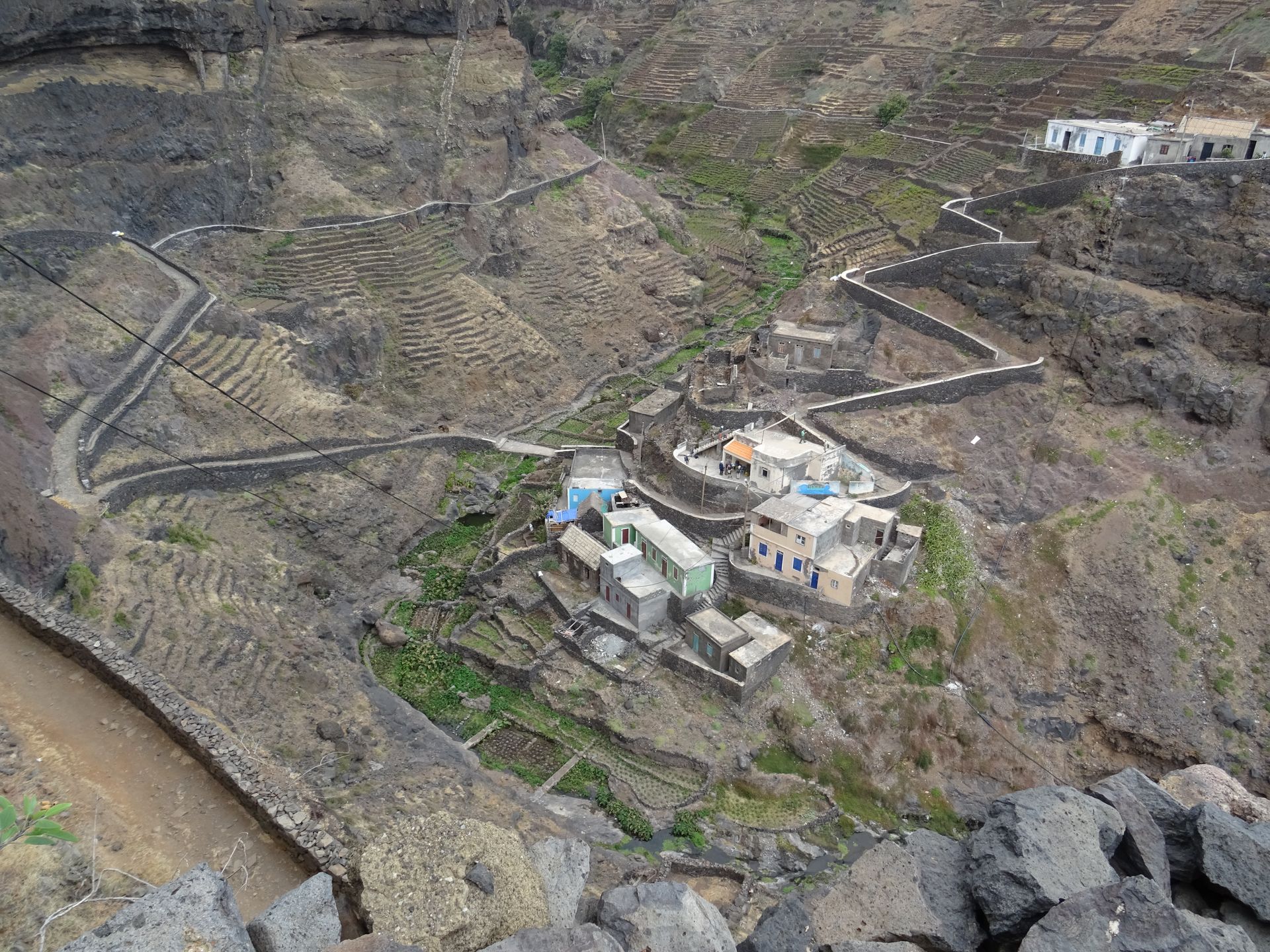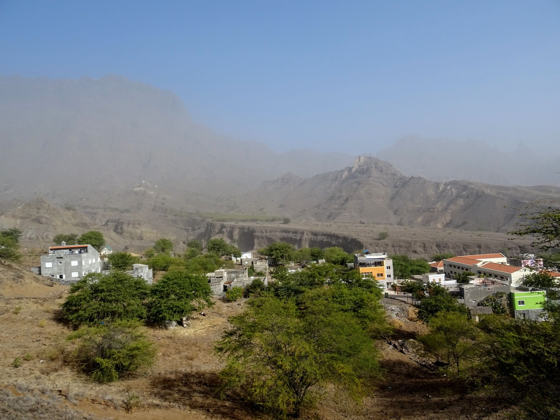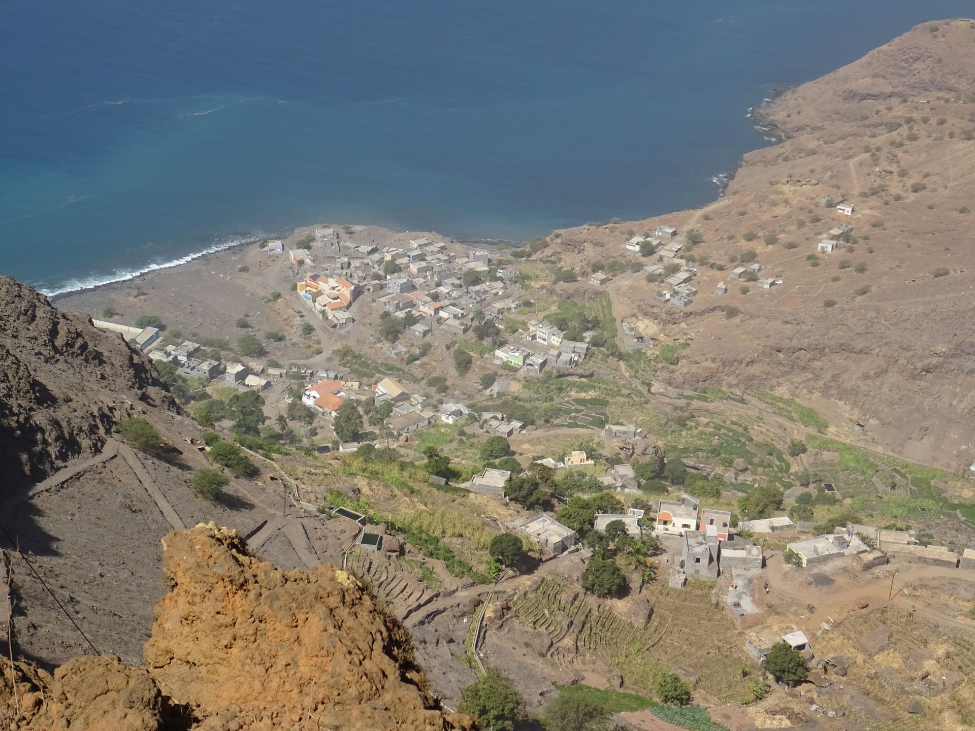 Wir durchqueren die Hochebene und halten direkt auf eine Stelle zu, wo das Plateau den Horizont zu berühren scheint. Der Fahrer lässt uns wieder aussteigen und geht mit uns zum Abgrund. Tief unter uns liegt ein grünes, fruchtbares Tal. Ein Steig führt hier hinunter, schlängelt sich zunächst durch die Steilwand und dann durch ein Dorf, das auf den Felsen erbaut ist. Weiter unten erkennt man eine Straße, die zu einer weiteren Ansiedlung und zum Meer führt. Tarrafal de Monte Trigo liegt uns zu Füßen. Eineinhalb Stunden später treffen wir unten ein und im Nachhinein frage ich mich, ob es nicht klüger gewesen wäre, zu Fuß zu gehen und den Steig nach unten zu nehmen. Die Schaukelei im Auto geht nämlich echt auf die Knochen und ich schlage mir mein Knie noch ein paarmal an der Tür an.