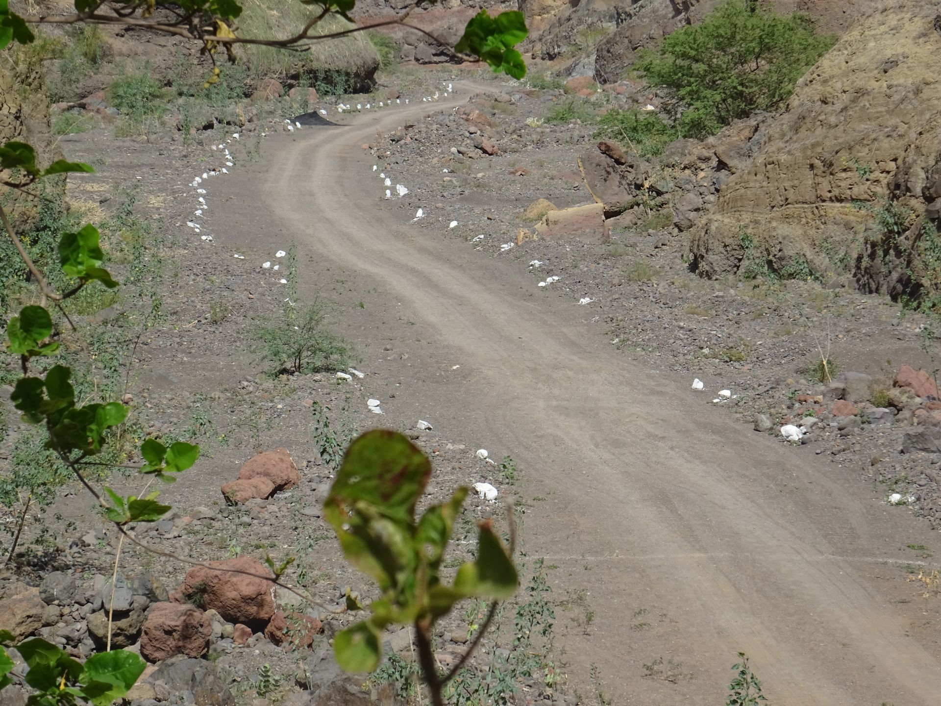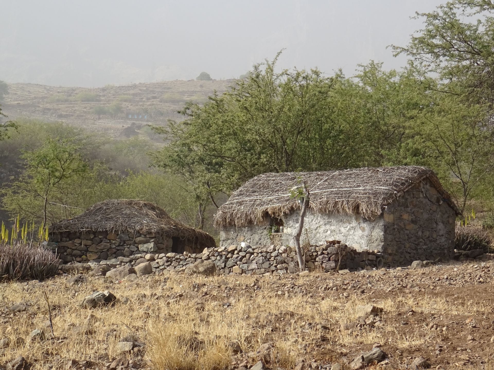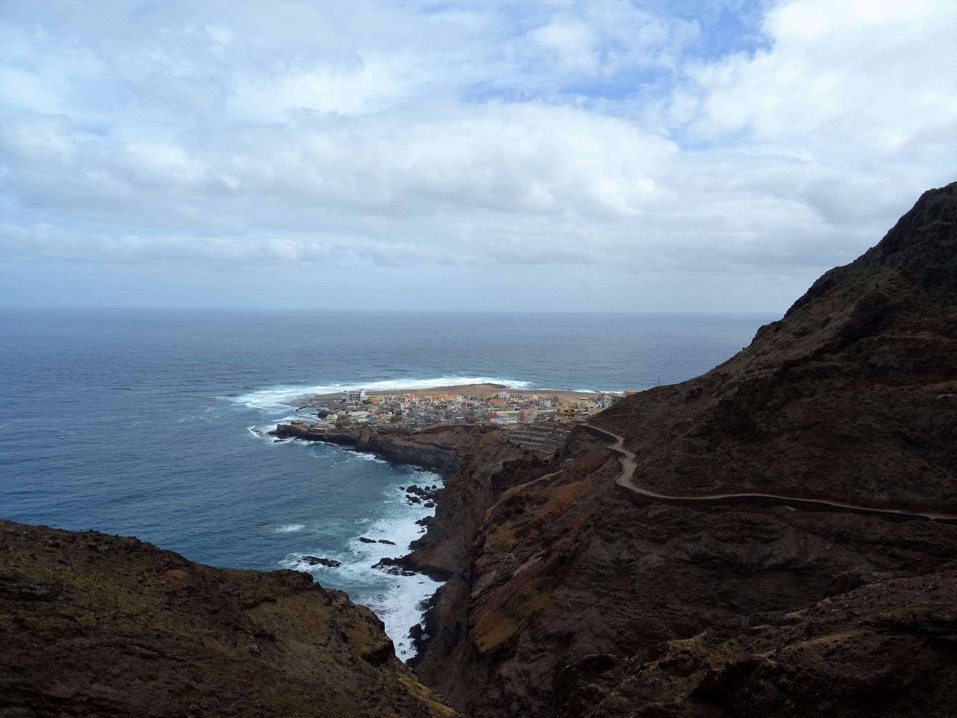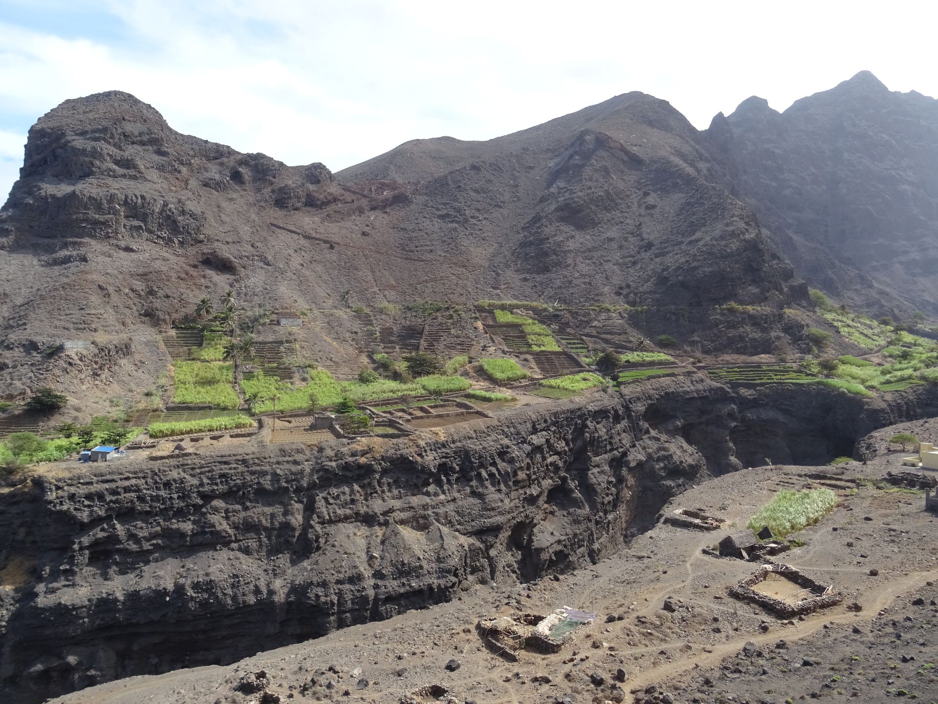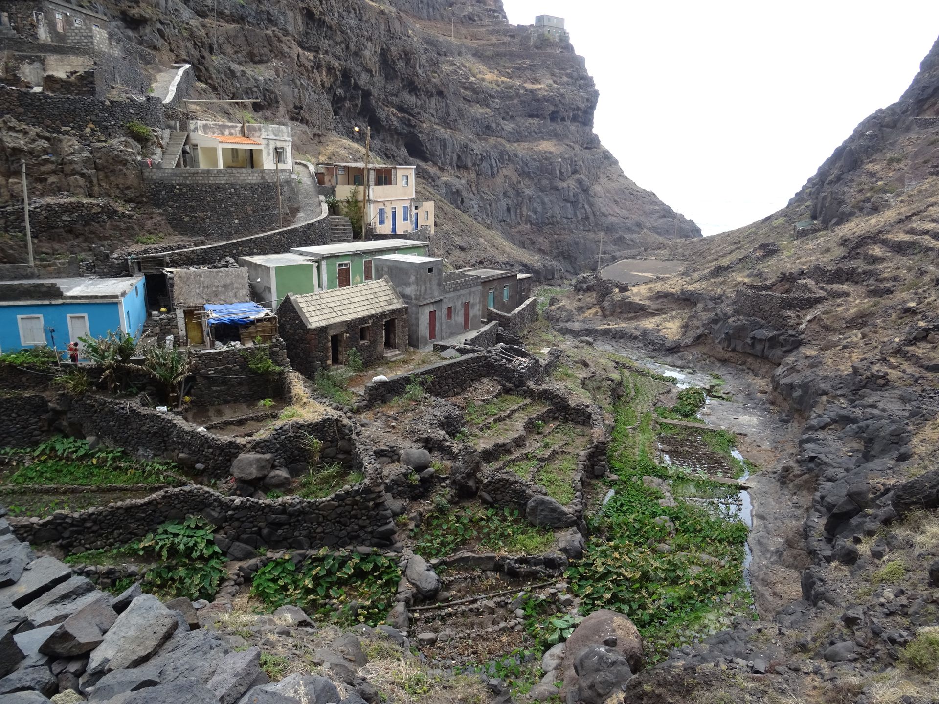 Wir durchqueren die Hochebene und halten direkt auf eine Stelle zu, wo das Plateau den Horizont zu berühren scheint. Der Fahrer lässt uns wieder aussteigen und geht mit uns zum Abgrund. Tief unter uns liegt ein grünes, fruchtbares Tal. Ein Steig führt hier hinunter, schlängelt sich zunächst durch die Steilwand und dann durch ein Dorf, das auf den Felsen erbaut ist. Weiter unten erkennt man eine Straße, die zu einer weiteren Ansiedlung und zum Meer führt. Tarrafal de Monte Trigo liegt uns zu Füßen. Eineinhalb Stunden später treffen wir unten ein und im Nachhinein frage ich mich, ob es nicht klüger gewesen wäre, zu Fuß zu gehen und den Steig nach unten zu nehmen. Die Schaukelei im Auto geht nämlich echt auf die Knochen und ich schlage mir mein Knie noch ein paarmal an der Tür an.