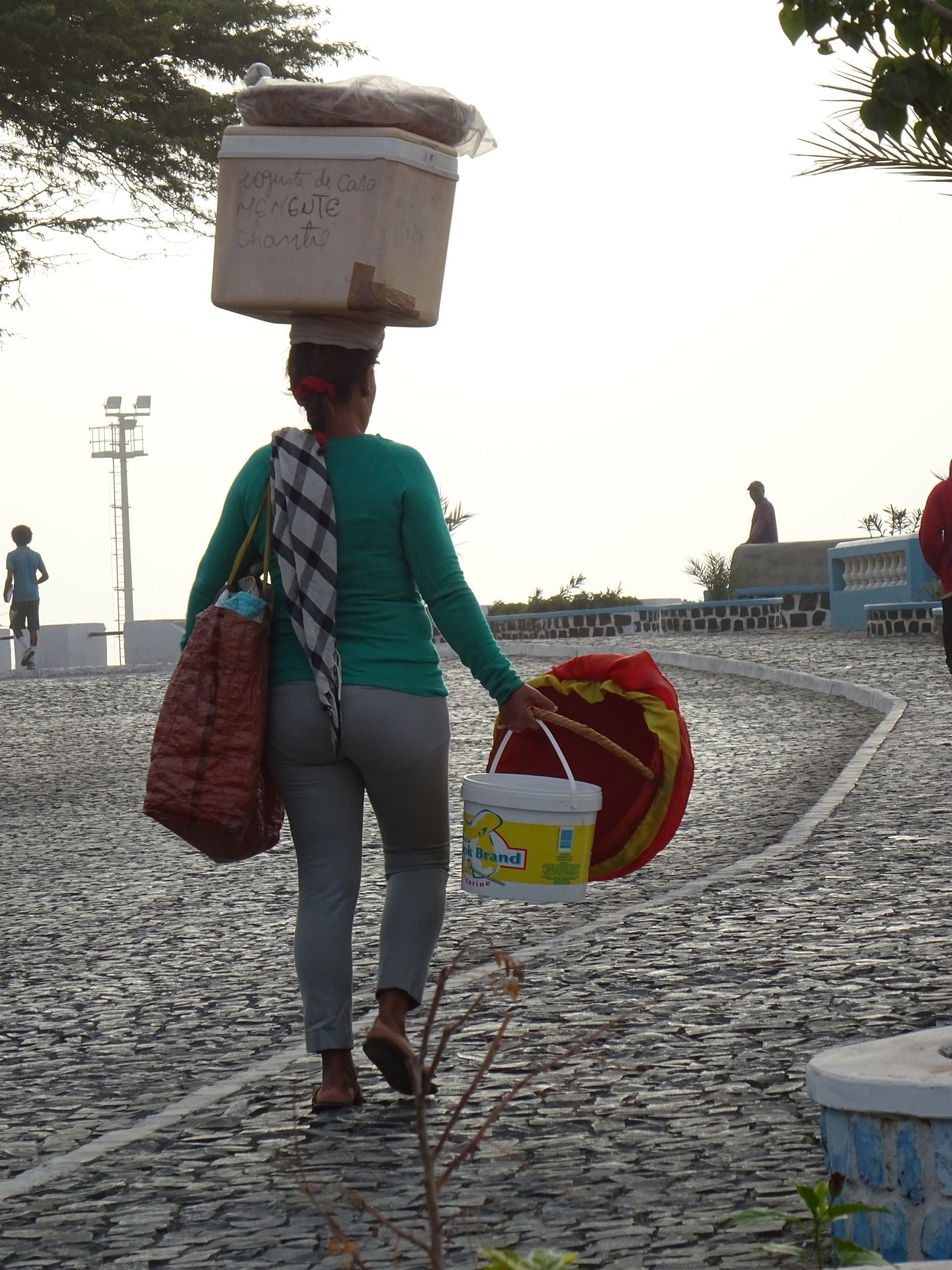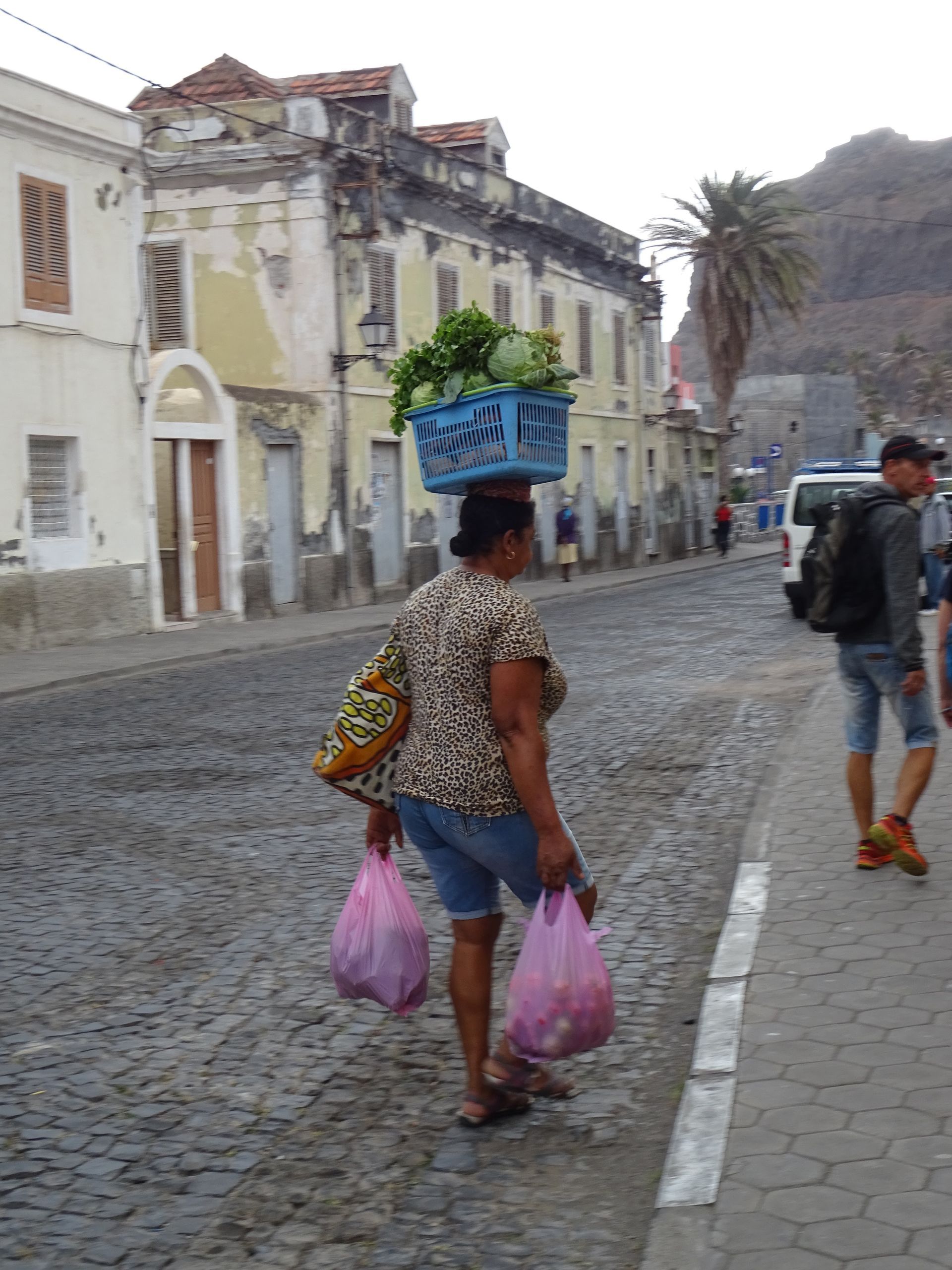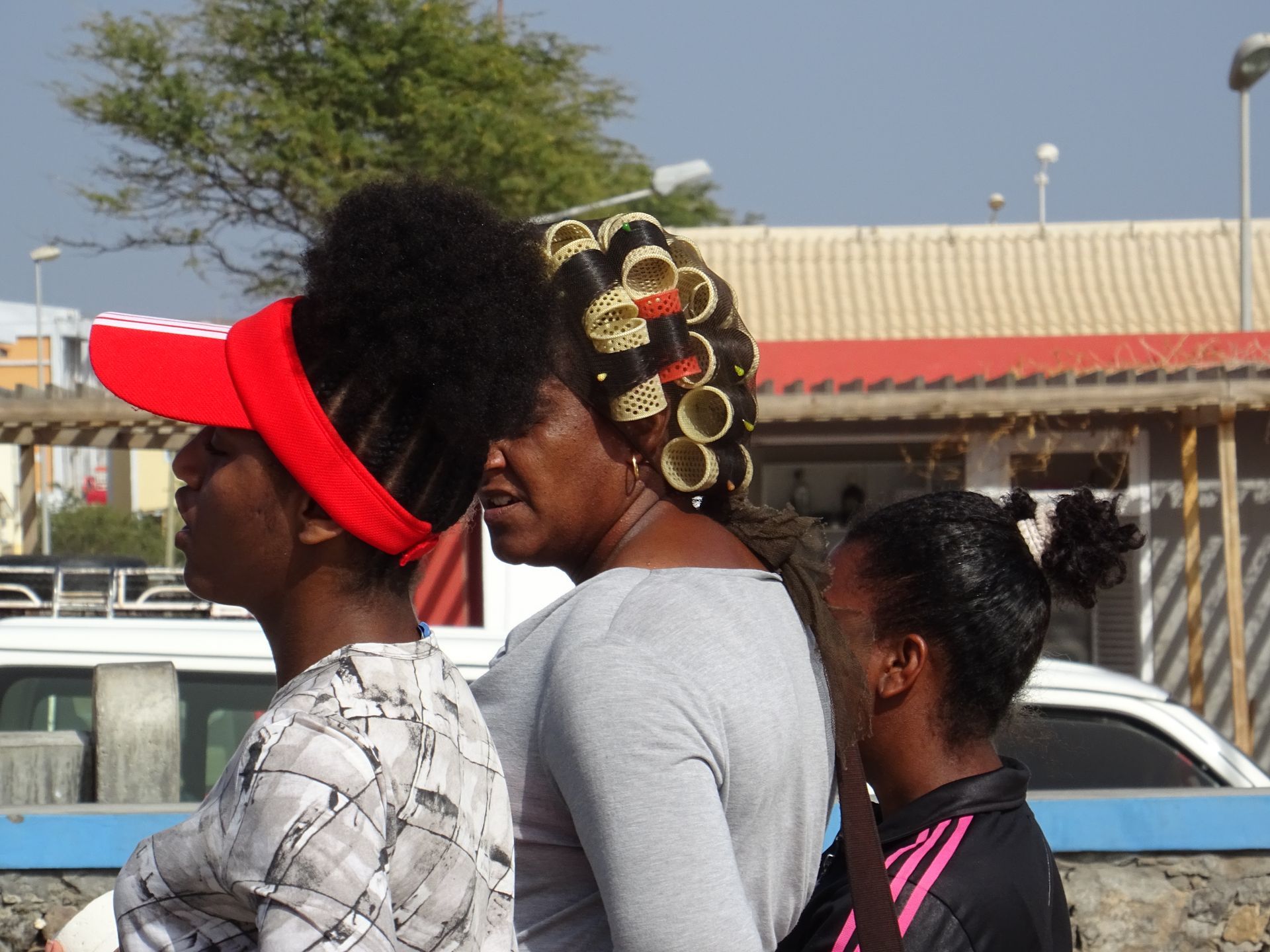 Gleich darauf kommt auch schon der Aluguer, der uns nach Porto Novo bringt. Suzette fährt auch mit. Sie will nach São Vicente rüber und dort eines von Nelsons Autos abholen, das er seinem Schwager geliehen hat. Sie fährt mit der Katamaran-Fähre und will um 12:30 Uhr wieder zurück sein und uns dann am Restaurant Antilhas, gleich neben dem Hafen, abholen. Wir steigen am Hafen aus, da hier Endstation ist und unser Aluguer sich in der Haltestelle einreiht. Am Hafen ist richtig was los. Händler bieten ihre Waren an, Frauen mit riesigen Lockenwicklern in den Haaren stehen am Straßenrand und verkaufen Obst und Gemüse, Taxifahrer warten auf Fahrgäste.