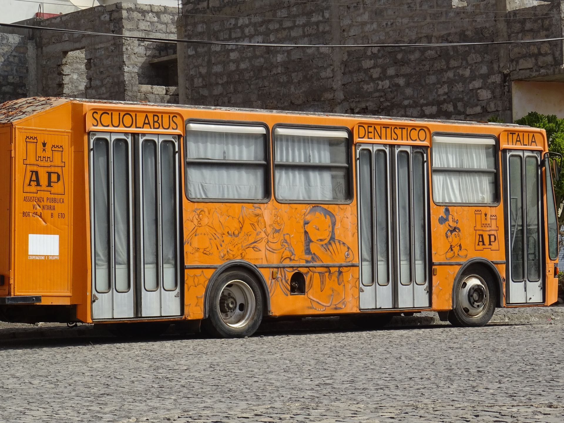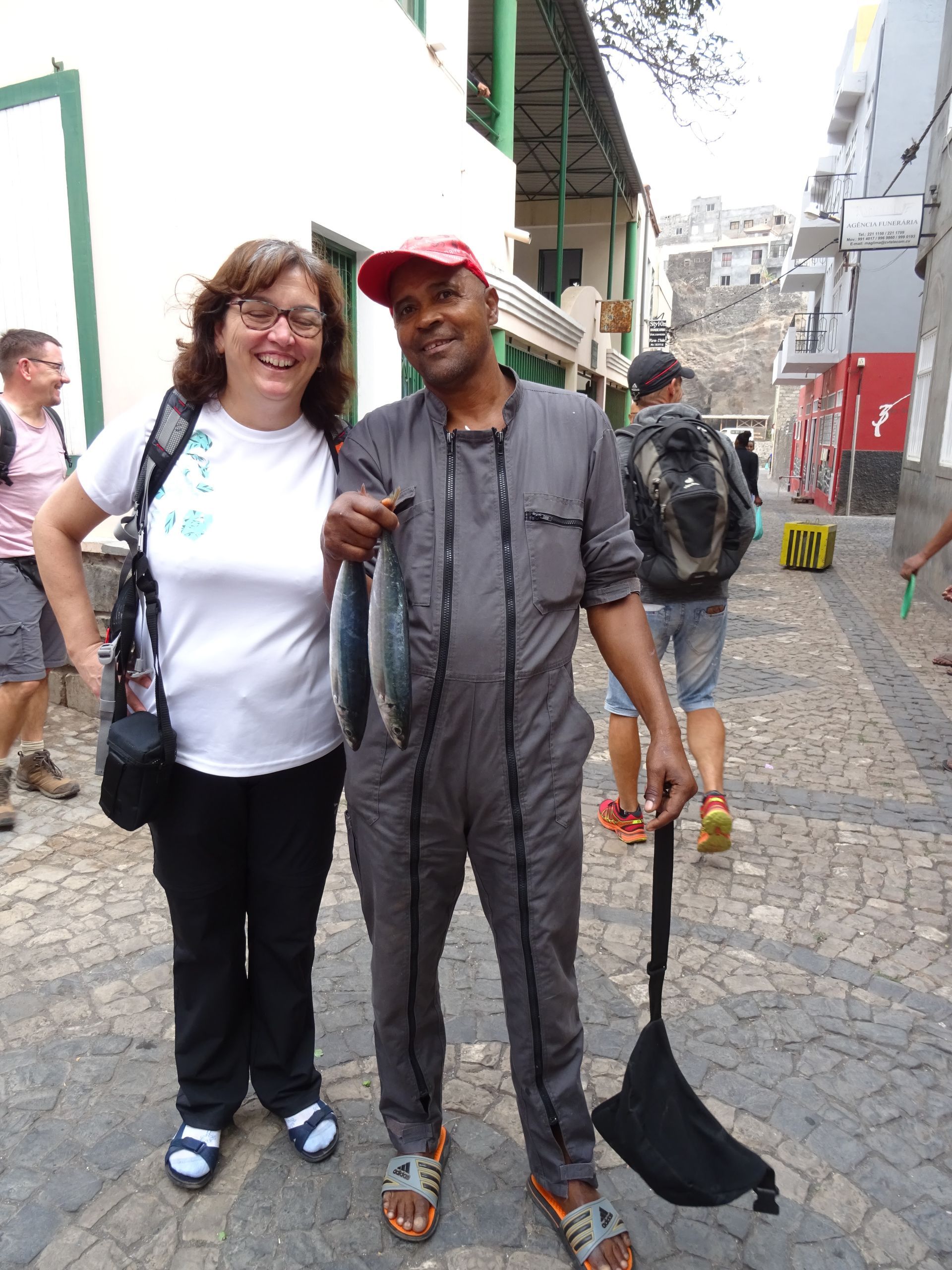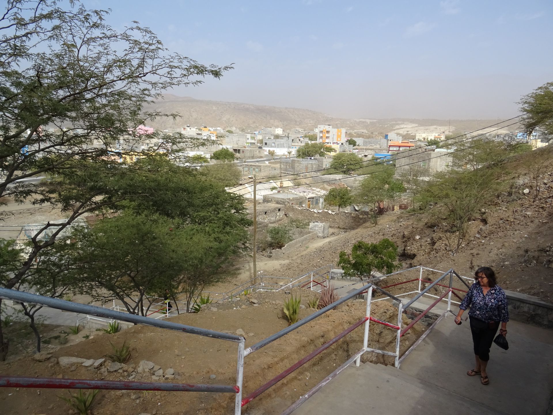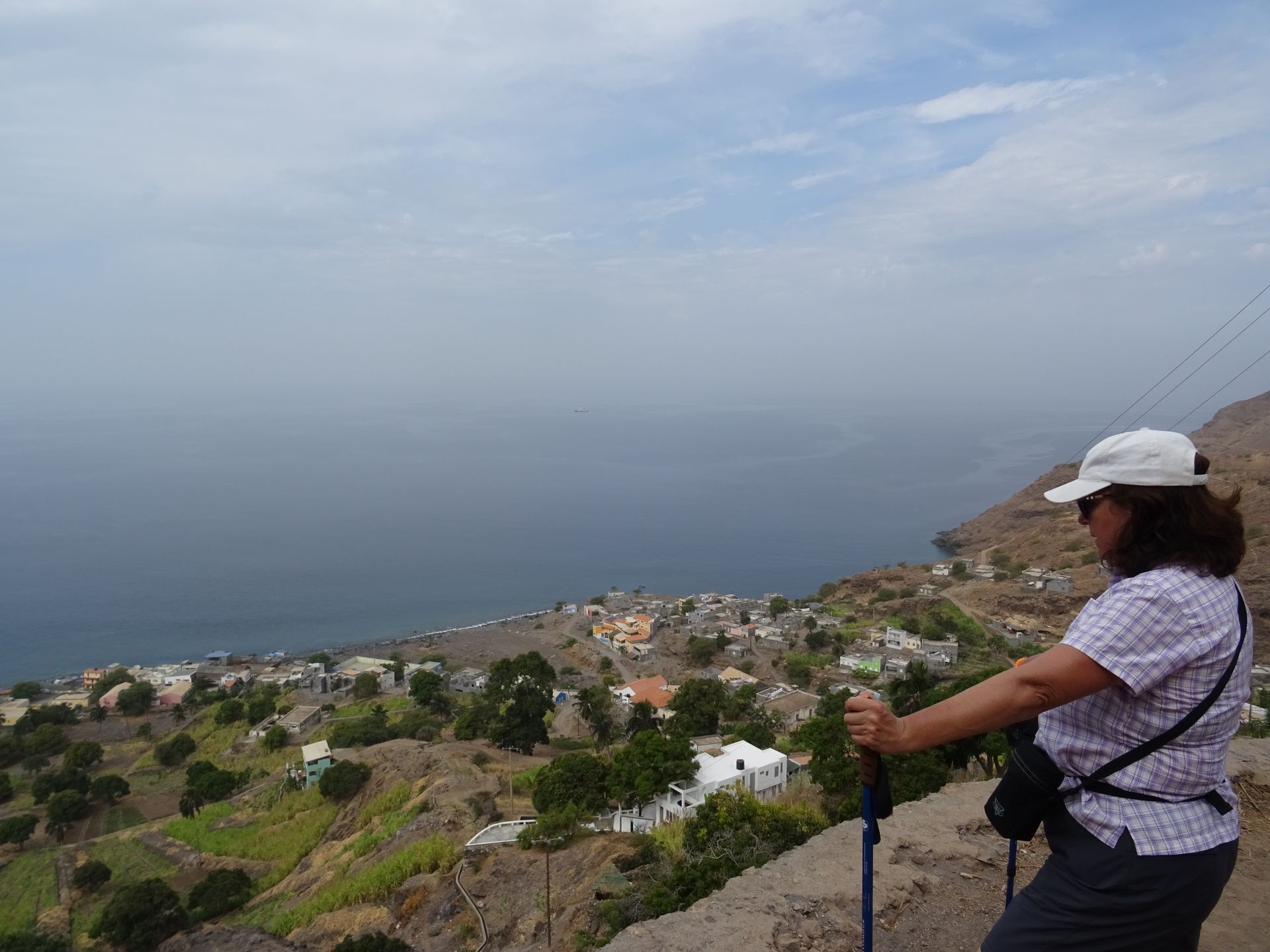 Die Fahrt zieht sich wieder stundenlang hin und erst als wir oben am Aussichtspunkt die gepflasterte Straße erreichen, kommen wir etwas schneller voran. (Anm. 2023: Inzwischen ist die Straße fertiggestellt und die Fahrt von Tarrafal de Monte Trigo bis Porto Novo dauert nur noch eineinhalb Stunden.) Wir setzen die Lady mit ihrem Gebiss-Döschen beim Zahnarzt ab und sie drückt Claudia 50 € in die Hand. Claudia sagt Danke und behält das Wechselgeld.