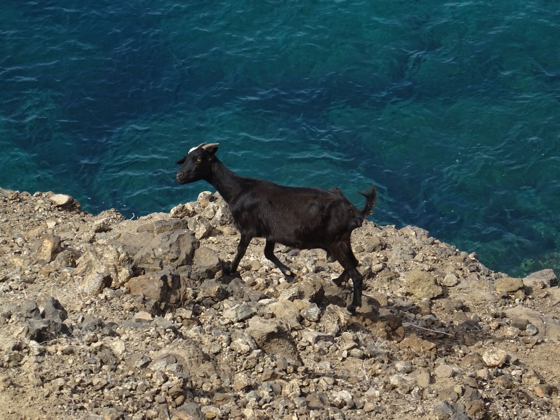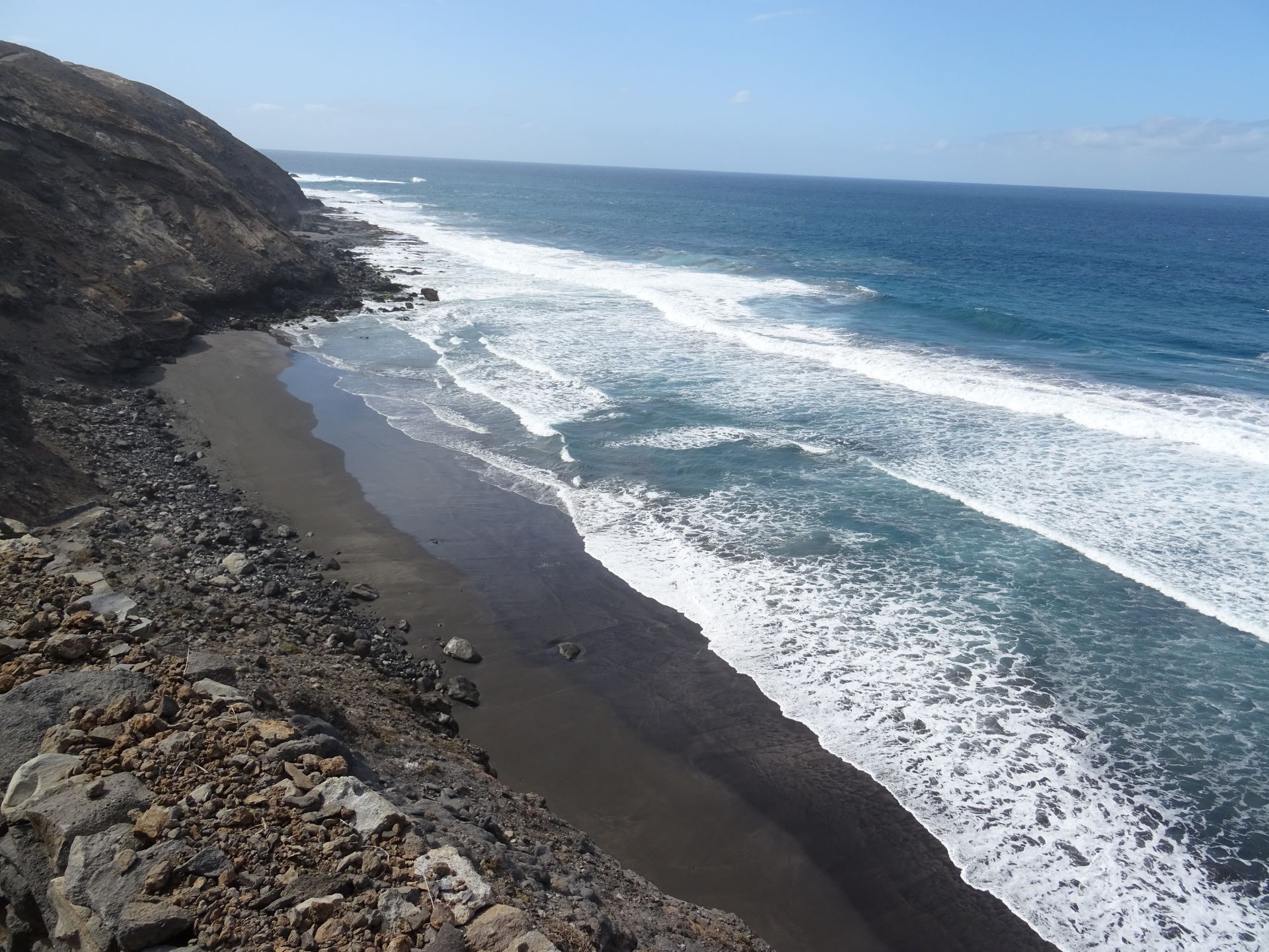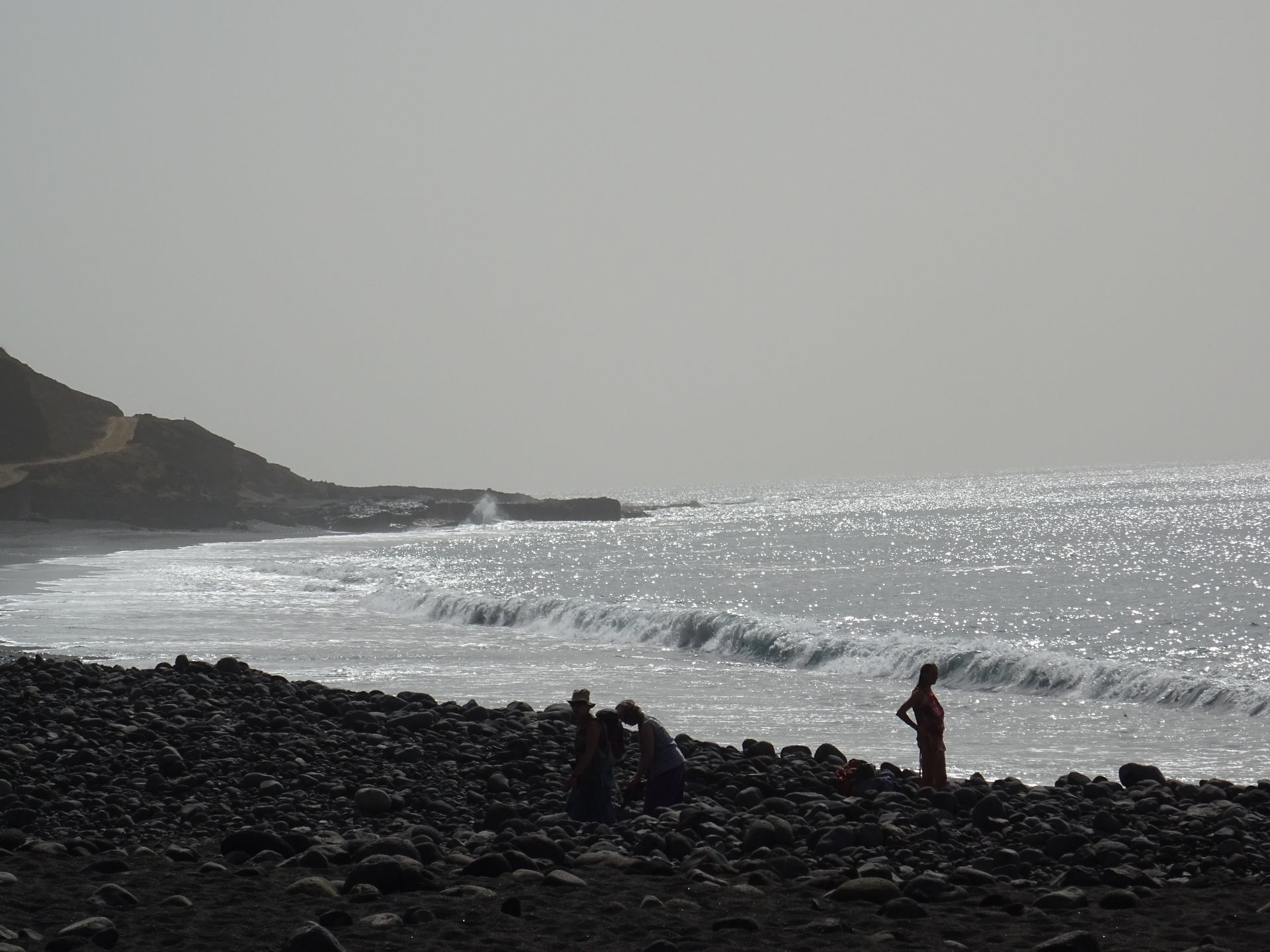 Wir gehen lediglich noch eine gute Stunde auf diesem Weg oberhalb der Steilküste entlang. Immer wieder treffen wir auf Ziegen, die sich ihr kärgliches Futter zwischen den Steinen suchen. Das Wasser ist tiefblau und bildet einen starken Kontrast zum graubraunen Ton der Felsen. Uns zieht es zurück zum Strand und wir treffen wieder zusammen mit den Fischern am „Mar Tranquilidade“ ein. Den Nachmittag verbringen wir teils im schwarzen Lava-Sand liegend, teils auf einem der Liegestühle unter dem schützenden Dach. Ins Wasser traue ich mich zunächst nicht, doch am späten Nachmittag wage ich es doch. Hier direkt vor der Unterkunft schwappen die Wellen nicht gar so sehr an Land. Außerdem kommt man hier auch deutlich schneller in tieferes Wasser und muss nicht so weit hinauswaten. Nach wenigen Metern kann ich bereits schwimmen, bleibe aber immer schön in Ufernähe.