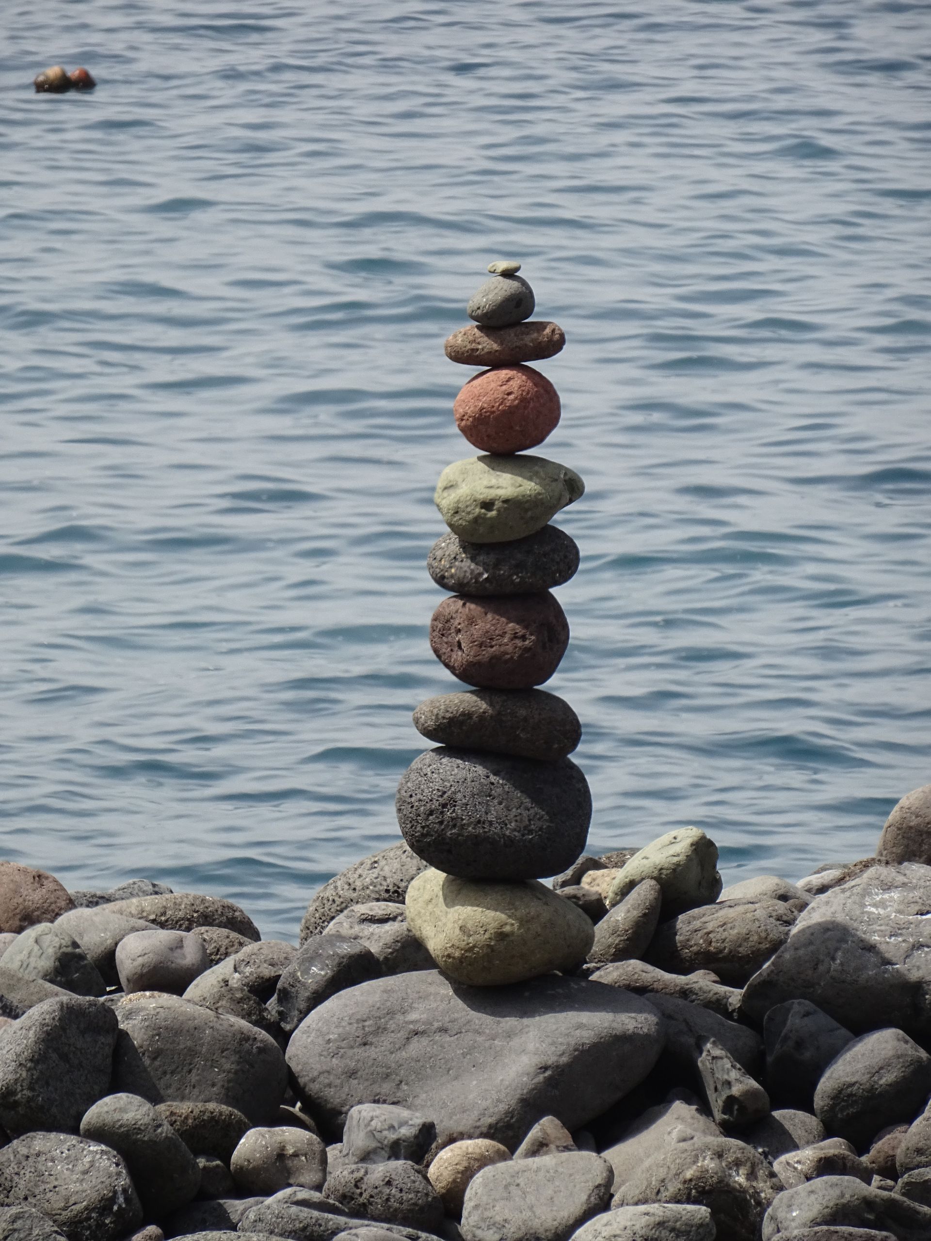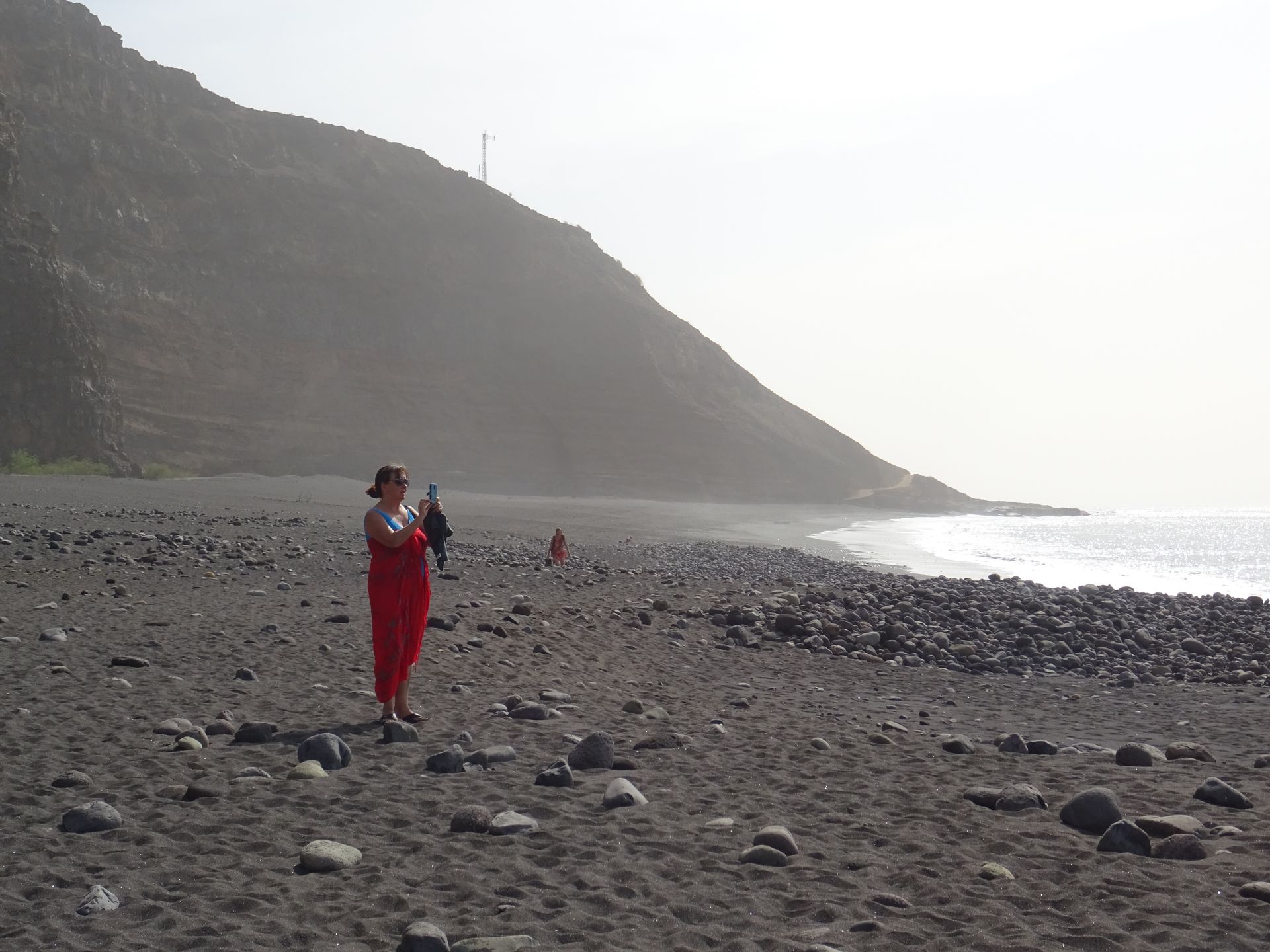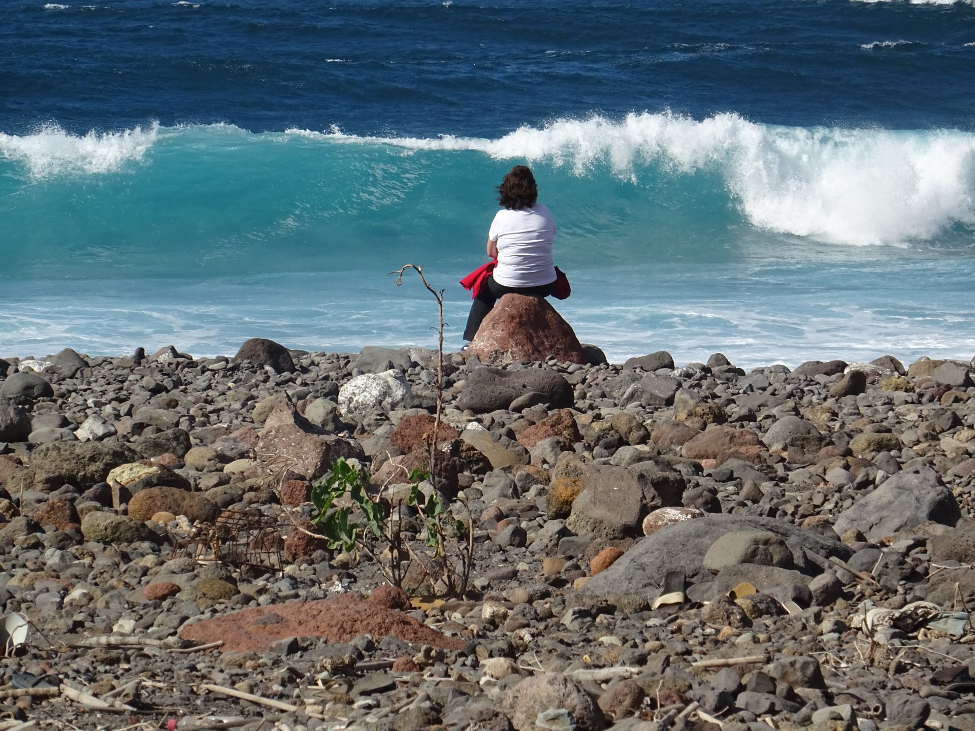 Wir gehen lediglich noch eine gute Stunde auf diesem Weg oberhalb der Steilküste entlang. Immer wieder treffen wir auf Ziegen, die sich ihr kärgliches Futter zwischen den Steinen suchen. Das Wasser ist tiefblau und bildet einen starken Kontrast zum graubraunen Ton der Felsen. Uns zieht es zurück zum Strand und wir treffen wieder zusammen mit den Fischern am „Mar Tranquilidade“ ein. Den Nachmittag verbringen wir teils im schwarzen Lava-Sand liegend, teils auf einem der Liegestühle unter dem schützenden Dach. Ins Wasser traue ich mich zunächst nicht, doch am späten Nachmittag wage ich es doch. Hier direkt vor der Unterkunft schwappen die Wellen nicht gar so sehr an Land. Außerdem kommt man hier auch deutlich schneller in tieferes Wasser und muss nicht so weit hinauswaten. Nach wenigen Metern kann ich bereits schwimmen, bleibe aber immer schön in Ufernähe.