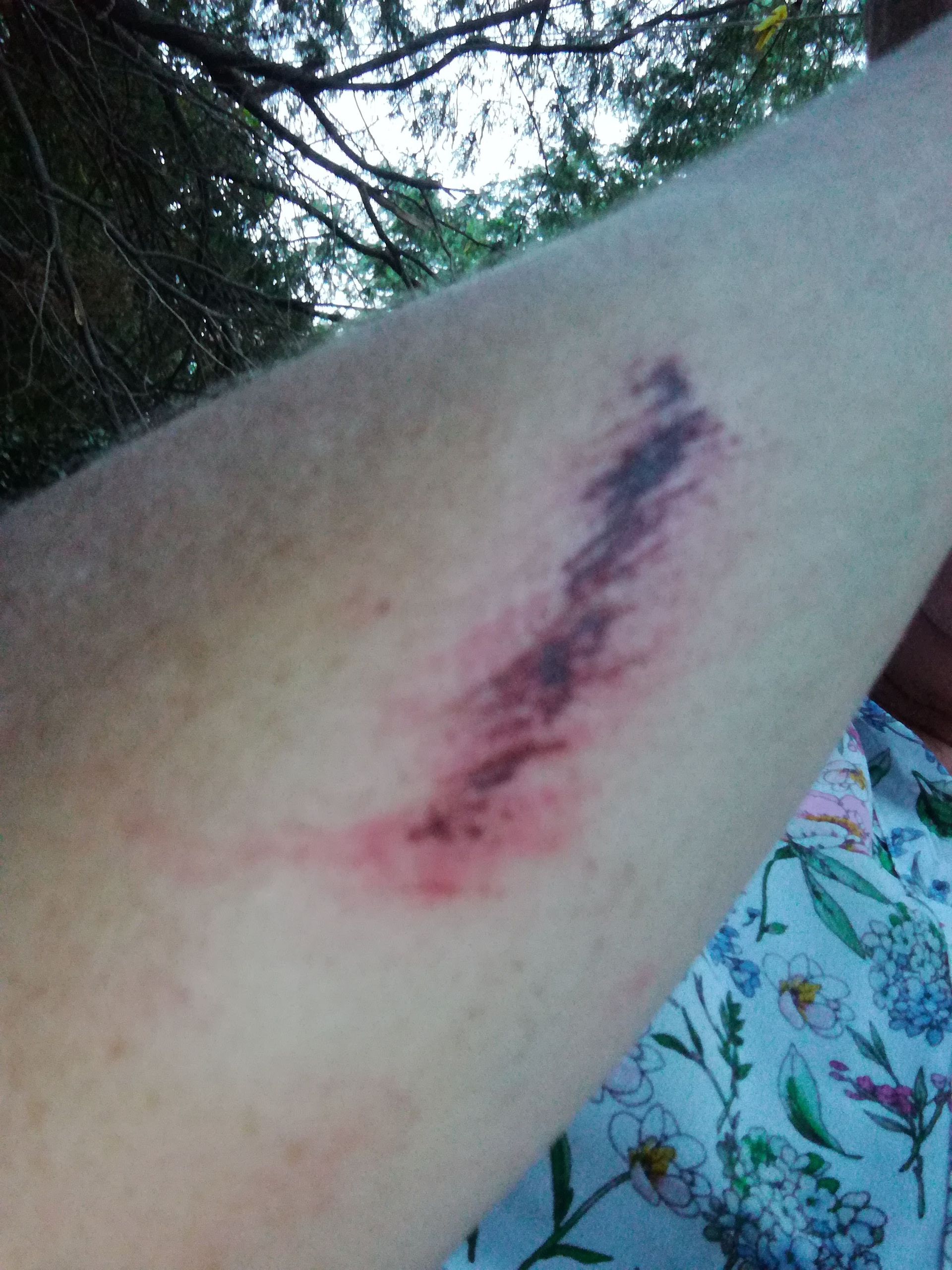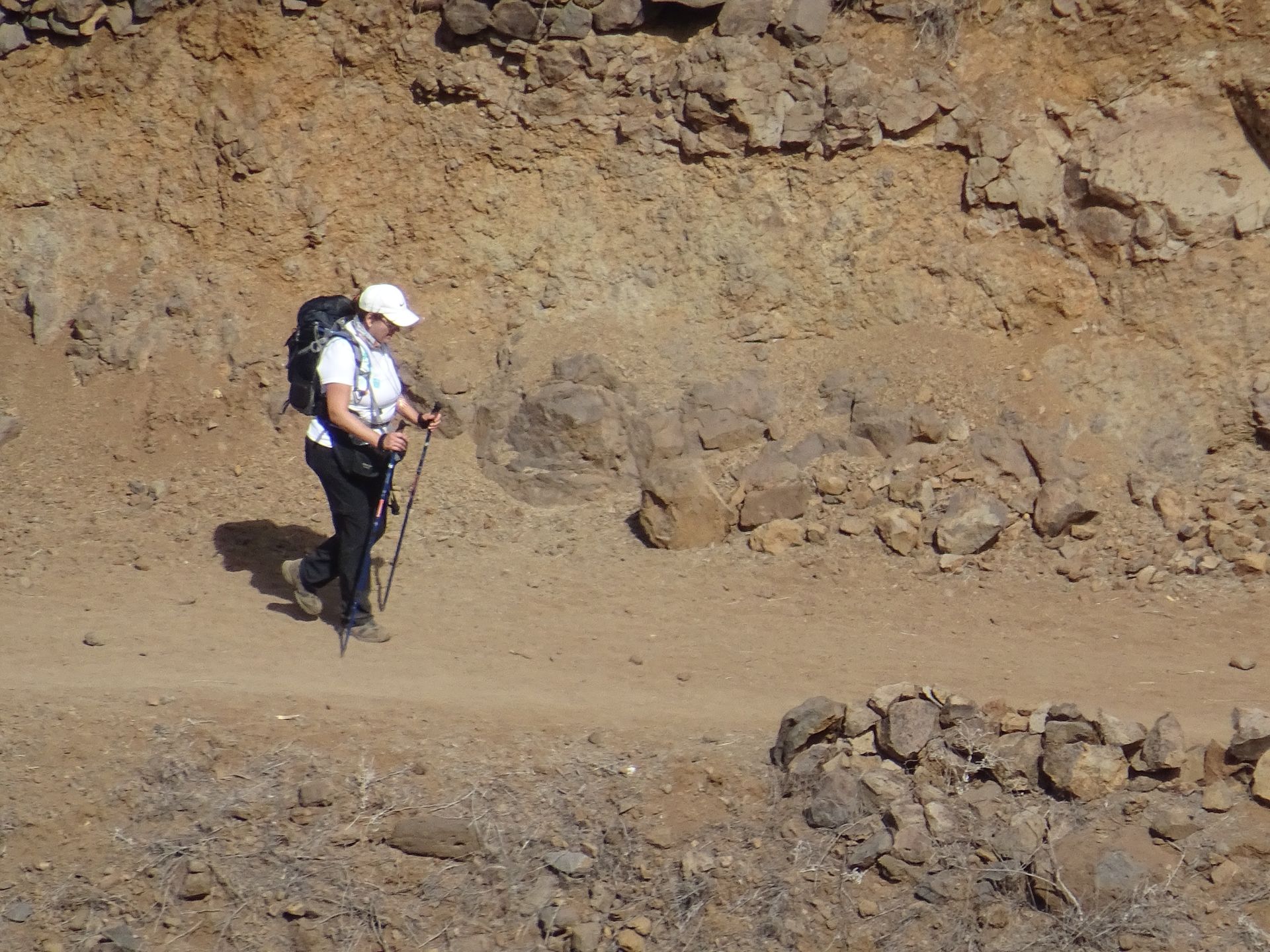 Es ist heiß heute und die Umgebung bietet keinerlei Schatten. Meist ist der Pfad in gewohnter Manier gepflastert, doch hier und da gilt es, größere Felsbrocken zu überwinden, oder der Weg führt über Kies und Geröll. Einmal teilt sich der Pfad und Claudia läuft rechts weiter. Ich bin zwar für links, folge ihr jedoch. Nach etwa 200 Metern erkennen wir, dass es hier nicht weitergeht und Claudia kehrt um. Als ich ihr folge, kann ich meine Schadenfreude darüber, dass ich mal wieder recht hatte, nicht verbergen. Doch die Strafe dafür folgt auf dem Fuß: Ich achte nicht auf den Weg, stolpere über einen Stein, falle und rutsche auf Hintern und rechtem Unterarm den Pfad hinunter. Als ich mich mühsam wieder aufrapple, habe ich eine ziemlich große, blutige Schramme am Unterarm. Wie gut, dass ich beim Wandern nie ohne Erste-Hilfe-Kit unterwegs bin. Der Arm wird verbunden und die Wanderung geht weiter.