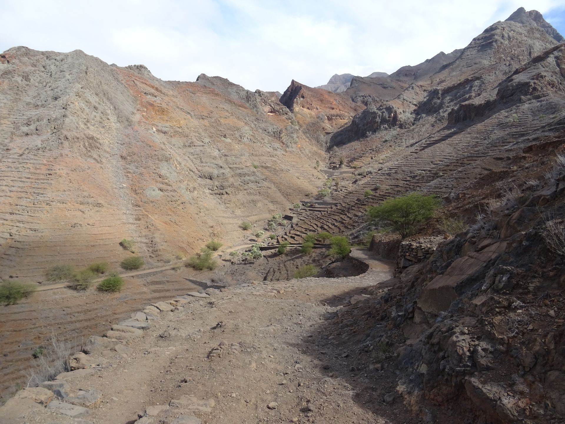 Gemächlich steigen wir durch das Dorf in vielen, vielen Serpentinen ein Stück weit hinunter, um dann an der anderen Seite des Einschnittes wieder auf gleiche Höhe hinaufzusteigen. Heute sind allerdings die Auf- und Abstiege nicht mehr ganz so steil wie gestern und selbst Claudia sagt, sie findet es heute nicht mehr ganz so anstrengend. Im Tal von Figueiras wird intensiv Landwirtschaft betrieben. Überall arbeiten Männer auf den Terrassen-Feldern. Auch Kinder sieht man arbeiten, bevor sie sich auf den Weg zur Schule machen. Marcus sagt, im Tal hier gibt es 150 Kinder und daher auch zwei Schulen, in denen sie in jeweils zwei Gruppen unterrichtet werden.