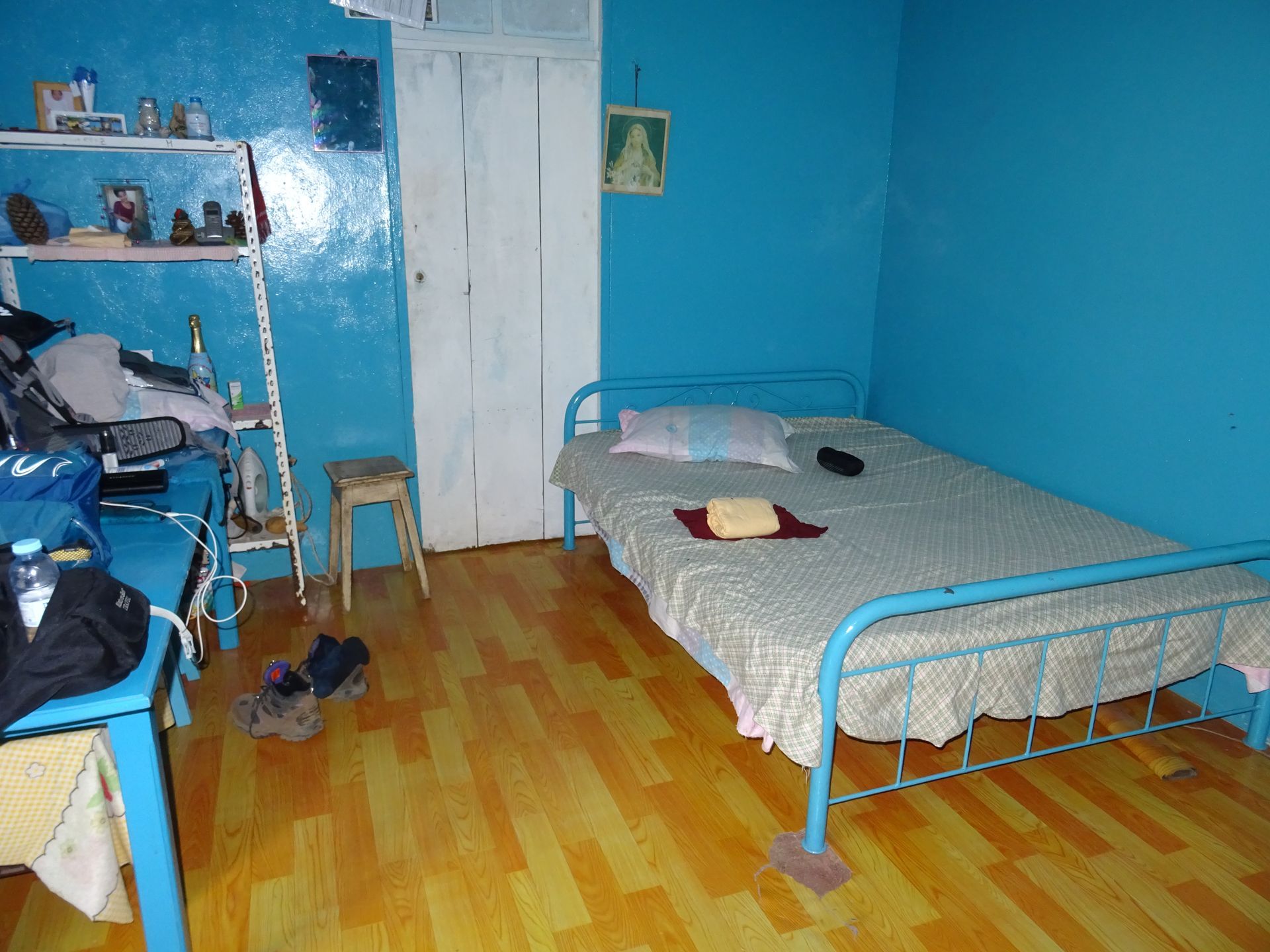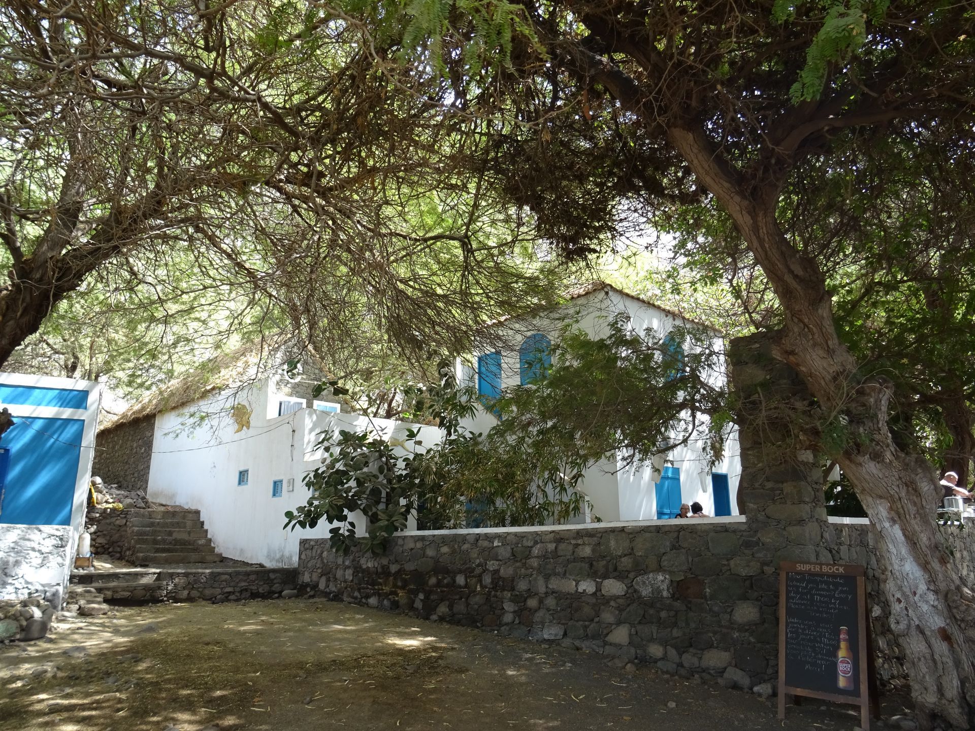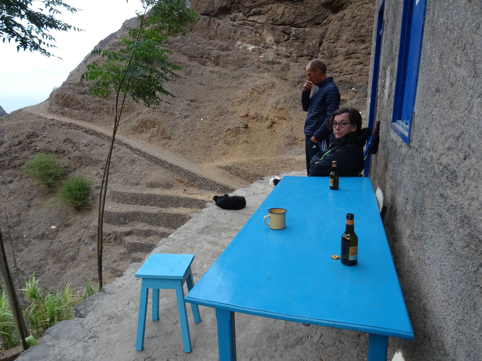 Bevor es Abendessen gibt, beziehen wir unsere Zimmer, die, wie kann es anders sein, komplett in hellblauer Farbe gestrichen sind: Wände, Decke, Mobiliar, einfach alles, was man streichen kann. (Nachtrag 2023: inzwischen habe ich im Internet aktuelle Fotos gesehen und weiß, dass Senhor Adalbert auf weinrot umgestiegen ist.) Das ganze Gebäude besteht nur aus drei Zimmern. Eines davon ist das Zimmer von Adalberts Tochter, die ja jetzt in Porto Novo wohnt – in diesem schlafen wir beide – eines ist ein Gästezimmer und im dritten schläft normalerweise Adalbert selbst. Außer wenn das Zimmer für Gäste gebraucht wird, dann schläft Adalbert auf dem Dach des Hauses. Die Tür zu unserem Zimmer lässt sich nicht schließen und die Fenster haben – inselüblich – keine Scheiben. Bad und Toilette ist in einem kleinen Gebäude zwischen dem Haus und den Esel-Behausungen untergebracht, die Küche irgendwo dahinter. In dieser verschwindet Adalbert, nachdem er uns vier Flaschen eiskaltes Bier gebracht und zwei weitere Stühle an den Tisch gestellt hat. Es hat sich nämlich zwischenzeitlich ein weiterer Wanderer eingefunden, der aus der Gegenrichtung kam und morgen nach Chã d´Igreja weiter will.