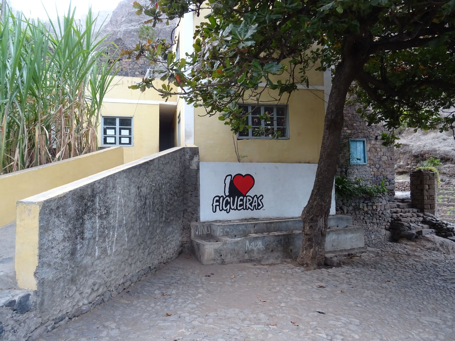 Senhor Adalbert betreibt hier am Arsch der Welt nicht nur dieses zweisitzige Restaurant und das „Hotel“ mit seinen drei Doppelzimmern, sondern auch das Transportunternehmen, zu dem die Eselkarawane gehört. Also direkt ein Großunternehmer! Marcus erzählt uns, dass Adalbert sehr stolz darauf ist, dass er seine Tochter nach der Elementarschule, die sich hier im „Dorf“ befindet, nach Porto Novo auf die Höhere Schule schicken konnte. Nicht jede Familie auf den Kapverden kann sich das leisten. Elementarschulen gibt es dagegen in jedem noch so kleinen Bergdorf und man erkennt sie immer daran, dass das Gebäude gelb gestrichen ist. Hier in Figueiras werden augenblicklich sieben Schüler unterrichtet.