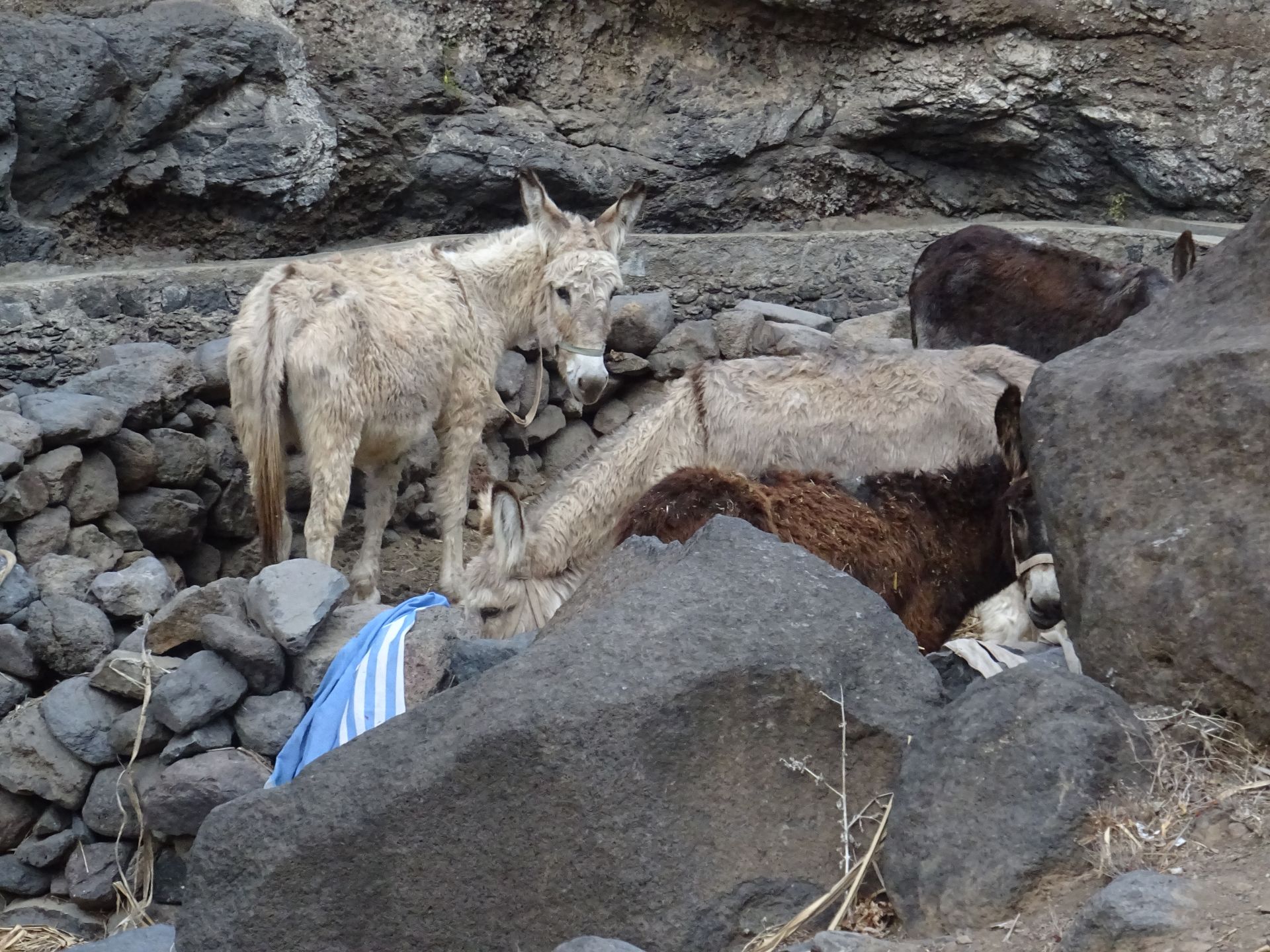 Auf dem Rückweg treffe ich Karin und Markus am Strand, die beiden, die ebenfalls im Haus am Weg wohnen. Sie wollen auch nach Curzinha und erzählen später, dass sie in der Bar mehr Glück haben als ich. Als sie dort eintreten, ist der Wirt zugegen und spricht sogar etwas deutsch. Gerade als ich den Strand verlasse und den Weg zum Haus hinaufsteigen will, kommt ein paar Hundert Meter weiter den steinigen Strand entlang, eine Eselskarawane scheinbar direkt aus der Felswand und bewegt sich auf mich zu. Ich versuche zu ergründen, woher die kommen, kann aber keinen Weg oder Einschnitt in der Wand erkennen. Ich bleibe stehen und beobachte die Tiere, wie sie absolut trittsicher über die riesigen Findlinge ihren Weg finden. Hinter den Eseln kommt ein junger Treiber leichten Schrittes daher gehüpft. Ich würde mir vermutlich alle Knochen brechen, würde ich versuchen, da lang zu laufen. Ich lasse die Gruppe vorbeiziehen und folge ihnen Richtung Chã d´Igerja. Doch während die Esel weiter Richtung Dorf trotten, habe ich für heute genug und biege am Gartentor ab zu unserem Bungalow.