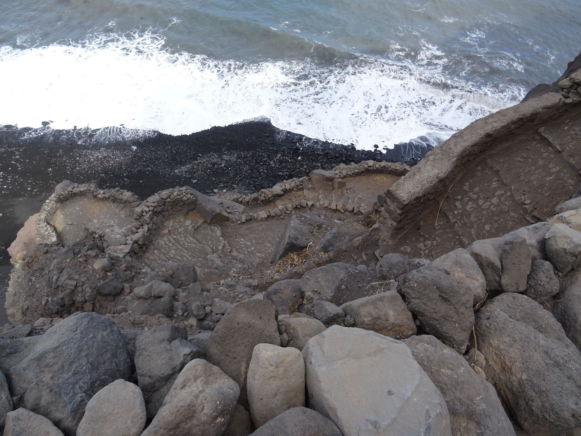 Beim Abstieg nach Alto Mira bietet sich ein bisher ungewohntes Bild. Ein breites, grünes Tal, in dem auf ebener Fläche Ackerbau betrieben wird, durchzogen von einer tiefen Schlucht, durch die in der Regenzeit sicher unvorstellbare Wassermassen ins Meer fließen. Für unsere Mittagspause klettern wir heute über teils zerfallene Stufen direkt ans Meer hinunter.