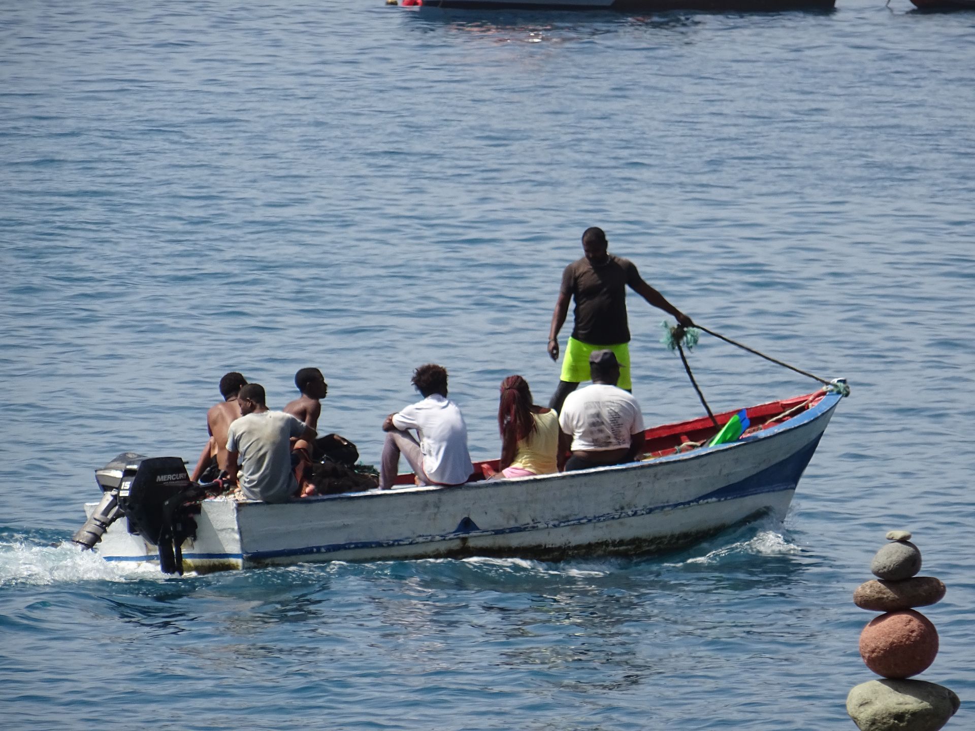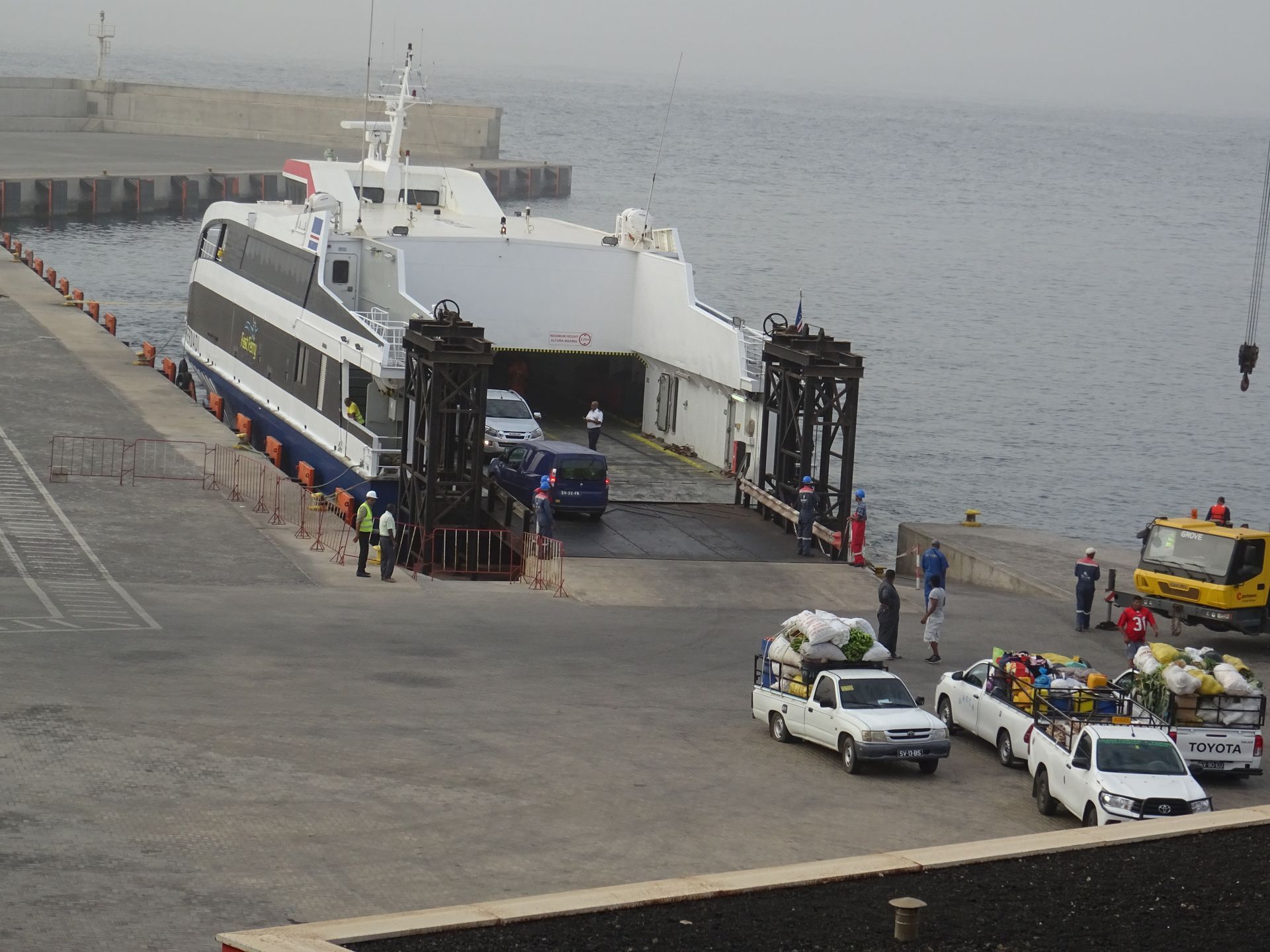 Zum Frühstück um 06:45 Uhr gibt’s Pulverkaffee. Der Rest ist allerdings sehr gut. 07:20 Uhr brechen wir zur Fähre auf und pünktlich um 08:00 Uhr legt diese ab. Unser Gepäck müssen wir abgeben, das verschwindet im Bauch des Schiffes. Die Überfahrt ist sehr windig, entsprechend hoch der Seegang. Viele Einheimische sind recht grün im Gesicht und füttern fleißig die Fische. Ein Seefahrer-Volk scheinen die Kapverder nicht zu sein. Wir bleiben standhaft, dank Reisetabletten und Ingwer-Kaugummi.