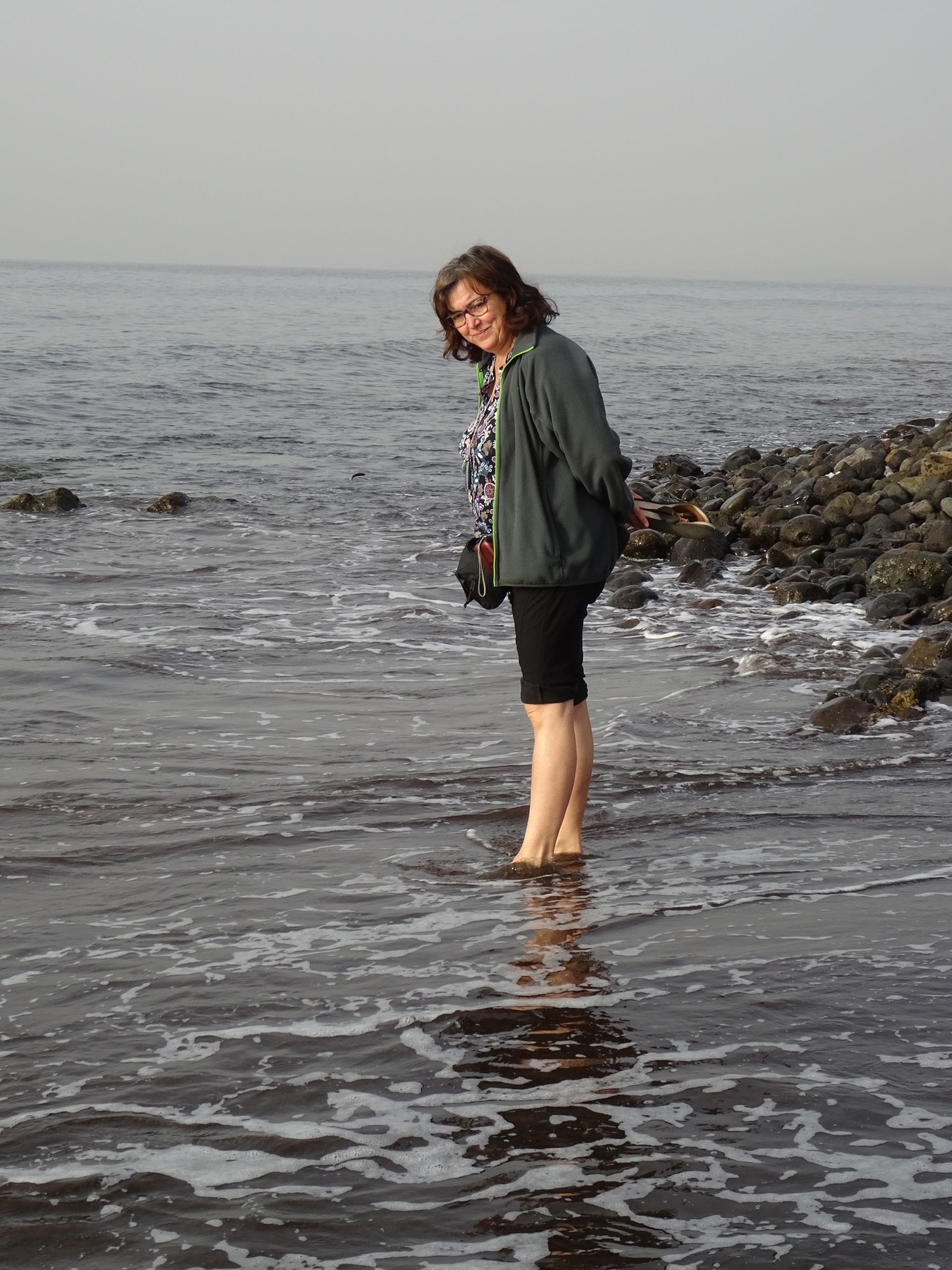 Der Strand scheint unendlich lang zu sein und ist fast menschenleer. Wir bewegen uns ein ganzes Stück vom Dorf weg und ich wage mich todesmutig in die Fluten. Ich liebe es zwar, am Meer zu wandern oder am Strand zu sitzen und in die Ferne zu schauen, aber eigentlich bin ich eher ein Kind der Berge. Ich schwimme auch in Flüssen und Seen, doch das Meer ist mir da irgendwie suspekt. Ich habe keinerlei Erfahrung, wo und wann man gefahrlos im Meer schwimmen kann und wo man es besser lässt. Ob es nun bei Flut gefährlich ist oder eher bei Ebbe, das ist mir nicht bekannt. Dennoch laufe ich ins Wasser und genieße es, wie mich die Wellen umspülen. Ich würde schon gerne schwimmen, aber ich traue mich nicht wirklich hinein. Als ich bereits wieder auf dem Weg ans sichere Ufer bin, passiert es. Eine Welle holt mich schneller von den Füßen als ich schauen kann, spült mich an den Strand und zieht mich dann wieder zurück ins Wasser. Ich versuche, irgendwie auf die Füße zu kommen. Doch da kommt schon die nächste Welle, spült mich an Land, zieht mich wieder zurück. So geht das ein paarmal hin und her. Als ich dann doch endlich sicheren Boden unter den Füßen habe, rinnt mir wieder das Blut von den Knien und ich habe für heute genug vom Baden. Wir ziehen es für die nächste Stunde vor, im Sand zu liegen und uns die Sonne auf den Bauch scheinen zu lassen.