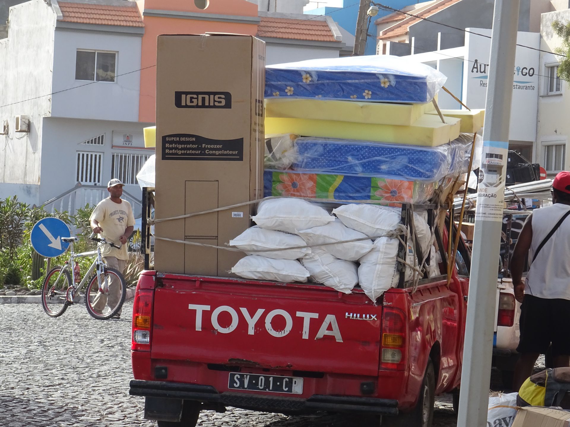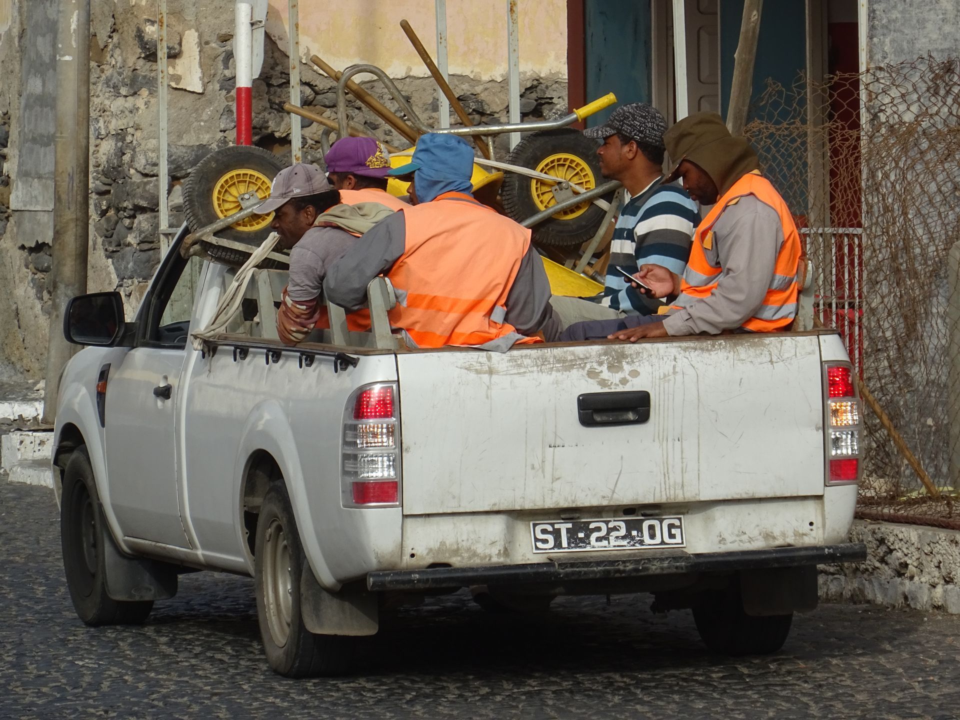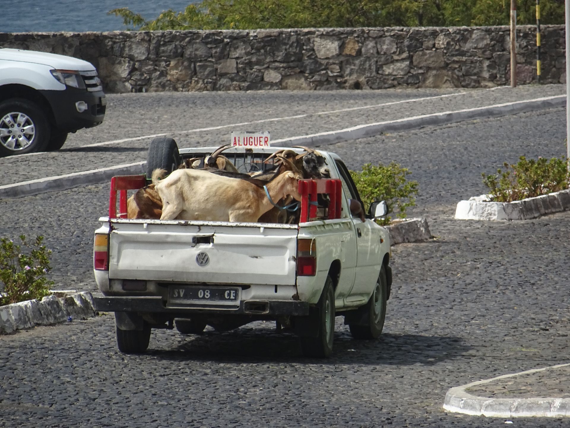 Wir drehen noch eine Runde durch die wenig sehenswerte Stadt und sind um 16:00 Uhr wieder am Hafen. Jetzt ist hier viel los und wir stellen uns so, dass wir die Laderampe der Fähre gut einsehen können. Ein Auto nach dem anderen rollt die Rampe herunter, die meisten Pick-ups total überladen mit allen möglichen Gegenständen. Einer hat drei Kühlschränke geladen, auf einem ist ein Turm aus Matratzen verzurrt, auf anderen stehen Ziegen dicht an dicht auf der Ladefläche. Es gibt viel zu sehen und zu bestaunen, nur Suzette mit ihrem schwarzen Pick-up sehen wir nicht. Claudia geht zum Restaurant hinüber und ich laufe die Straße entlang. Vielleicht haben wir Suzette übersehen und sie wartet hier irgendwo auf uns. Plötzlich ruft einer der Taxifahrer mich beim Namen. Ich bin zuerst ganz verdattert: Woher weiß der, wie ich heiße? Dann erkenne ich ihn. Es ist der Fahrer, der heute früh den Aluguer gefahren hat. Er ist auch der gleiche, der uns mit seinem Taxi vorgestern in Ribeira da Cruz abgeholt hat. Und er erklärt mir, dass Suzette die Fähre verpasst hat und wir mit ihm nach Chã de Morte fahren sollen. Ich kann noch immer kein Portugiesisch und er noch immer kein Englisch, aber irgendwie verstehen wir uns. Mit meinem Spanisch komme ich ganz gut weiter, obwohl mir jeder Einheimische stets versichert, er könne kein Spanisch.