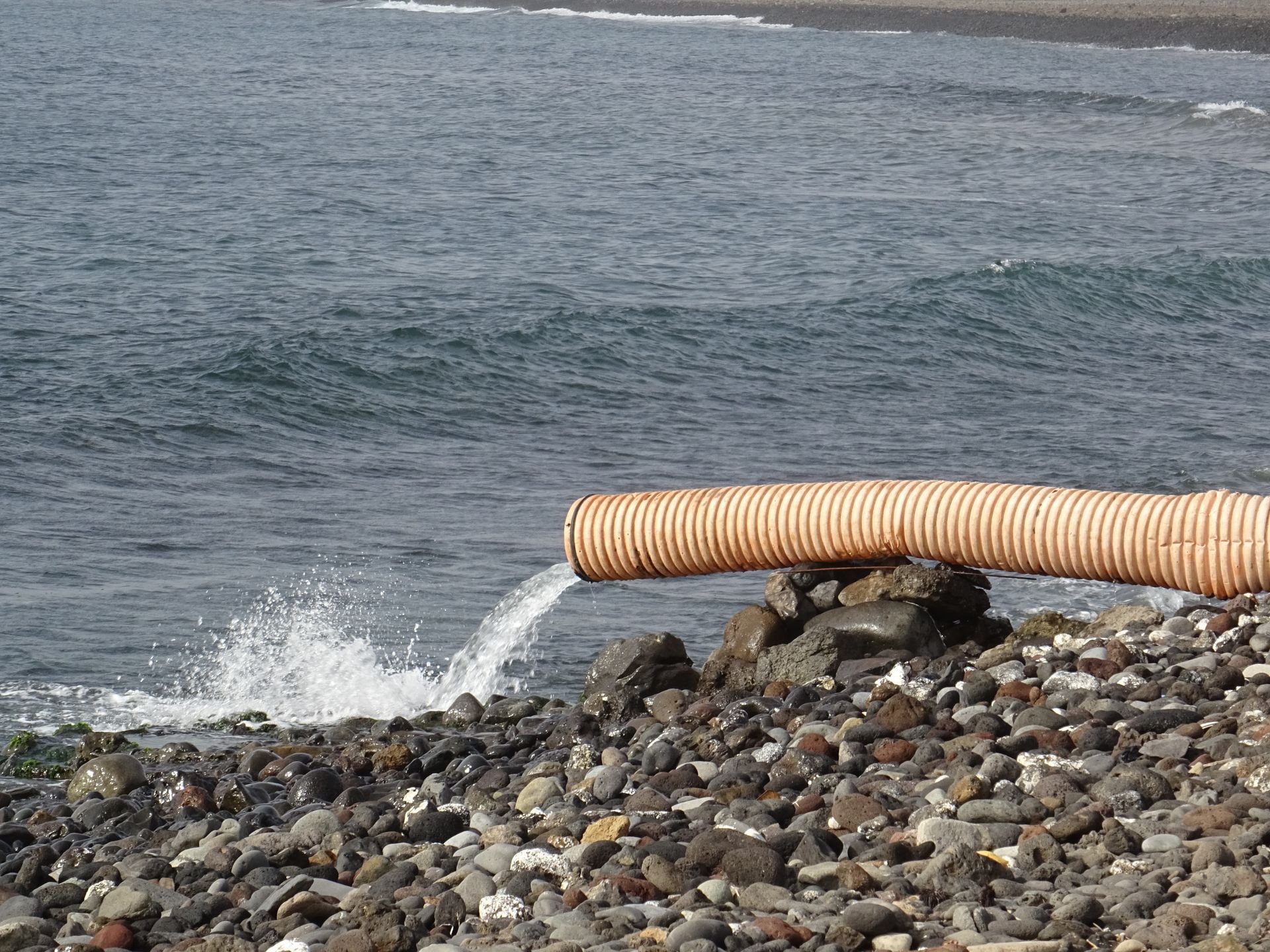 Wir schlendern zunächst am Strand entlang, halten die Füße mal ins Wasser, das erstaunlich warm ist, und gehen dann auf der Hauptstraße durch die Stadt in die Richtung, aus der wir mit dem Aluguer gekommen sind. Wir passieren einen Strandpark, der aber zu dieser Zeit noch geschlossen ist, entdecken den Fußballplatz und einen Fitness-Park und kommen am TÜV vorbei. Schließlich landen wir an einem großen, protzigen Hotel, dem „Santo Antão Resort“. Was auf den ersten Blick nach Luxus aussieht, entpuppt sich bei näherem Hinsehen als wahre Dreckschleuder. Das Abwasser des Hotels wird durch eine Pipeline direkt am steinigen, schmutzigen Strand ins Meer eingeleitet.