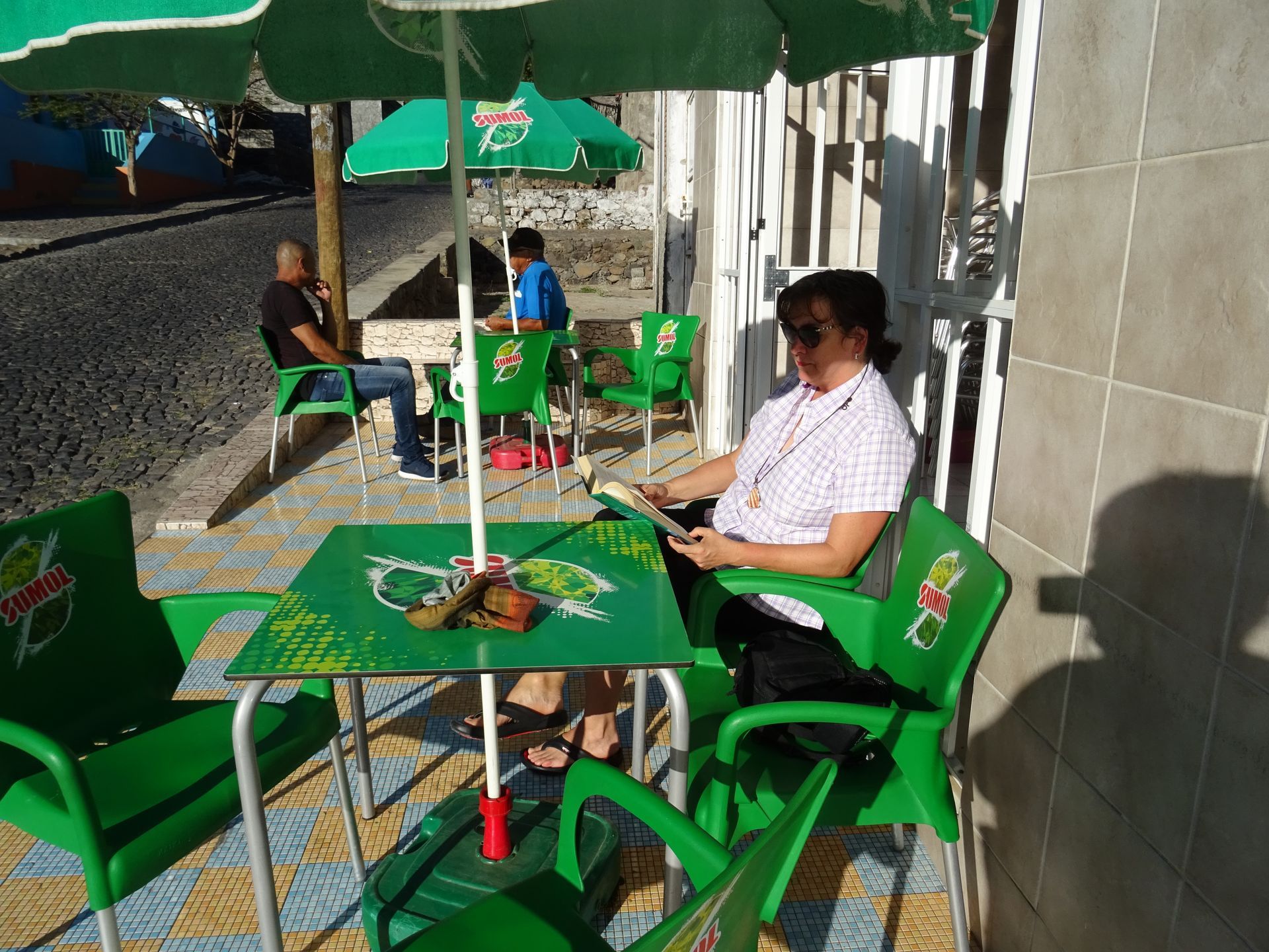 Wir kehren um und bummeln durch Geschäfte, trinken irgendwo eine Cola, essen wieder einmal Bananen, die hier einfach köstlich schmecken, und kaufen uns schließlich kapverdische Wanderschuhe, wie Diane und fast alle Einheimischen sie tragen. Gegen Mittag treffen wir am Restaurant Antilhas ein und bestellen uns ein Sandwich. Von unserem Tisch aus haben wir den Hafen gut im Blick. Was uns dabei irritiert ist, dass keine Taxis vor dem Hafengebäude stehen. Auch keine Aluguers, keine Händler, keine lockengewickelte Frauen. Und um 12:30 Uhr kommt dann auch keine Fähre!
