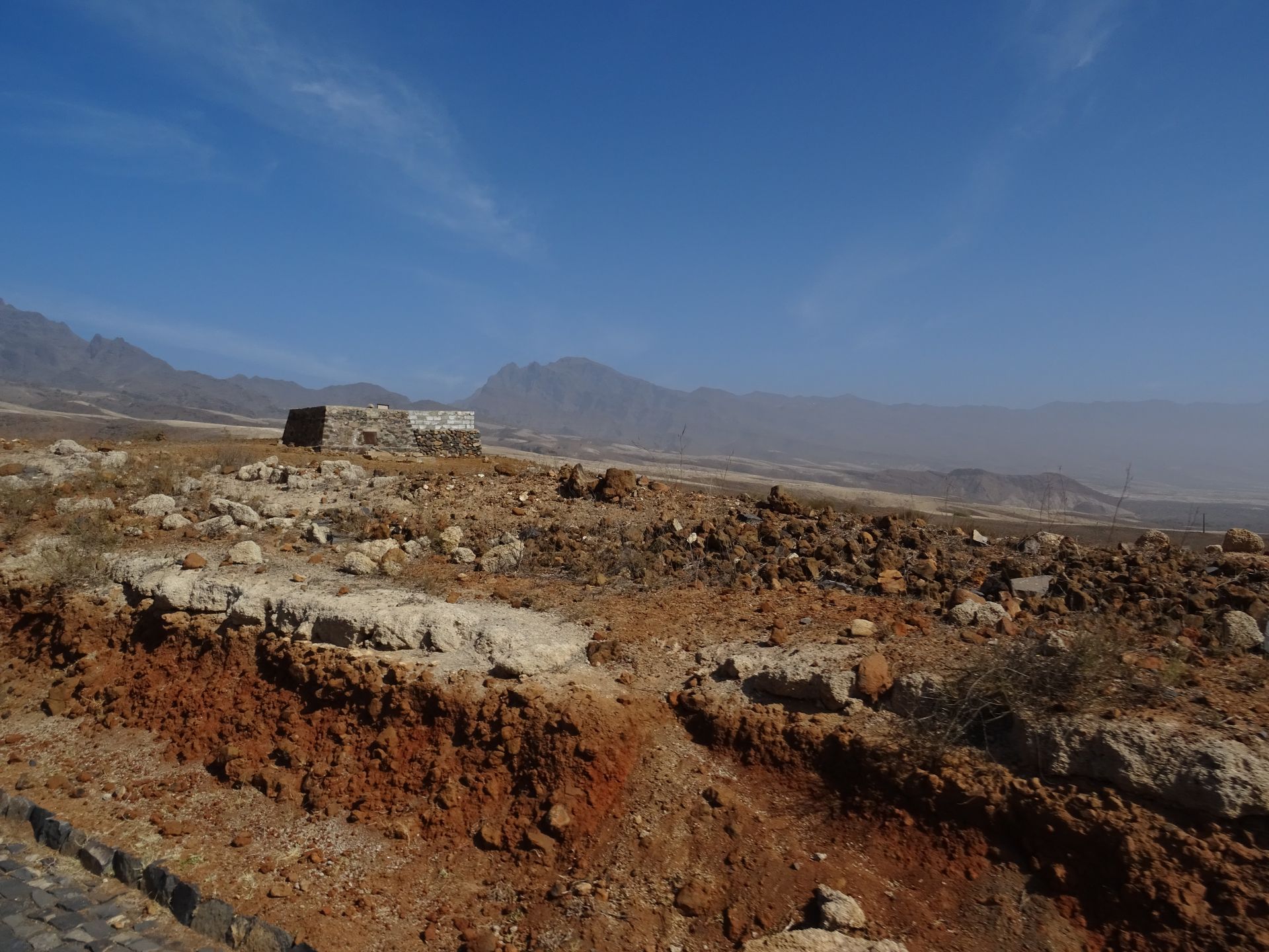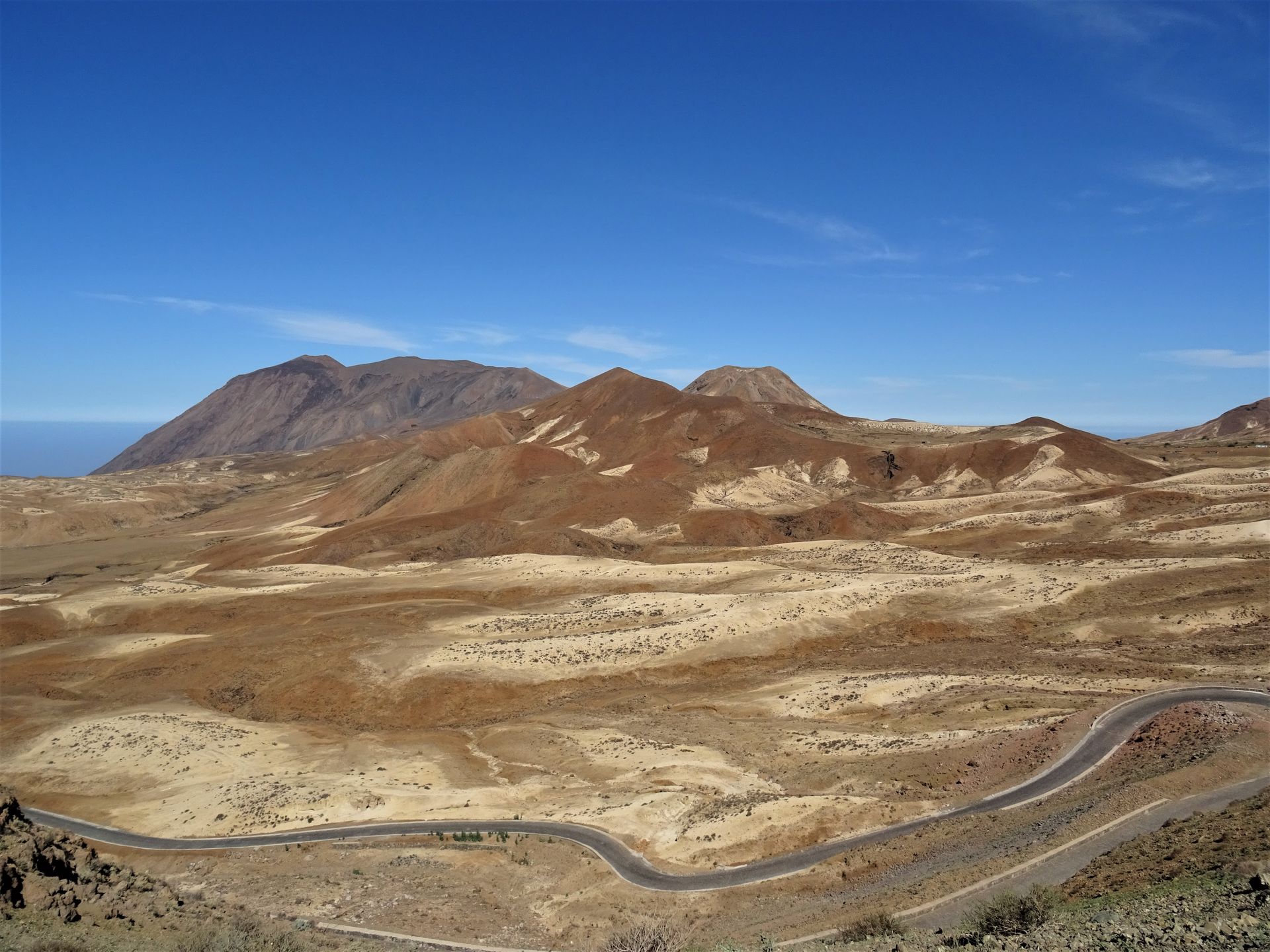 Uns verschlägt es fast die Sprache! So weit man sehen kann erheben sich rotbraune Vulkankegel aus der ockerbraunen, von gelben Streifen durchzogenen Hochebene. Es ist ein Bild wie ein Gemälde. Kaum vorstellbar, dass dies einmal fruchtbares Land war. Die Kornkammer Cabo Verdes ist heute eine unfruchtbare, wasserlose Einöde, auf die unbarmherzig die Sonne herniederbrennt. Und dennoch ist diese Landschaft von einzigartiger Schönheit. Wir können uns kaum satt sehen.