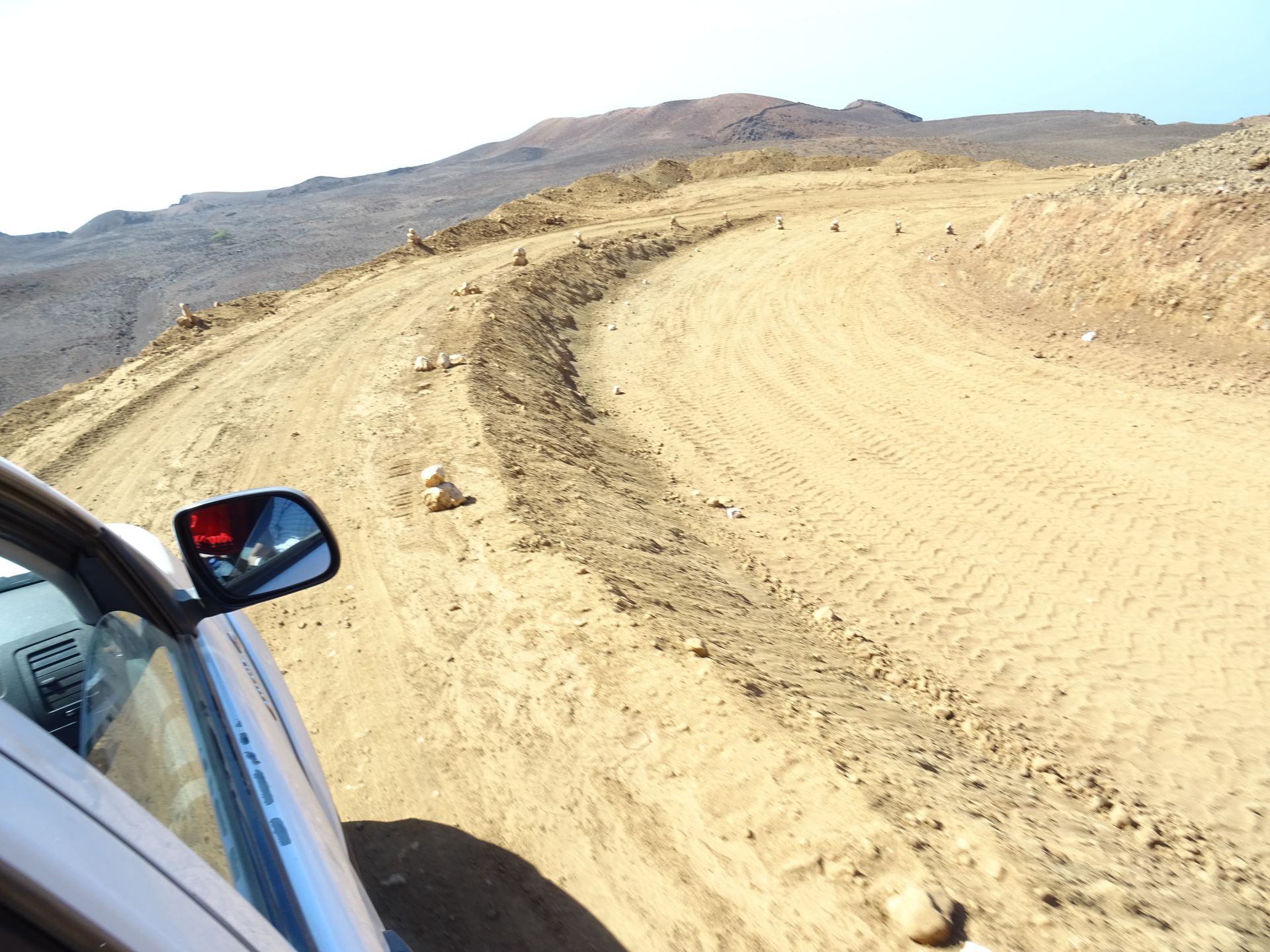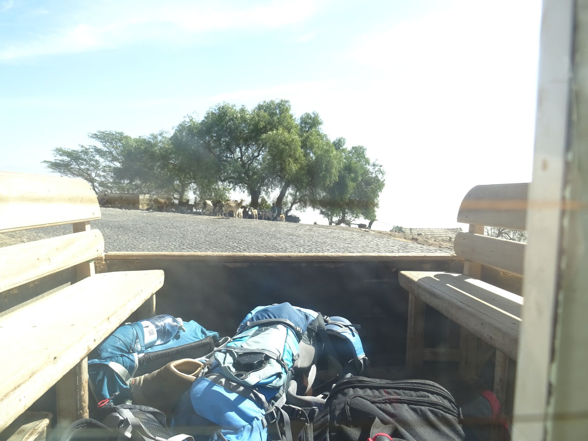 Als ich mich umdrehe und zum Taxi hinunterschaue, sehe ich, wie der Fahrer sich an unserem Gepäck zu schaffen macht. Mein erster Gedanke ist: „Der will uns bestehlen!“ Doch gleich darauf schäme ich mich für meine Verdächtigung, denn er räumt lediglich unsere Rucksäcke und Taschen in den Innenraum. Mir ist allerdings nicht ganz klar, warum er das macht, denn nun habe ich auf meiner Rückbank herzlich wenig Platz. Als wir dann aber weiterfahren, erschließt sich uns sehr schnell der Grund für diese Maßnahme. Die gepflasterte Straße endet hier! Ab jetzt fahren wir über eine buckelige Piste und obwohl das noch vor uns liegende Wegstück nur höchstens zehn Prozent der gesamten Strecke ausmacht, brauchen wir dafür viermal so lang, wie für den bis hierher zurückgelegten Weg. Der Jeep hüpft von Stein zu Stein, von Schlagloch zu Schlagloch, klettert über Felsbrocken und windet sich durch tiefe Rinnen, während das ganze Fahrzeug von einer Staubwolke verschluckt wird. Es dauert nicht lange, da schlage ich mir das Knie am Türgriff so an, dass Blut fließt.