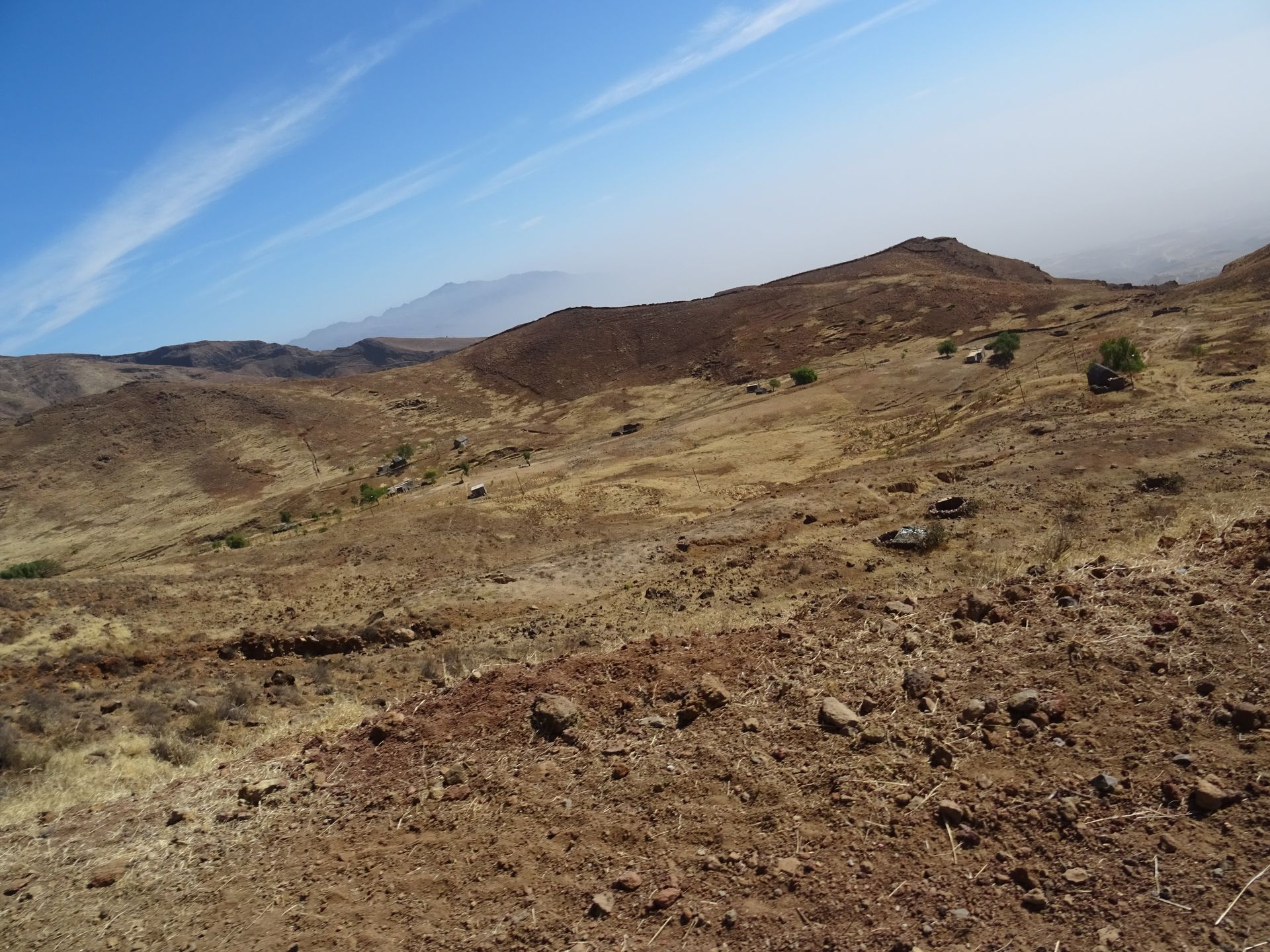 Ab hier fahren wir durch eine trockene, staubige Wüstenlandschaft. Die Berge des Nordens kann man zwar noch in der Ferne sehen, doch geht das Gelände immer mehr in weite Ebenen über, die durch tiefe Schluchten durchzogen ist. Ziegenherden zupfen zwischen den Steinen und Felsbrocken die spärlich stehenden Grashalme ab. Die Straße windet sich in Kehren um Hügel und Schluchten. Es ist wieder eine gänzlich andere Landschaft als alles, was wir bisher hier kennenlernen durften. Nach einer halben Stunde gabelt sich die Straße unterhalb eines kleinen Hügels, auf den ein Pfad hinaufführt. Oben scheint es einen Rastplatz oder Aussichtspunkt zu geben mit Tischen und Bänken und einem aufgespannten Sonnenschirm. Der Fahrer hält am Fuße dieses Hügels, lässt uns aussteigen und schickt uns den Hügel hinauf.