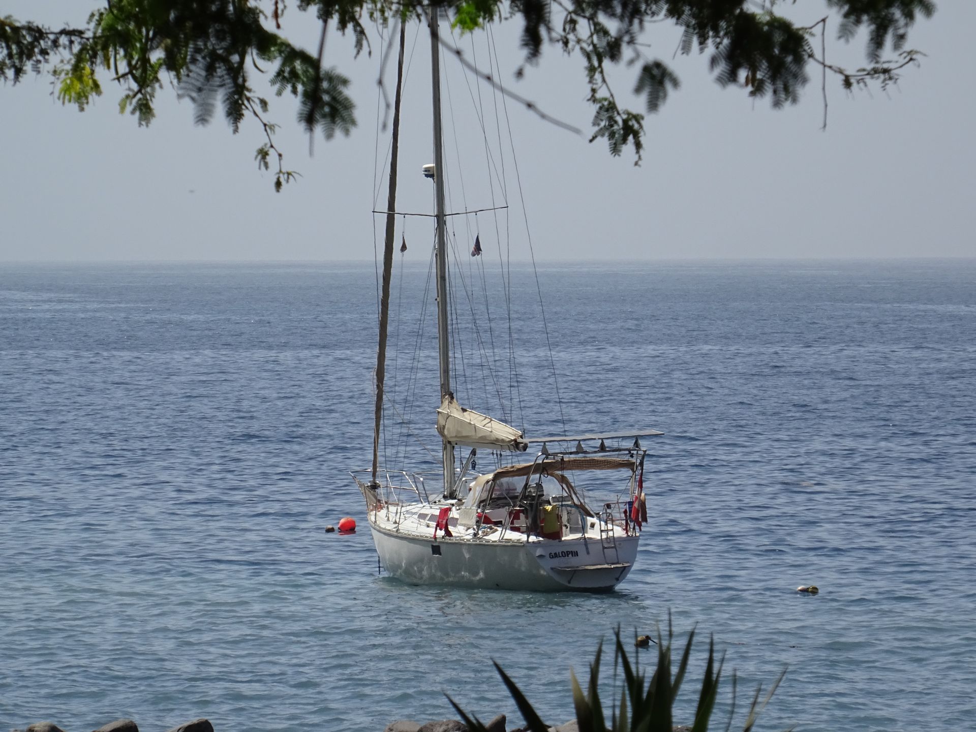 Die Berge sind heute verschwunden. Die ganze Umgebung versinkt im Dunst. Das ging gestern Abend schon los und setzte sich heute früh fort. Hier herrscht überhaupt eine eigenartige Wetterlage. Im Nordosten versteckten sich die Berge fast ausschließlich in den Passat-Wolken, im Norden war es stets sonnig und warm, aber sehr windig, gestern dann, den Aufstieg vom Meer nach Ribeira da Cruz und die anschließende Fahrt hierher, absolvierten wir in praller, stechender Sonne und heute ist es zwar warm und sonnig, aber kein strahlend blauer Himmel, sondern eben sehr dunstig. Gestern Abend sah es sogar kurzfristig mal nach Regen aus. Den könnte man auf den Inseln hier wirklich gut brauchen. Im Nordwesten soll es Gebiete geben, da haben die Grundschulkinder noch nie in ihrem Leben Regen gesehen.