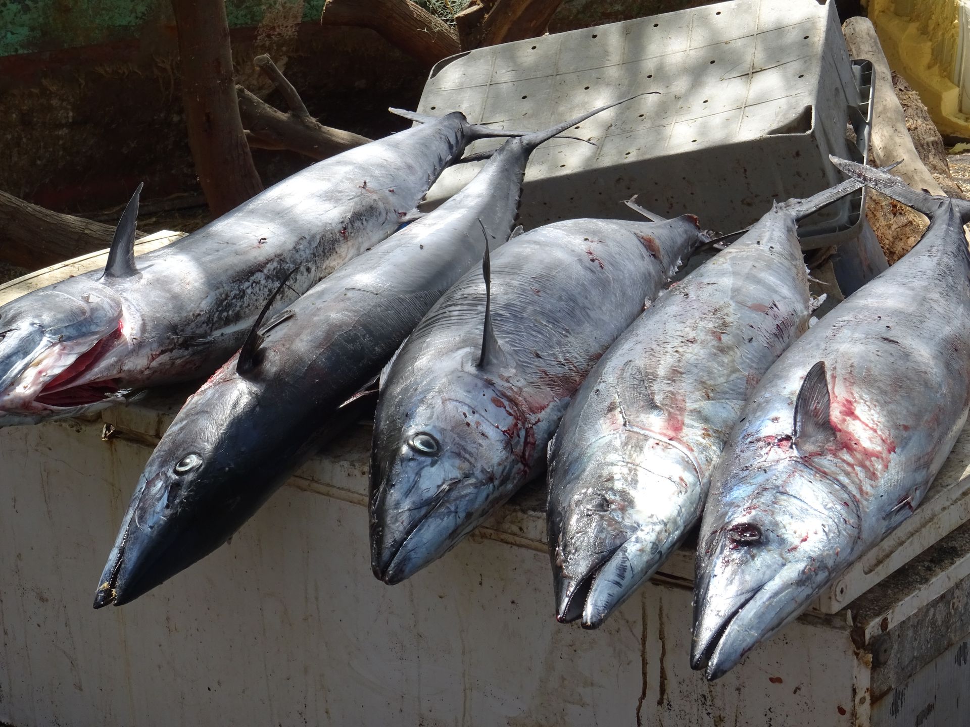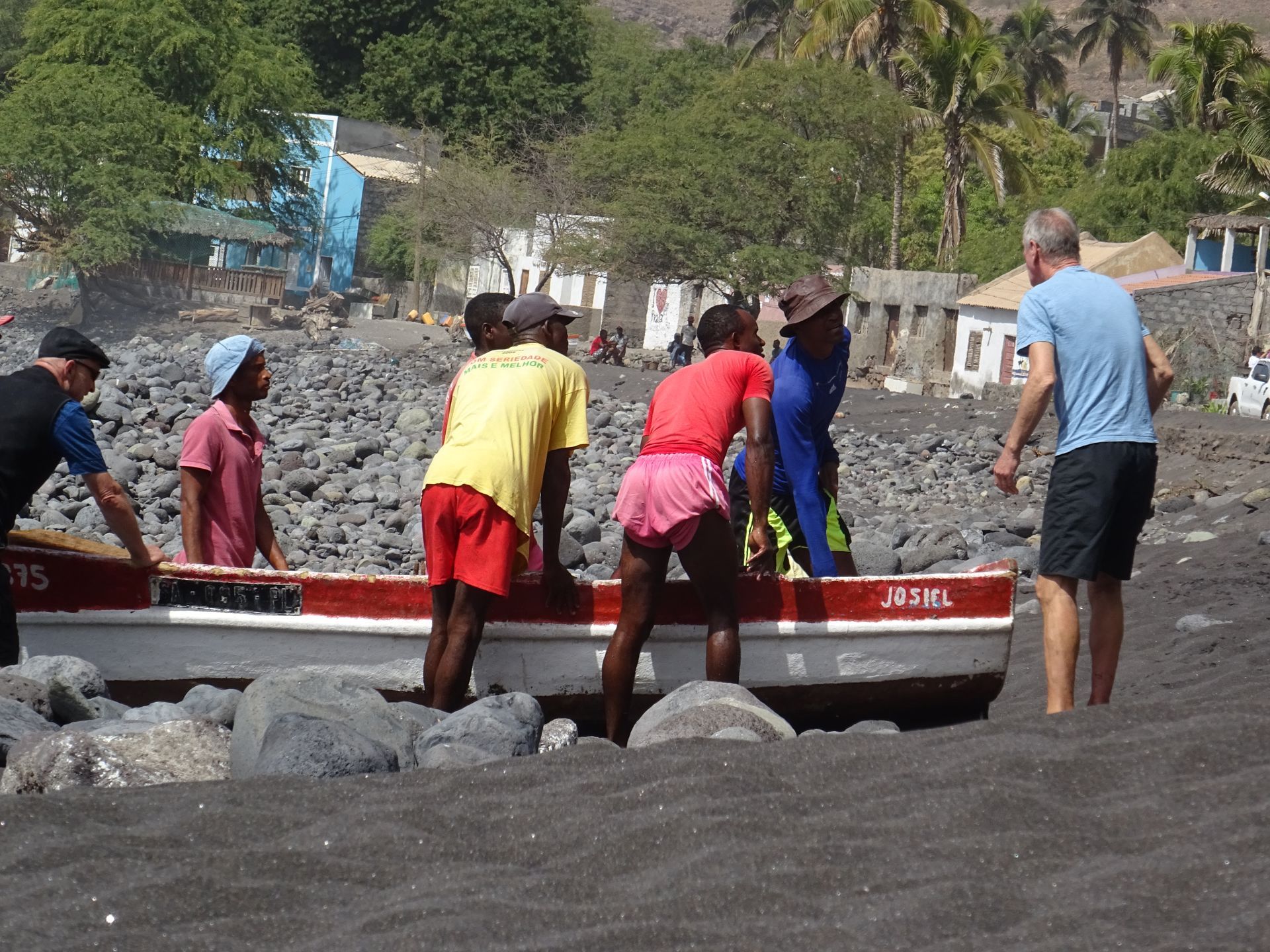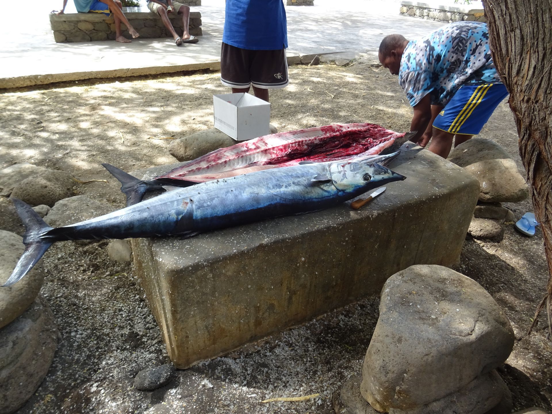 Auf dem Rückweg erleben wir mit, wie die Fischer von ihrer Arbeit heimkehren und das Boot mit ihrem Fang direkt neben unserer Unterkunft an Land ziehen. Dort gibt es einen großen Betonklotz, auf dem die riesigen Fische an Ort und Stelle zerlegt und verteilt werden. Wir treten näher heran und Claudia sagt ganz fachkundig: „Wahoo“, worauf der Fischer sie anstrahlt und eifrig nickt. Aus dem Dorf kommen jetzt viele Frauen und auch Kinder mit Eimern und Schüsseln und jeder trägt seinen Anteil am heutigen Fang nach Hause. Auch die Küche vom „Mar Tranquilidade“ bekommt einen großen Fisch und wir freuen uns nun auf das Abendessen.