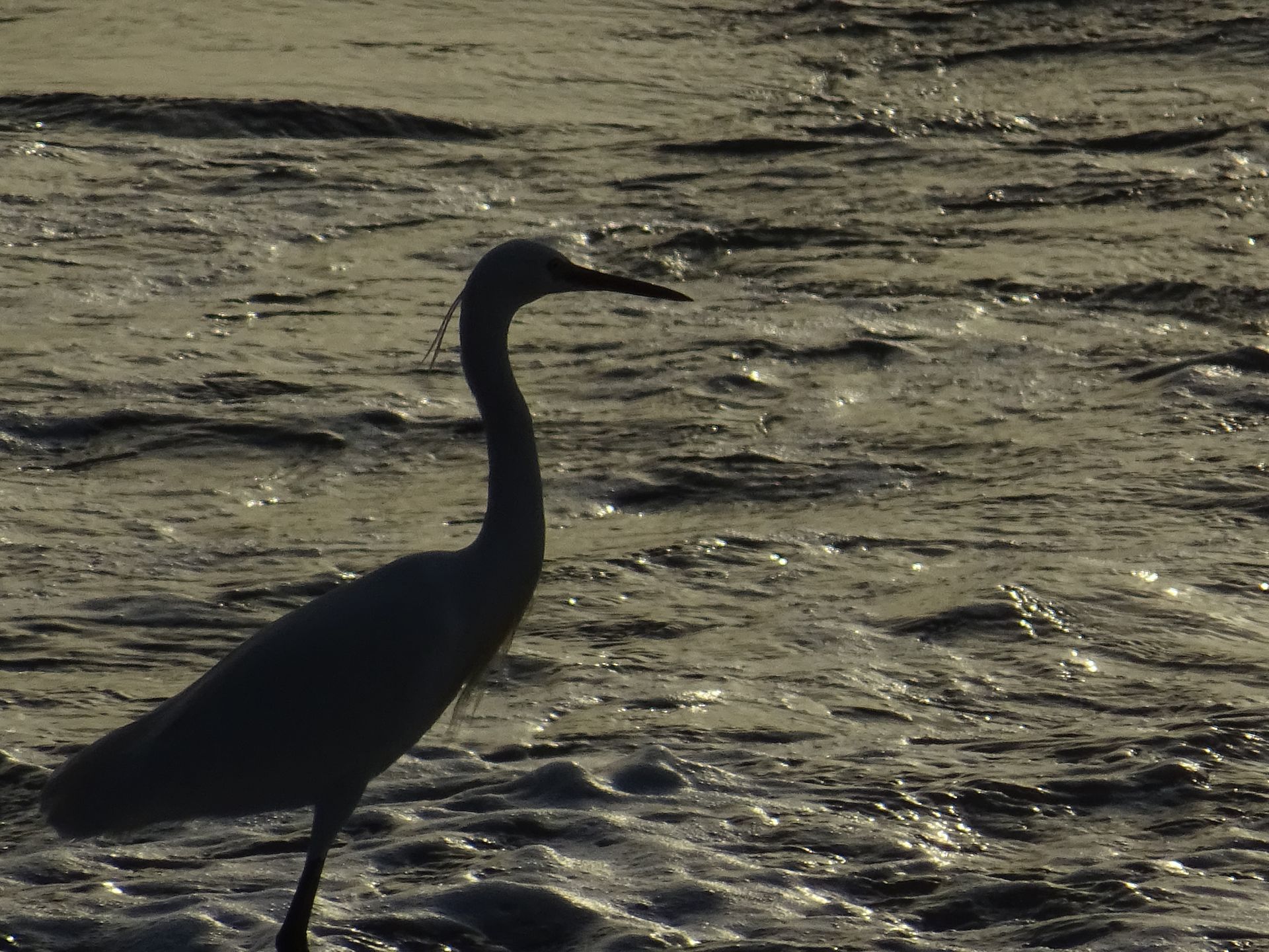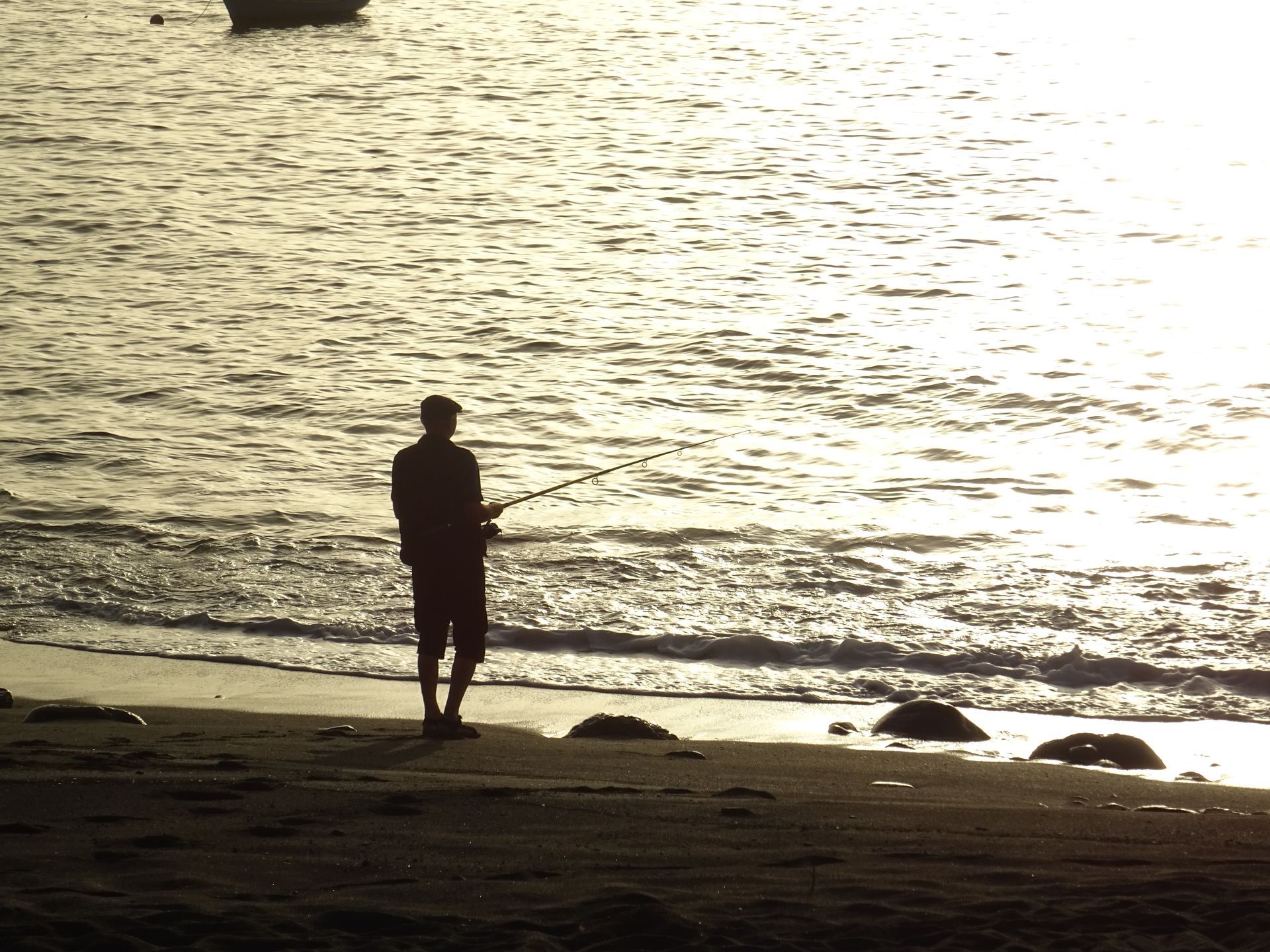 Dann erfahren wir die Zeiten für die Mahlzeiten. Abendessen gibt es nach dem Sun-Downer, der drüben am Strand serviert wird. Gegessen wird auf dem Vorplatz vor dem Haupthaus unter einem der großen Bäume. Es wird auf der niedrigen Mauer ein Buffet aufgebaut. Ich erfrage, ob es eine feste Sitzordnung gibt und erfahre, dass es hier keinerlei Zwänge gibt. Man setzt sich hin, wo man will, nimm sich, was man haben möchte und bleibt, bis man müde ist. Das mit dem Sun-Downer lassen wir uns nicht zweimal sagen und schlendern schon mal hinüber an den Strand. Dort werden gerade die Fischabfälle wieder ins Meer geworfen und es erscheinen jede Menge großer und kleiner Wasservögel und stürzen sich darauf. Und auch aus dem Meer selbst taucht der eine oder andere größere Kopf auf und schnappt sich einen Happen. Ein Gast aus unserer Unterkunft wirft die Angel aus und gibt dadurch ein super Fotomotiv vor dem Sonnenuntergang ab.