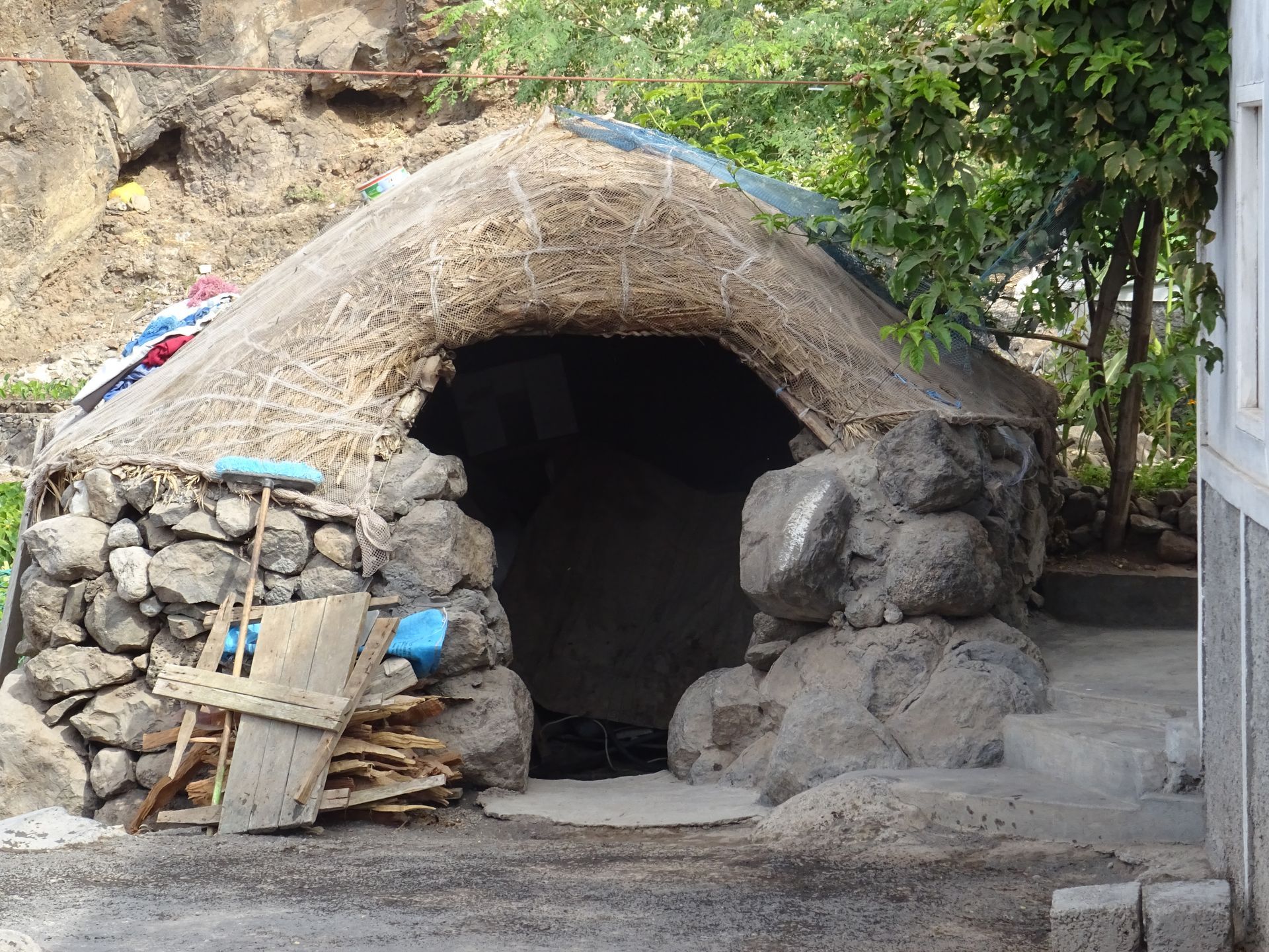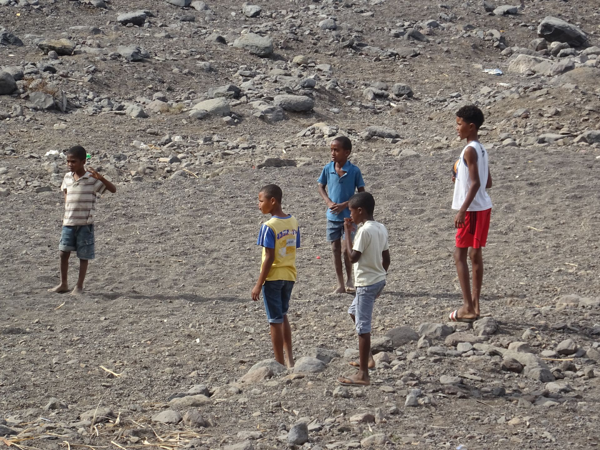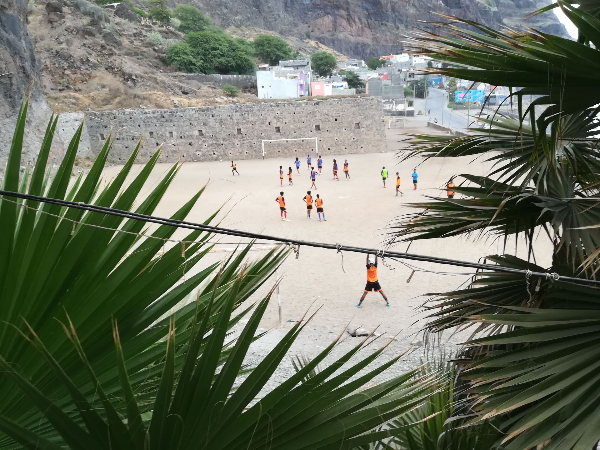 Nach dem Frühstück schlendern wir beide ins Dorf und besichtigen dieses. Mehrere beladene Esel dösen am Ortsrand unter Bäumen, Kinder spielen mit Eimern und alten Fahrradreifen, Erwachsene sitzen auf ihren Verandas oder gehen irgendwelchen Arbeiten nach. Es ist so friedlich hier. Ein jeder scheint unendlich viel Zeit zu haben. Am anderen Ende des Dorfs führt eine steile Straße nach unten ins Tal, in die Ribeira. Hier unten ist der Fußballplatz des Dorfs inmitten einer Kiesgrube. Genau darüber, am Rande der Steilwand, können wir das kleine Boot erkennen, das vor dem Haus am Weg wohl zu Deko-Zwecken aufgestellt ist.