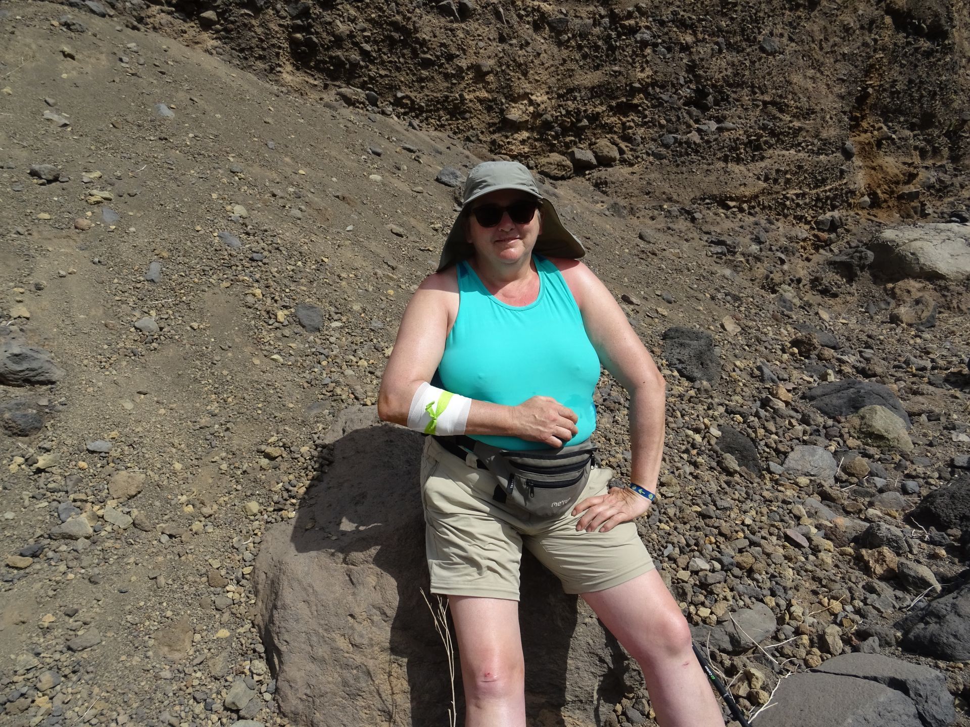 Der Aufstieg ist verdammt hart für uns beide, die wir hinter Diane her hecheln. Immer wieder bleiben wir stehen, um zu Atem zu kommen und zu trinken. Claudia geht es heute deutlich besser, aber sie hat eine ihrer Trinkflaschen in der Black Mamba auf dem Tisch vergessen. Ich habe heftigen Muskelkater in den Oberschenkeln. Diane rennt dagegen förmlich in ihren Flip-Flops und mit ihrem Mini-Rucksack den Berg hinauf.
