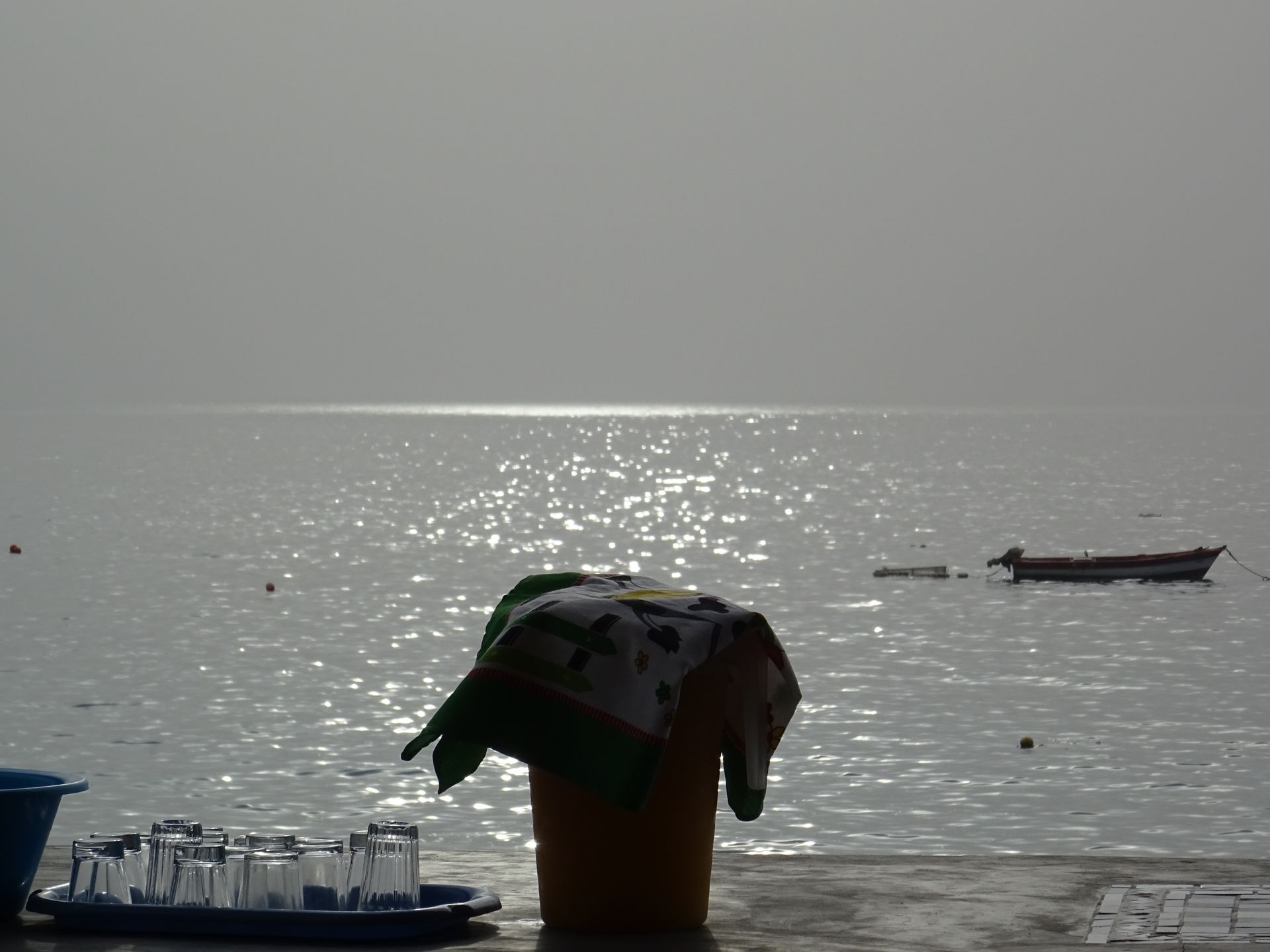 Im Hafen gibt es einen WLAN-Hotspot, den wir nutzen, um uns den Fährplan anzusehen. Eigentlich hätte die Fähre um 12:30 Uhr kommen müssen. Am Ticketschalter entdecken wir einen Aushang mit den Fahrzeiten des Katamarans, auf dem steht, dass die Mittagsfähre täglich fährt, auch am Wochenende und an Feiertagen, nur heute nicht! Das habe ich ja wieder einmal super hingekriegt! Ich nehme doch tatsächlich auf meinen Wanderungen und Urlaubsreisen alle negativen Ausnahmen mit, die ich bekommen kann!