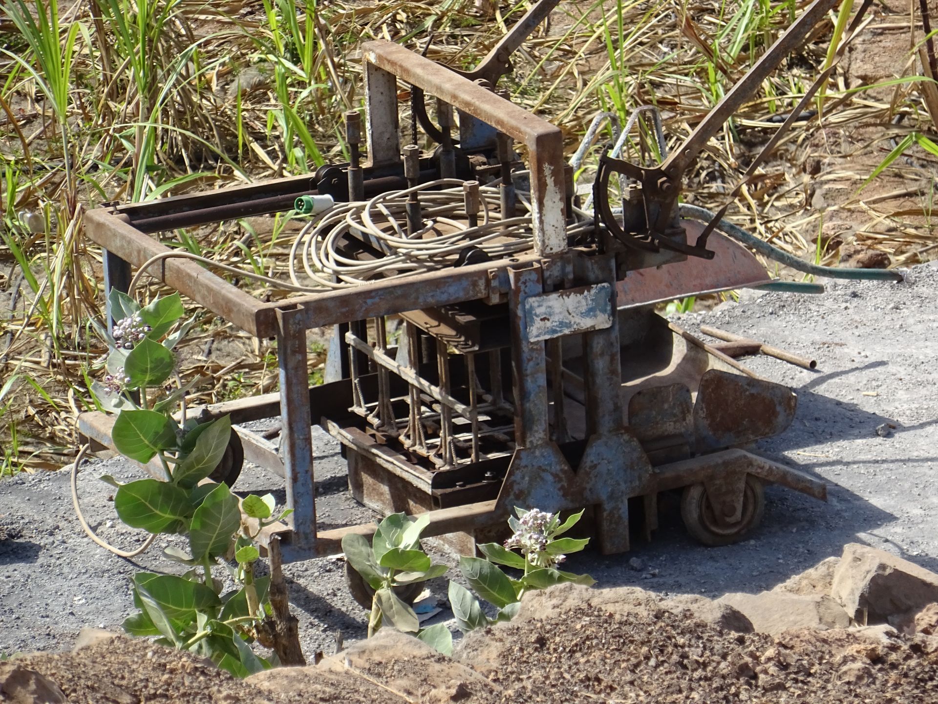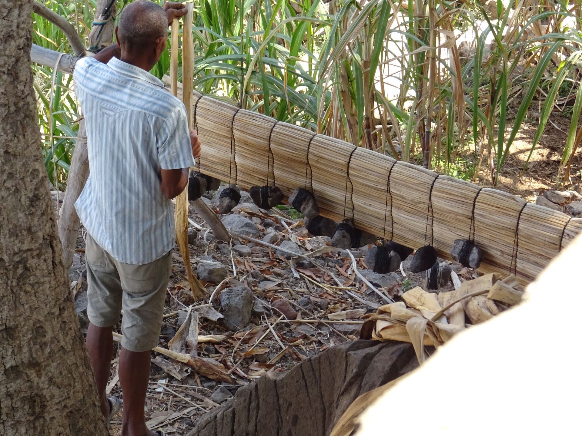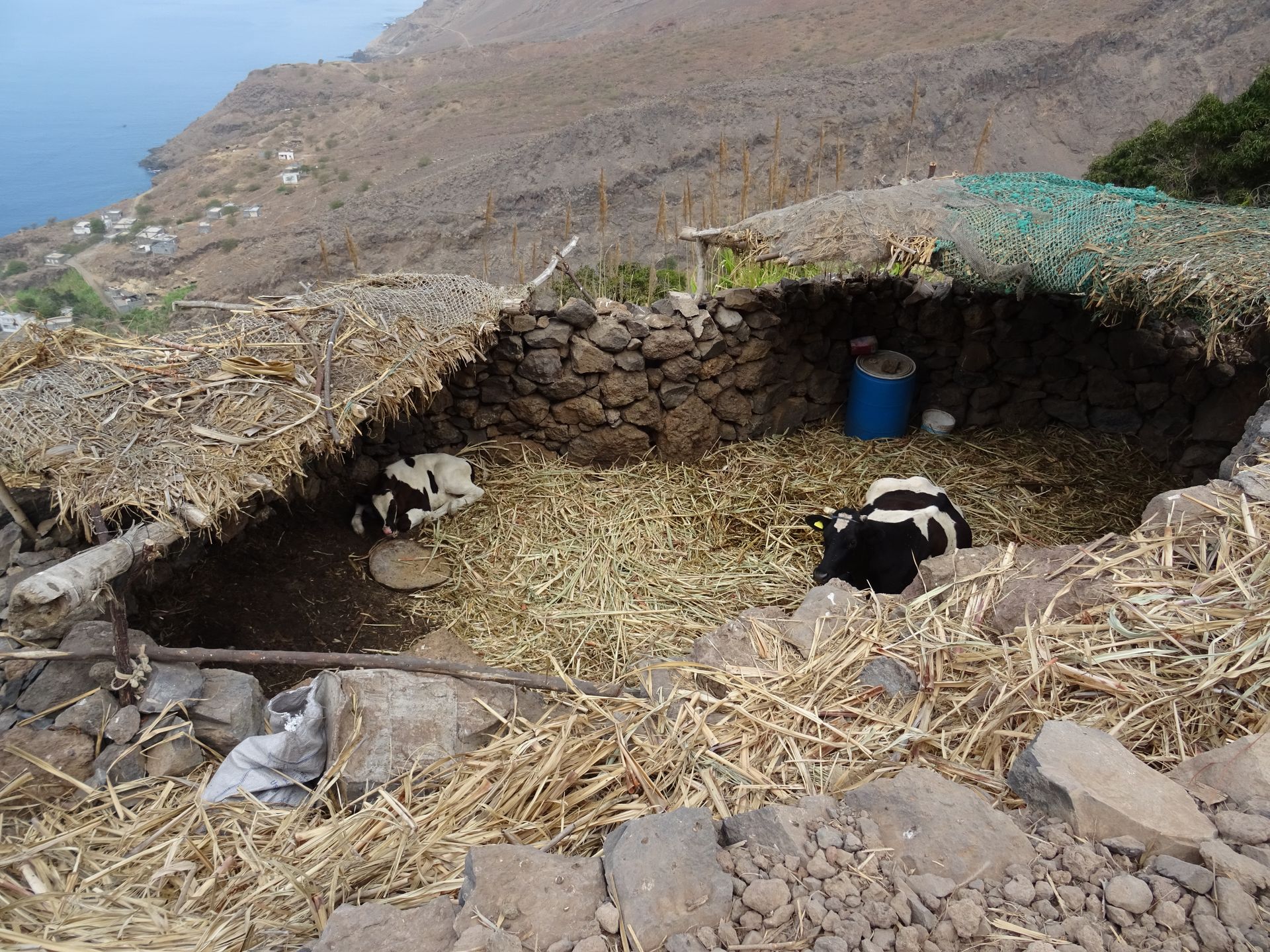 Nach dem Frühstück schnappen wir unsere Rucksäcke, stopfen zwei Flaschen Wasser und etwas Obst hinein und machen uns auf, die Gegend zu erkunden. Man könnte über einen Pfad bis nach Monte Trigo laufen, dabei müsste man allerdings 600 m sowohl im Aufstieg als auch im Abstieg überwinden. Der Reiseführer veranschlagt für die einfache Strecke drei Stunden. Zurück ginge es auf gleichem Weg oder man fragt einen Fischer, ob er einen mit dem Boot nach Tarrafal zurückbringt. Wir wollen zumindest einen Teil der Strecke in Angriff nehmen und bei Bedarf einfach wieder umkehren. Das erste Stück des Weges, bis zur Mitte des Dorfes, kennen wir von gestern schon. Hier teilt sich der Weg, rechts geht es nach oben, in den Ortsteil, den wir gestern vom Rand des Hochplateaus aus sehen konnten. Unser Weg führt nach links weiter, an einer etwas schäbigen Hotelanlage vorbei, aus dem Dorf hinaus. Dabei treffen wir auf eine junge Frau, die einen großen Eimer auf dem Kopf trägt und dem Dorfausgang zustrebt. Wir folgen ihr aus Neugierde und kommen so zu ihrem Schweinestall. Das ist hier nicht einfach nur ein ummauerter Quadratmeter Erde, sondern eine kleine runde Hütte mit Strohdach. Auch Kühe werden hier auf diese Art und Weise gehalten. Gleich daneben ist ein etwas größeres Areal eingezäunt und es liegt ein ganzer Berg Zuckerrohrstängel dort. Ich frage die Frau, was mit dem Zuckerrohr gemacht wird, und sie erklärt uns, dass wir hier vor einer Groque-Destille stehen. Das Zuckerrohr wird hier gepresst, wobei es bei diesem Vorgang immer wieder vorkommt, dass ein Arbeiter mit der Hand in die Presse gerät. Sie sagt, es sei eine sehr gefährliche Arbeit.