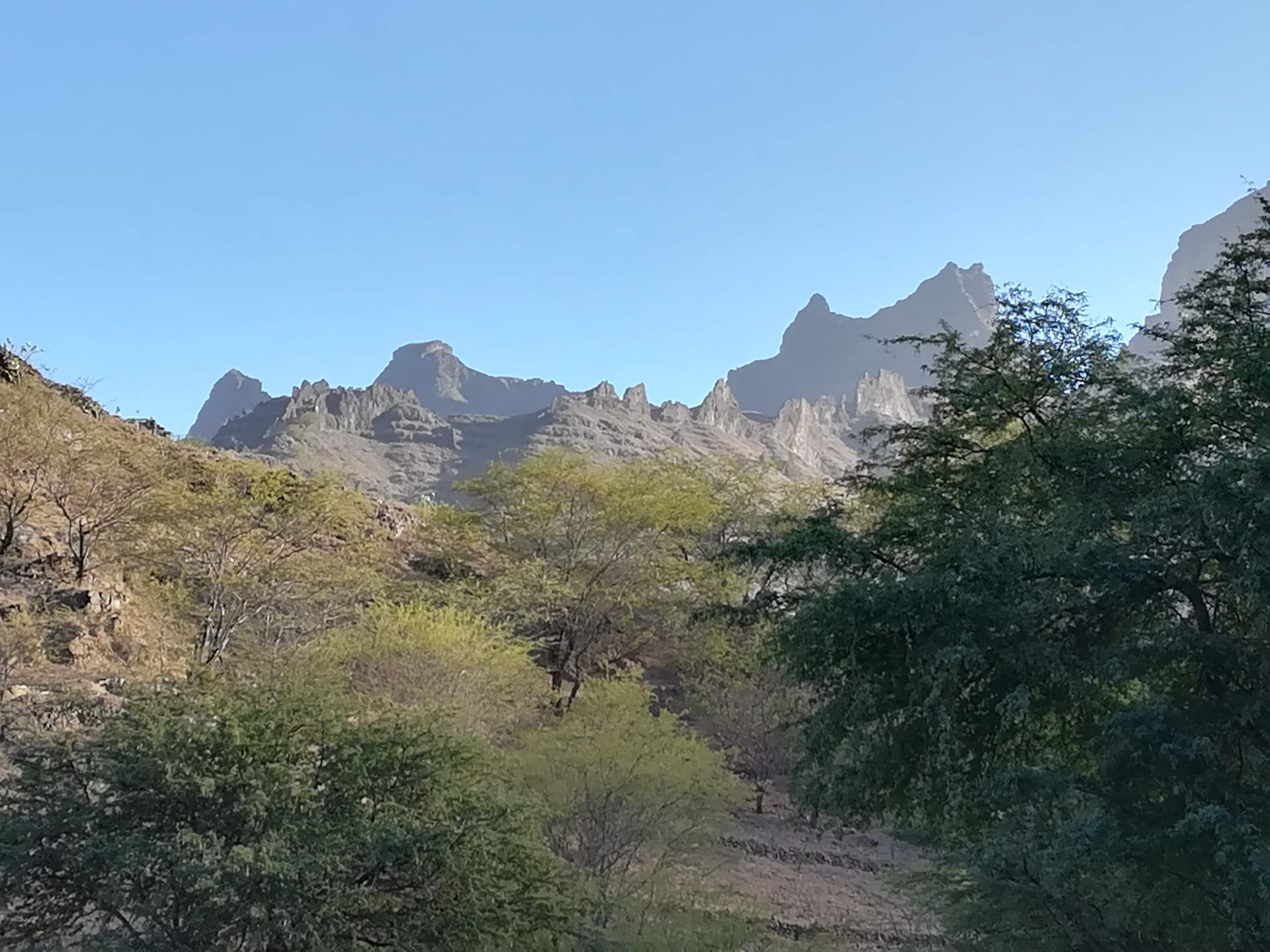 Heute sieht man die Berge wieder klar und deutlich. Der ganze vermeintliche Dunst von gestern war Saharasand. Die Inseln waren praktisch davon eingehüllt. Selbst der Flugverkehr von und nach Cabo Verde war lahmgelegt. Da ging gestern nix! Und jetzt erhebt sich plötzlich im Norden das komplette Bergmassiv und leuchtet hellorange in der Sonne. Wenige hundert Meter östlich vom Hotel sieht man nun eine tiefe, breite Schlucht, von der wir bisher nicht wussten, dass sie existiert.