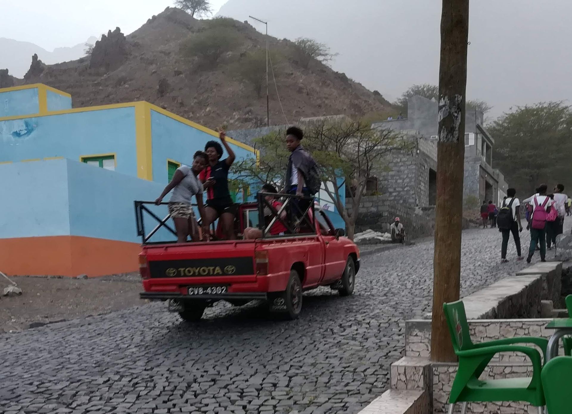 Ich suche Claudia und wir quetschen uns mit dreizehn weiteren Fahrgästen in den Pick-up. Fast alle der Einheimischen haben Gepäck dabei, das hinten auf die Pritsche kommt. Als später weitere Fahrgäste zusteigen, finden auch die auf der Pritsche und teilweise sogar auf dem Dach Platz. Die Fahrt ist ein wahres Erlebnis. Das bekommt man in einer Pauschalreise nicht geboten! Wir fahren noch nicht lange, da wird es sehr lustig im Pick-up. Offenbar hat jemand einen richtig guten Witz erzählt und ich werde den Verdacht nicht los, dass dieser auf unsere Kosten ging. Aber was soll´s! Ich habe ihn ja nicht verstanden und die anderen Fahrgäste hatten ihren Spaß daran. Wir lachen einfach mit. Dann beginnt jemand zu singen und alle stimmen ein. Eine Stunde später treffen wir in Chã de Morte ein und ein sehr zerknirschter Senhor Nelson entschuldigt sich mehrfach für die Unannehmlichkeiten. Claudia und ich antworten gleichzeitig: „Schon gut! Gib uns einen Wein aus und die Sache ist vergessen!