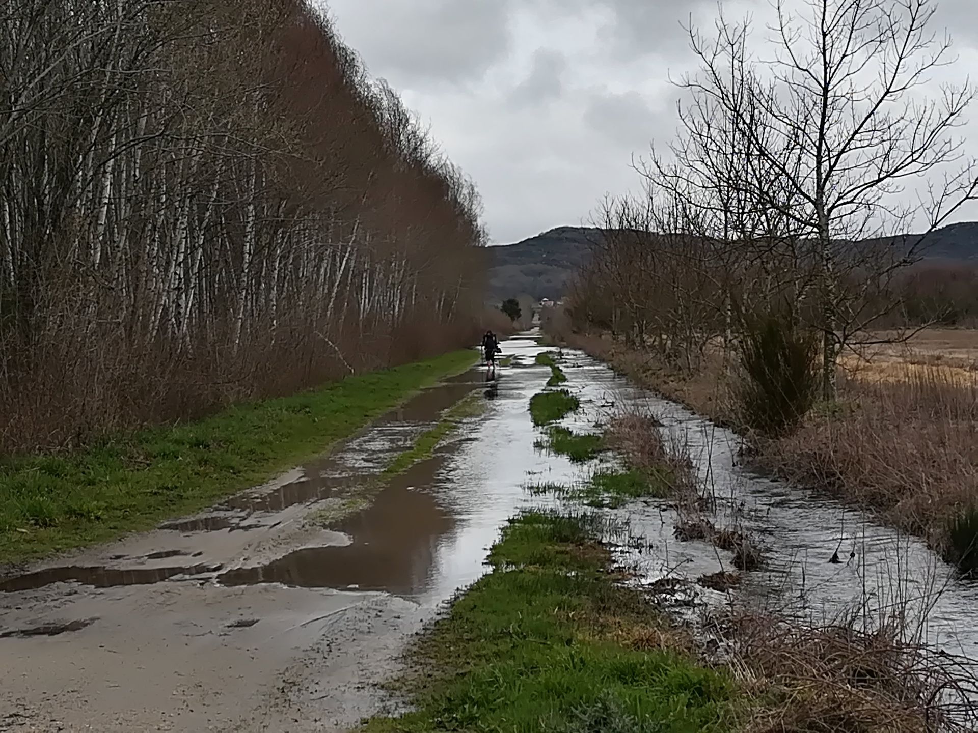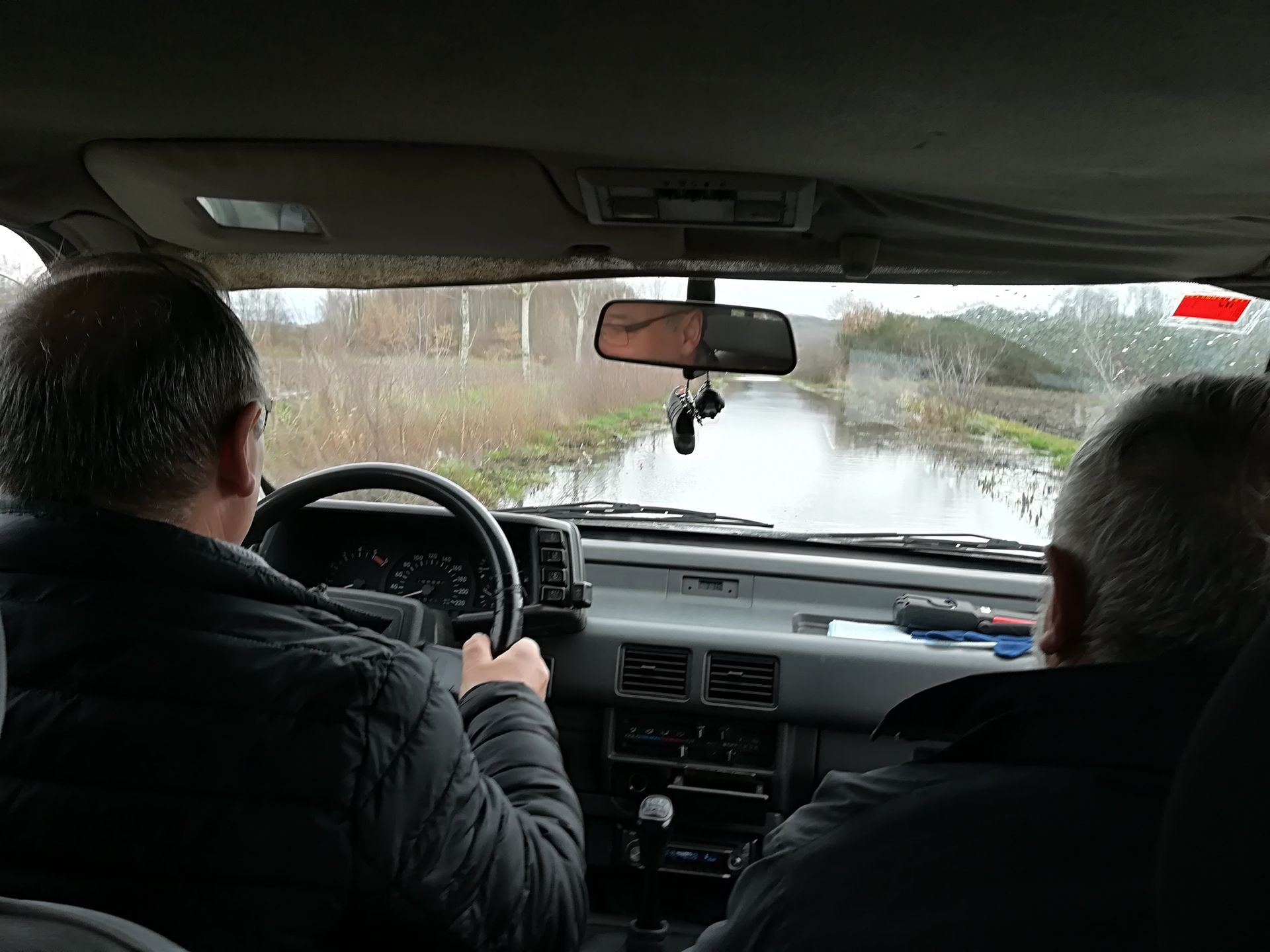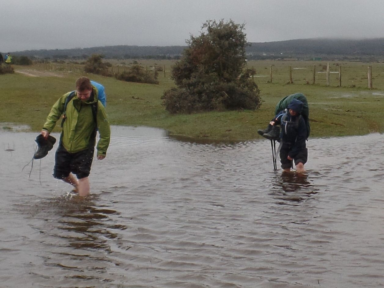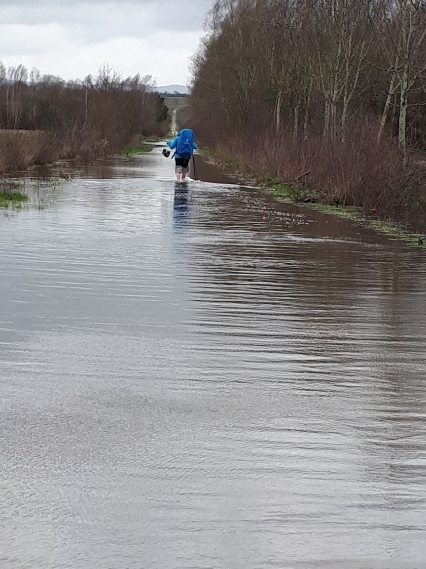 Kurze Zeit später stehen wir vor unserem ersten wirklich großen Hindernis. Der Weg vor uns ist auf gesamter Breite und ca. 200 Meter weit überschwemmt. Rechts und links des Weges ist jeweils ein Graben, in dem das Wasser mit beachtlicher Strömung dahinschießt. Wie tief der Graben ist, wollen wir lieber nicht erproben. Da hilft jetzt nur: Schuhe aus und durch! Und das bei einer Lufttemperatur von gerade einmal 5°C.