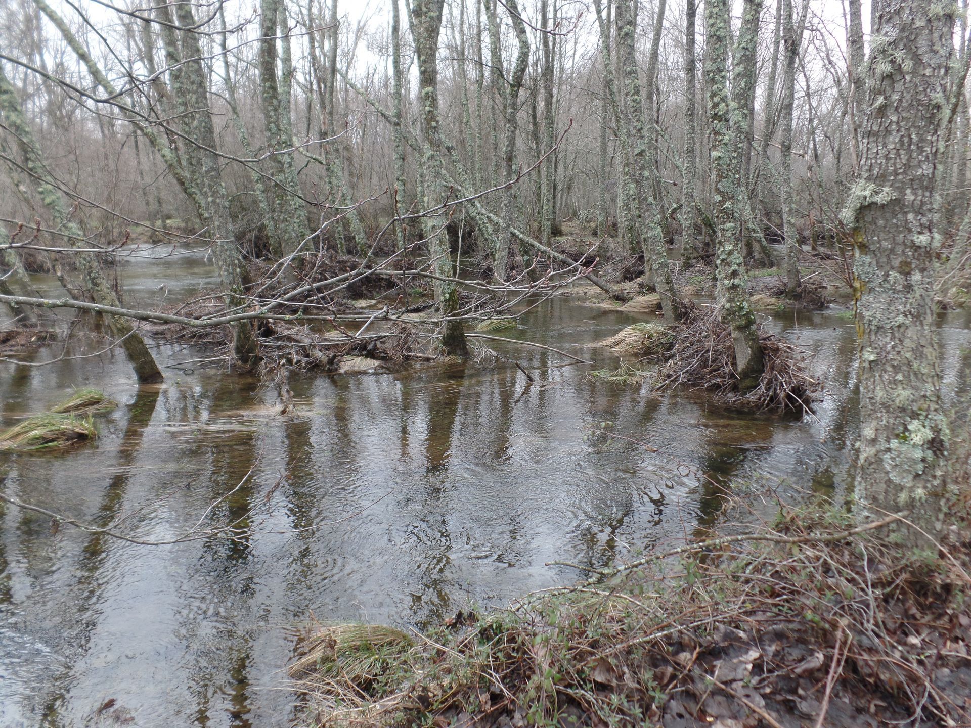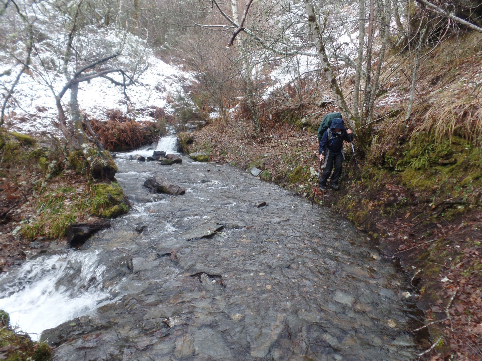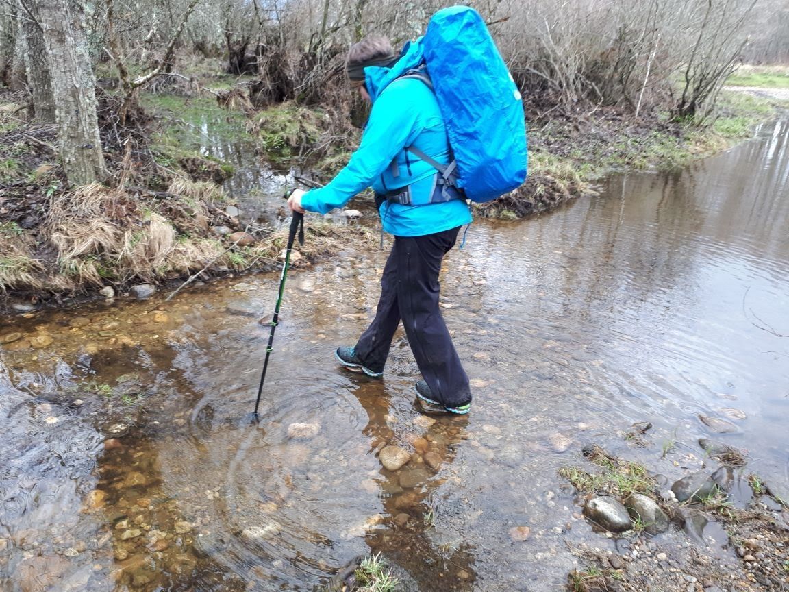 Kurze Zeit später stehen wir vor unserem ersten wirklich großen Hindernis. Der Weg vor uns ist auf gesamter Breite und ca. 200 Meter weit überschwemmt. Rechts und links des Weges ist jeweils ein Graben, in dem das Wasser mit beachtlicher Strömung dahinschießt. Wie tief der Graben ist, wollen wir lieber nicht erproben. Da hilft jetzt nur: Schuhe aus und durch! Und das bei einer Lufttemperatur von gerade einmal 5°C.