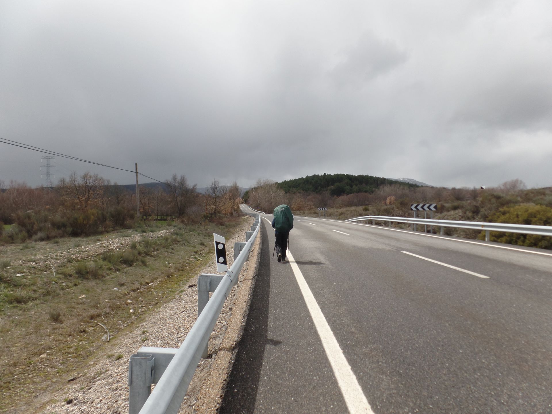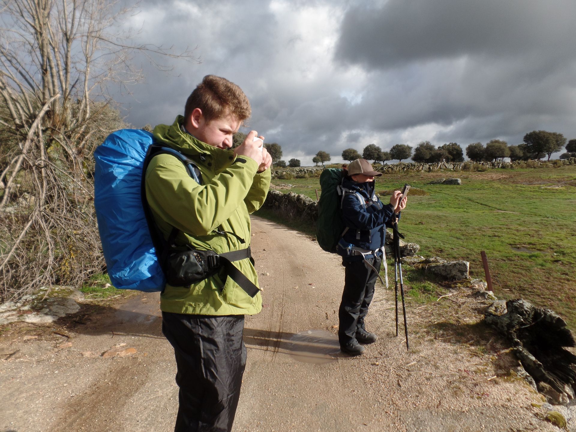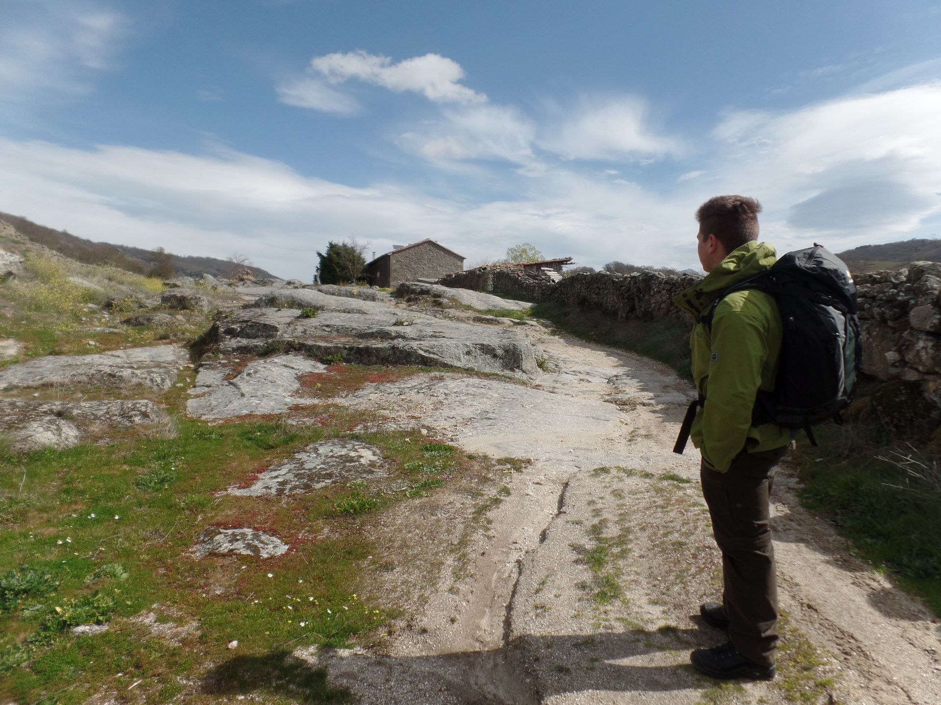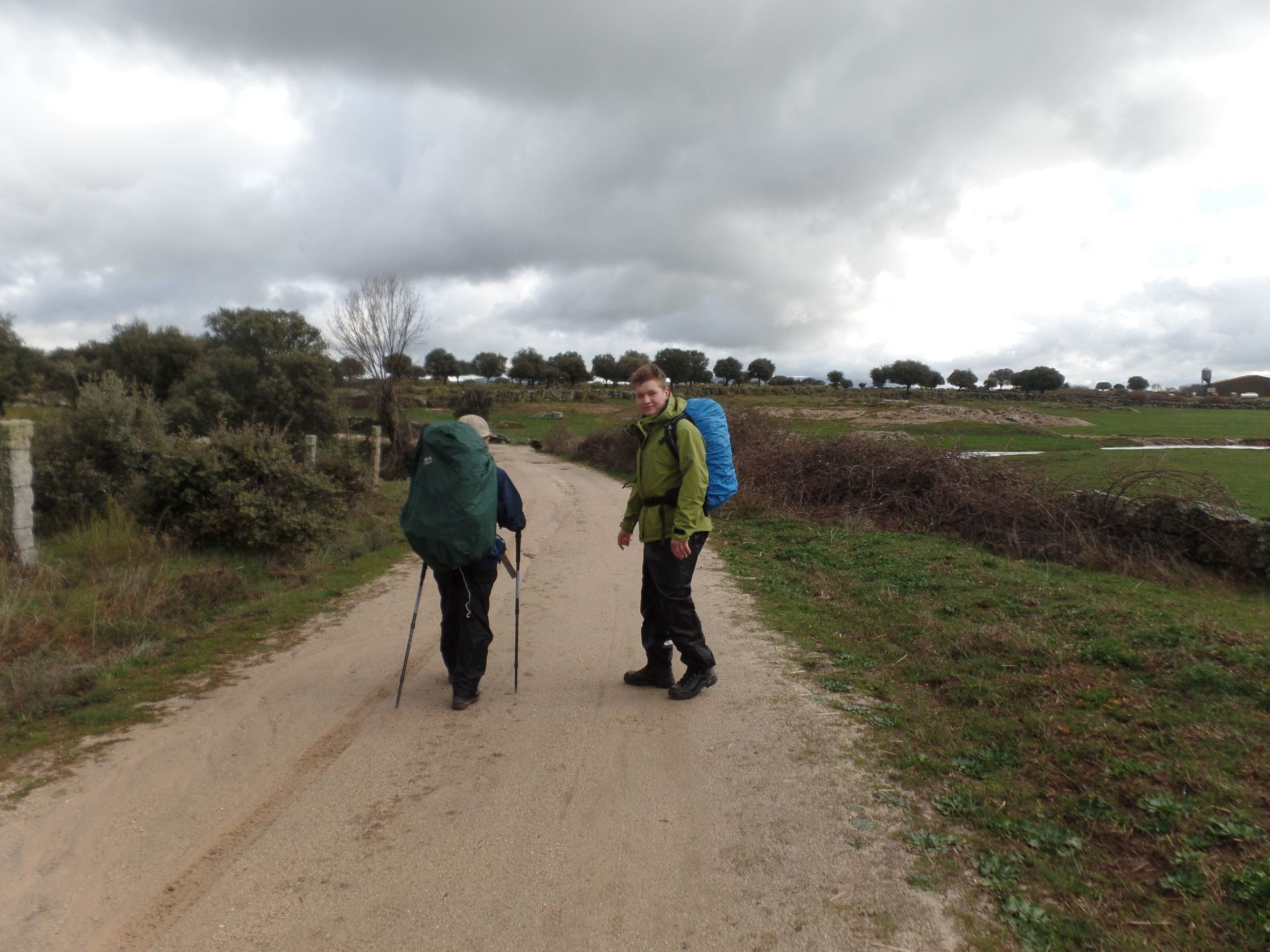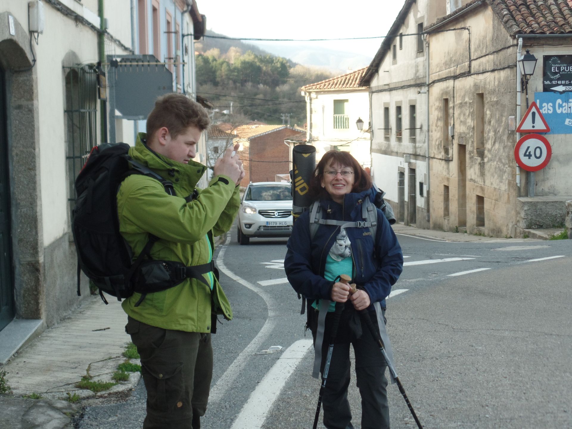 Der Weg führt durch eine wunderschöne Landschaft immerzu bergauf. In der Ferne, hinter den bewaldeten Hügeln, erheben sich im Osten die schneebedeckten Berge der Sierra de Gredos und im Westen die der Sierra de Francia. Wir kommen gut voran auf dem felsigen Untergrund. Zu unserer Rechten gurgelt tief unten im Tal der Rio Cuerpo de Hombres, was übersetzt Männerkörper heißt. Wie dieser Fluss wohl zu dem Namen gekommen sein mag? Eine halbe Stunde bevor wir Calzada de Béjar erreichen, wird der Weg sehr feucht, wir können aber hier auf eine kleine Asphaltstraße ausweichen. Uns kommt eine alte Frau entgegen und Florian, der vorausmarschiert, wird von ihr angesprochen. Auch wenn er sie nicht versteht, bleibt er doch stehen, hört ihr höflich zu und gibt zu verstehen, dass er kein Spanisch spricht. Die alte Frau wendet sich daraufhin an uns und erzählt, dass sie bei Jorge Eier holen will. Vor lauter Begeisterung über unseren jugendlichen Nachwuchspilger vergisst sie aber ihre Eier, kehrt wieder um und begleitet uns ein Stück. Dabei redet sie unaufhörlich auf Flo ein. Auf dem Camino Francés gibt es mittlerweile viele junge Pilger. Der Jakobsweg hat sich dort inzwischen streckenweise fast schon zur Partymeile entwickelt. Gerade die Gegenden um die größeren Städte, allen voran Pamplona, werden von jungen Leuten gerne angesteuert. Doch hier auf der Via da la Plata scheint es eher noch eine Seltenheit zu sein und einen 16jährigen wird man auf keinem der Wege sehr oft antreffen. Als der Weg auf die Passstraße trifft versichert sich die Seniorin, dass wir auch ja gegenüber in den Feldweg einbiegen. Der Abzweig ist zwar überdeutlich markiert, sie wartet aber, bis wir etwa 50 m weit gegangen sind. Dann geht sie auf der Passstraße bergauf weiter. Ihre Eier hat sie wohl endgültig vergessen.