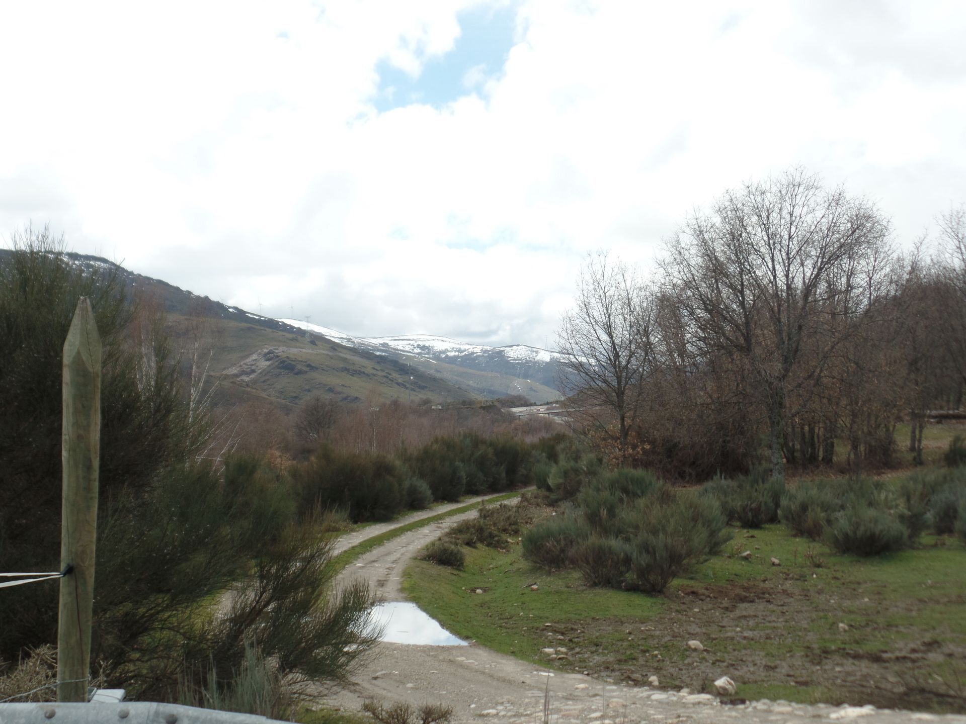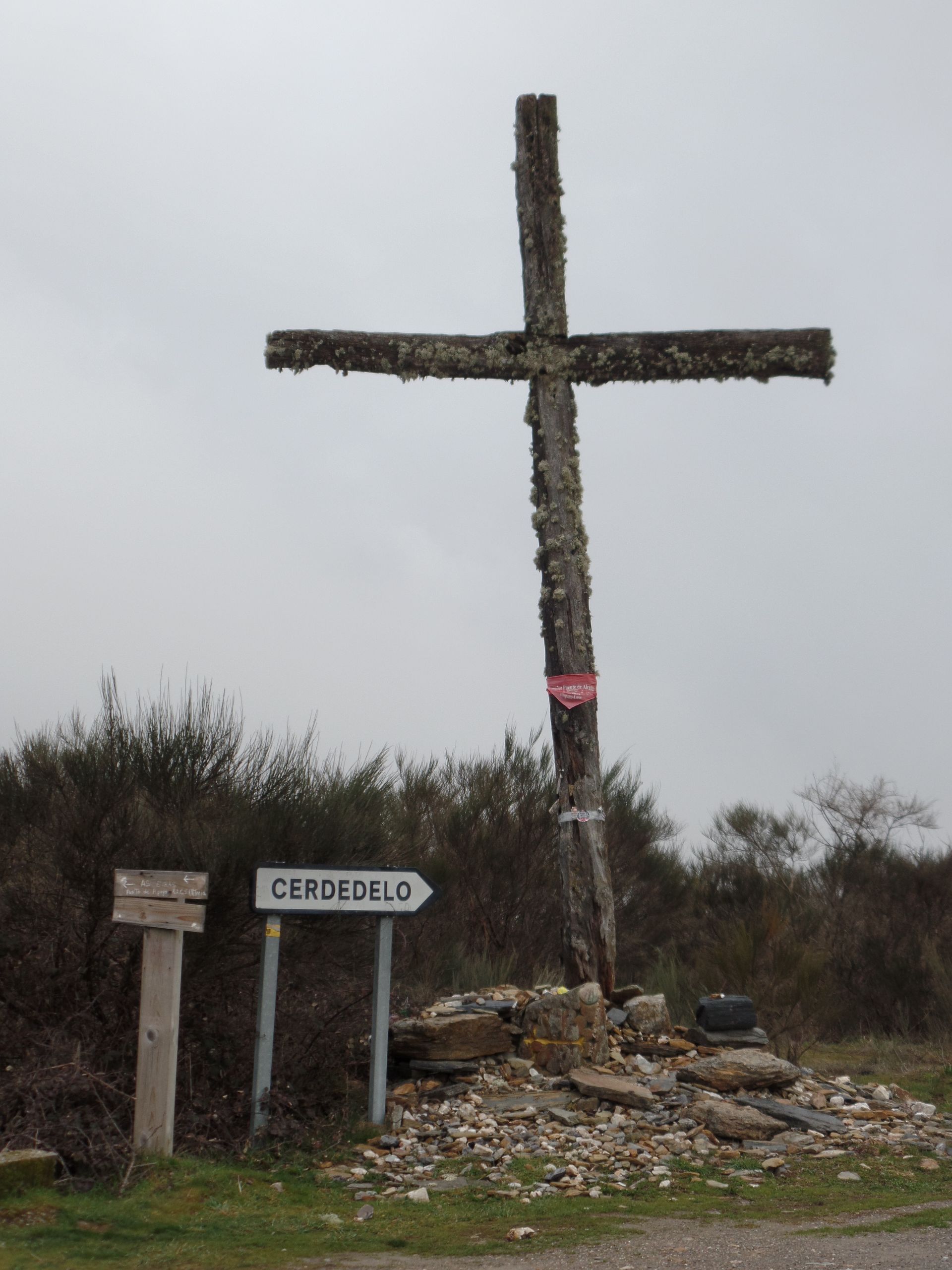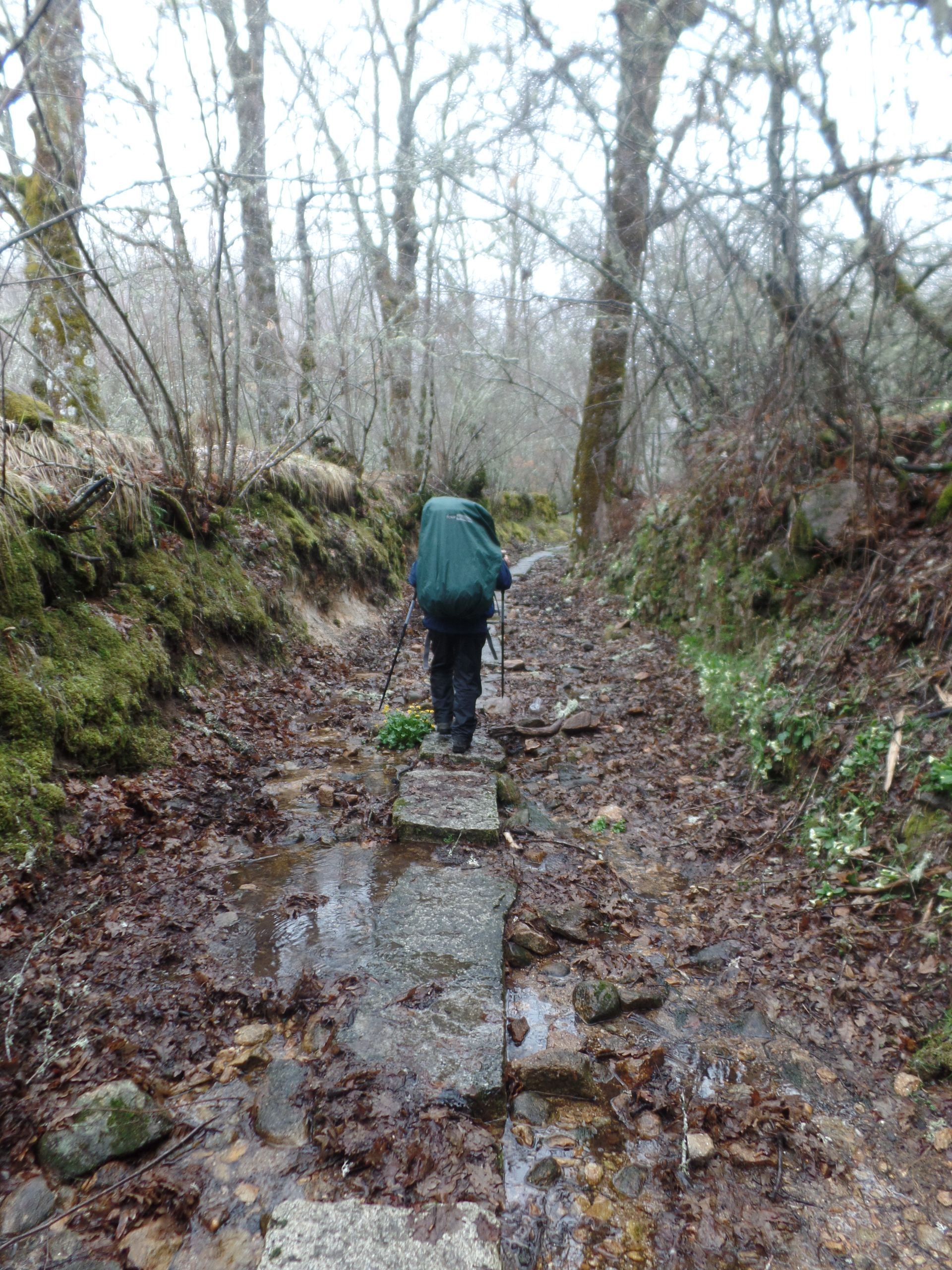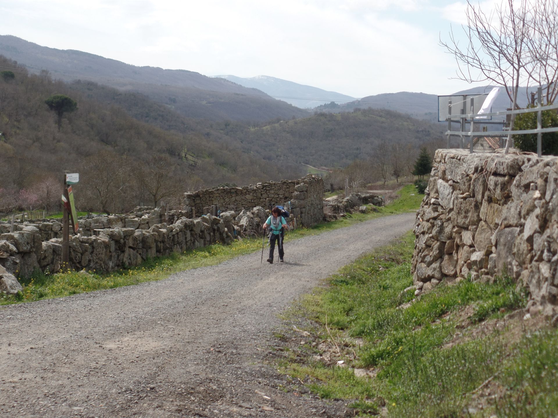 Der Weg führt durch eine wunderschöne Landschaft immerzu bergauf. In der Ferne, hinter den bewaldeten Hügeln, erheben sich im Osten die schneebedeckten Berge der Sierra de Gredos und im Westen die der Sierra de Francia. Wir kommen gut voran auf dem felsigen Untergrund. Zu unserer Rechten gurgelt tief unten im Tal der Rio Cuerpo de Hombres, was übersetzt Männerkörper heißt. Wie dieser Fluss wohl zu dem Namen gekommen sein mag? Eine halbe Stunde bevor wir Calzada de Béjar erreichen, wird der Weg sehr feucht, wir können aber hier auf eine kleine Asphaltstraße ausweichen. Uns kommt eine alte Frau entgegen und Florian, der vorausmarschiert, wird von ihr angesprochen. Auch wenn er sie nicht versteht, bleibt er doch stehen, hört ihr höflich zu und gibt zu verstehen, dass er kein Spanisch spricht. Die alte Frau wendet sich daraufhin an uns und erzählt, dass sie bei Jorge Eier holen will. Vor lauter Begeisterung über unseren jugendlichen Nachwuchspilger vergisst sie aber ihre Eier, kehrt wieder um und begleitet uns ein Stück. Dabei redet sie unaufhörlich auf Flo ein. Auf dem Camino Francés gibt es mittlerweile viele junge Pilger. Der Jakobsweg hat sich dort inzwischen streckenweise fast schon zur Partymeile entwickelt. Gerade die Gegenden um die größeren Städte, allen voran Pamplona, werden von jungen Leuten gerne angesteuert. Doch hier auf der Via da la Plata scheint es eher noch eine Seltenheit zu sein und einen 16jährigen wird man auf keinem der Wege sehr oft antreffen. Als der Weg auf die Passstraße trifft versichert sich die Seniorin, dass wir auch ja gegenüber in den Feldweg einbiegen. Der Abzweig ist zwar überdeutlich markiert, sie wartet aber, bis wir etwa 50 m weit gegangen sind. Dann geht sie auf der Passstraße bergauf weiter. Ihre Eier hat sie wohl endgültig vergessen.